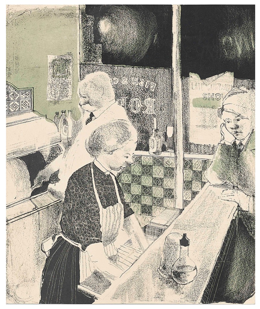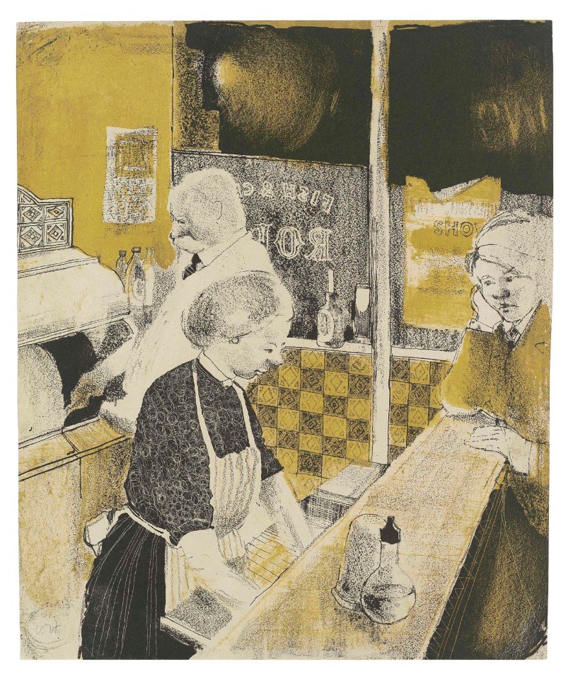 The present impression of Hockney’s Fish and Chip Shop was gifted by the artist to the proprietors of his local chippy The Sea Catch, Eccleshill, while Hockney was studying at the Bradford School of Art. This evocative work depicts the owners Hayden and Janet Smith behind the counter of their fish and chip shop, with Hockney leaning against the counter in conversation. Whilst studying at art school, Hockney would visit late in the evening for any fish and chips that were available and as a token of appreciation the artist presented the couple with the Fish and Chip Shop in 1954. The print was displayed in the shop above the fryers for many years and then passed down through the family of the original owners.