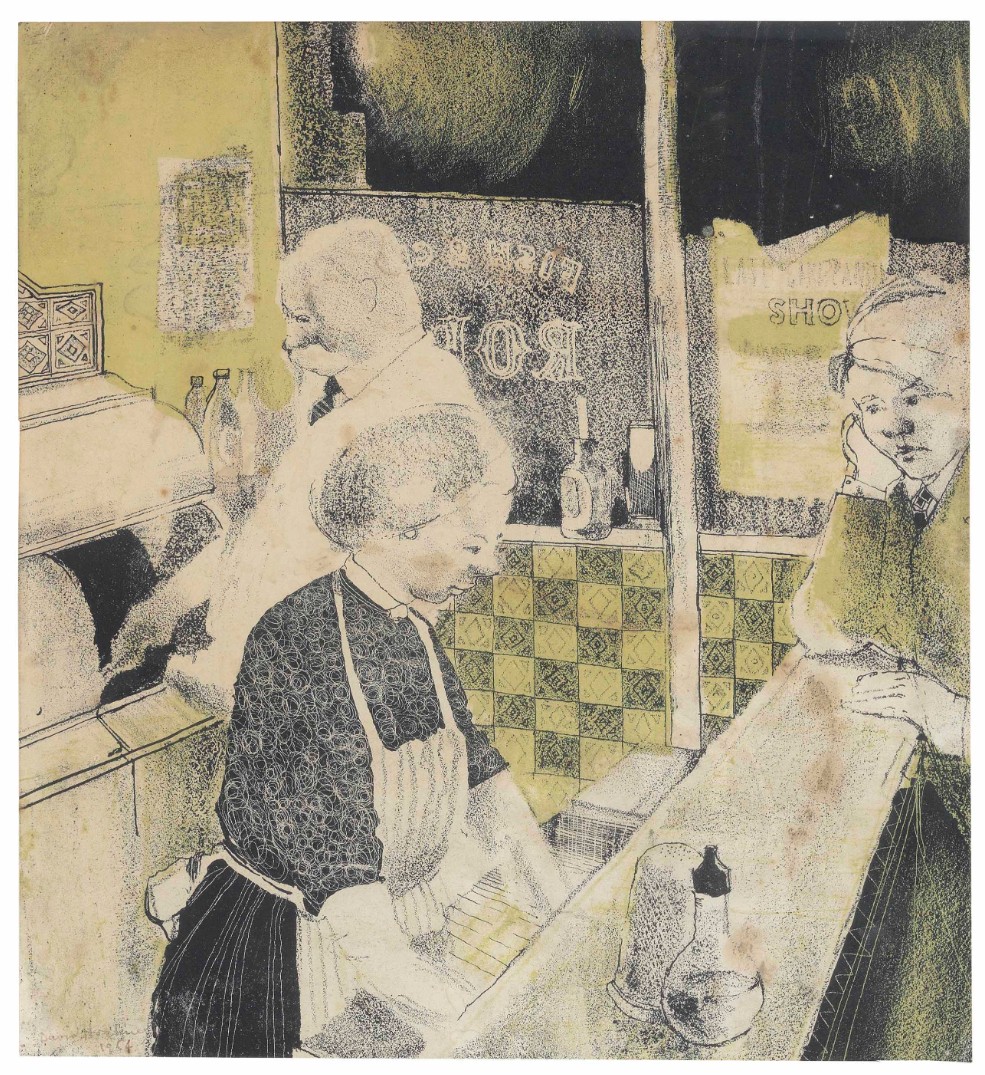 David Hockney’s Fish and Chip Shop (1954) was produced when Hockney was just 17 years old and studying at the Bradford School of Art. Offering a rare insight into the early stages of the artist’s career, the present lot portrays the owners Hayden and Janet Smith behind the counter of their fish and chip shop in Eccleshill, Bradford. Echoing Edward Hopper’s Nighthawks (1942), Hockney depicts himself in the far right leaning against the counter while observing the couple. The Smith’s shop was located just around the corner from where Hockney lived whilst at art school and he would visit regularly in the hope of securing some leftover fish and chips. As a gesture of his gratitude, the artist gifted the couple with one of the handful of Fish and Chip Shop prints he made. The proprietors proudly displayed it above the fryers until the establishment’s closure in 1970. This print provides a tender insight into the artist’s formative years and stands as one of the earliest and most rare prints produced by the artist.