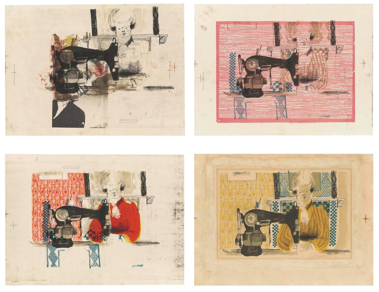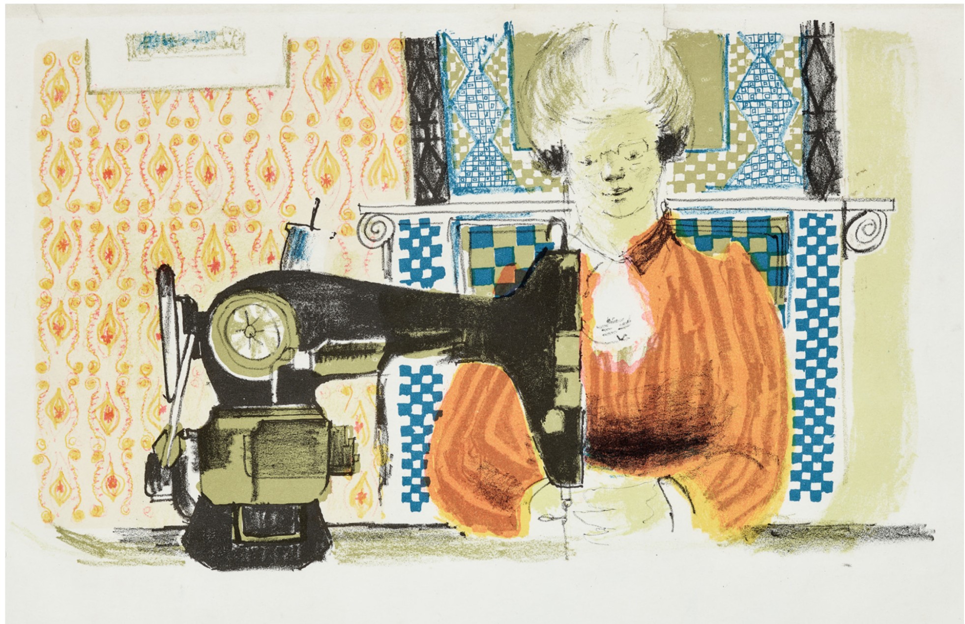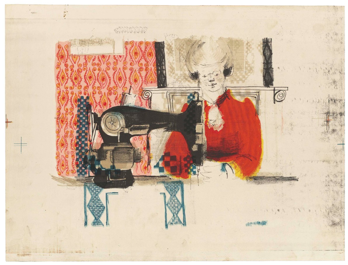 Woman with a Sewing Machine is one of Hockney’s earliest forays into the medium of lithography. It was completed soon after the artist enrolled at the Bradford School of Art in 1953 at age 16. Hockney was overjoyed to leave grammar school and enroll at the art college.