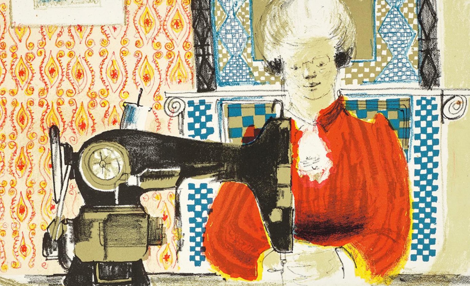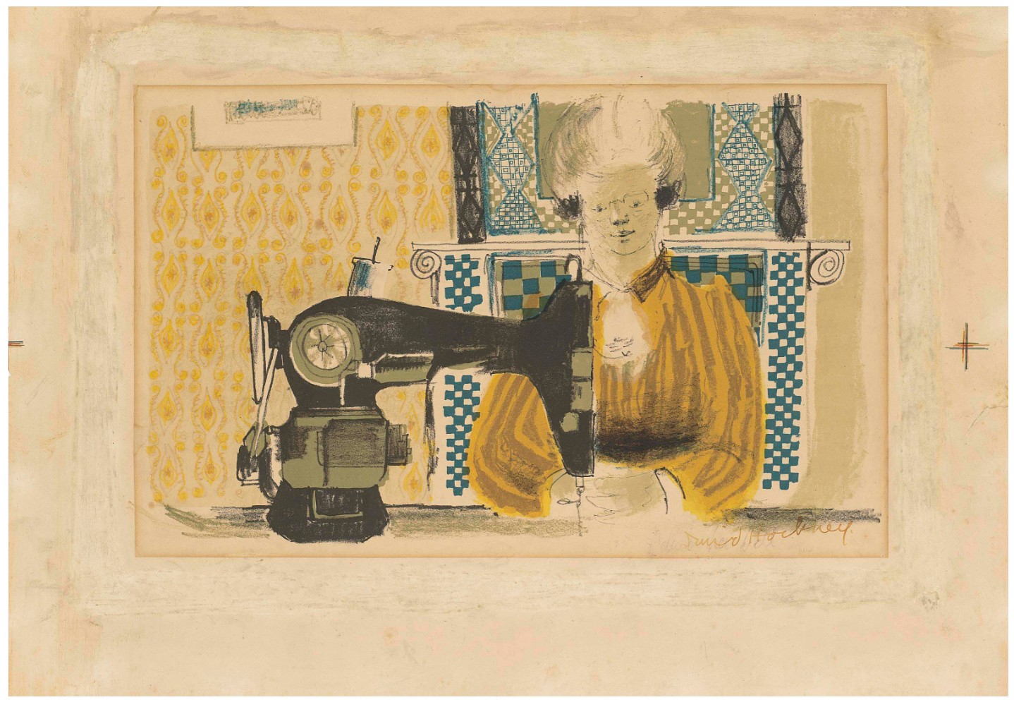 This print depicts Hockney’s mother, Laura, sat neatly before a large black sewing machine. She smiles contently and her gaze is directed outwards at the viewer. In the background, the vibrant hues of the fireplace and patterned wallpaper evoke their family living room. This personal, domestic interior bares close resemblance to Edouard Vuillard’s lithographs of his own mother, a seamstress, engaged in her craft amidst patterned domestic surroundings.