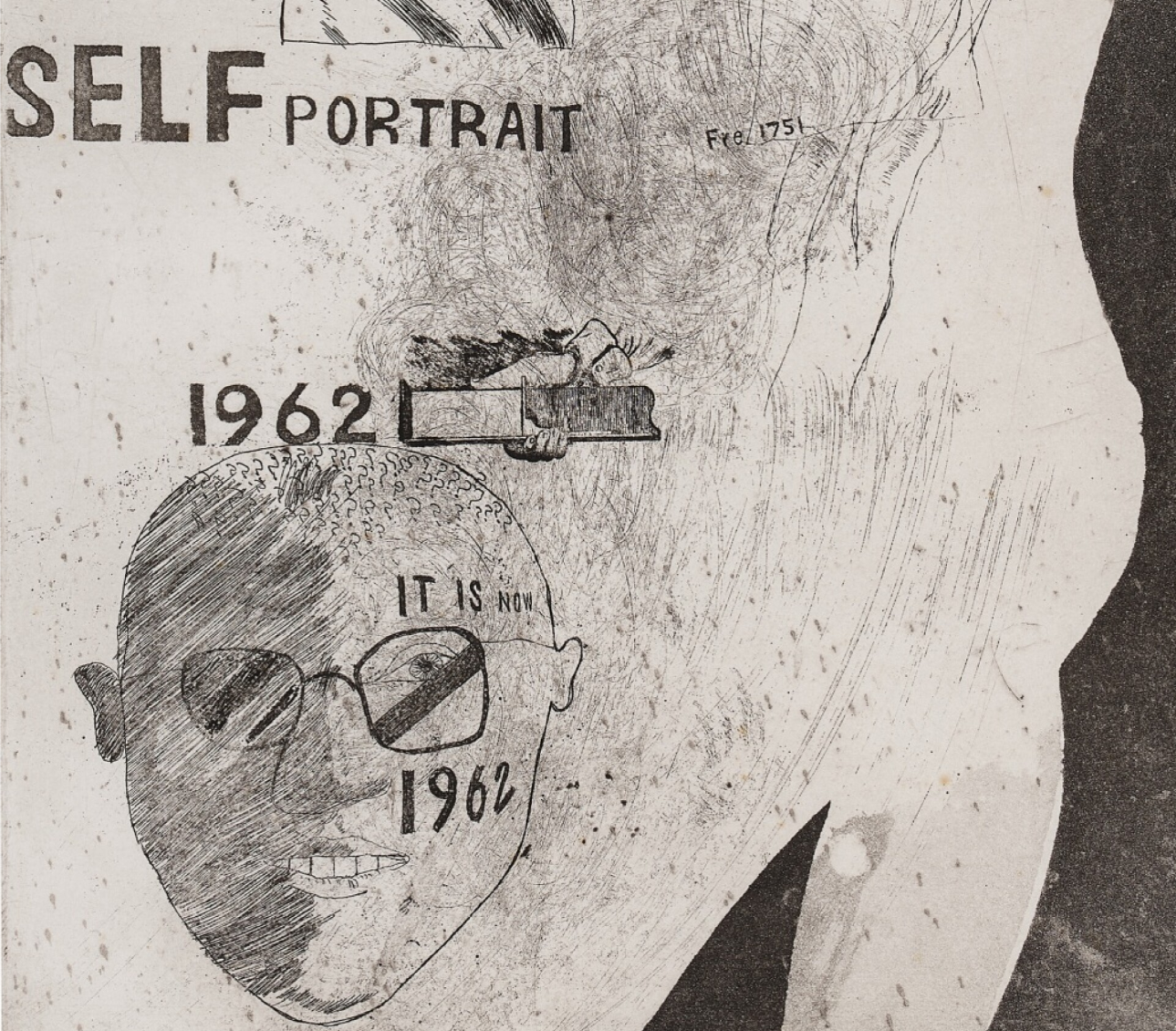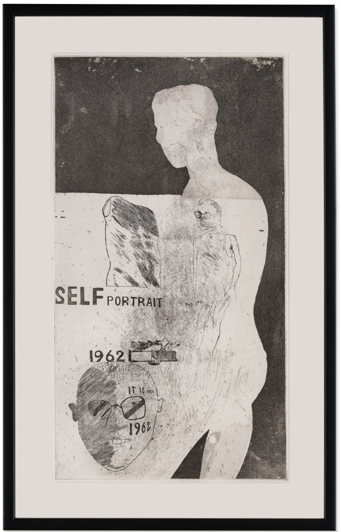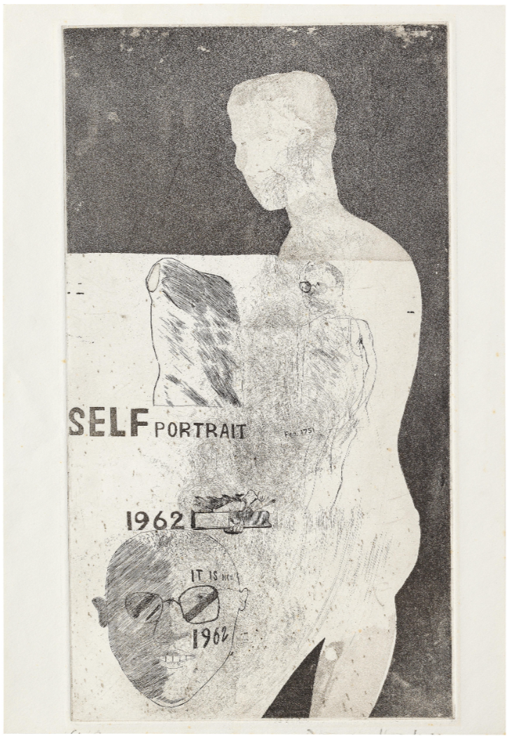 There are only three other known examples of this rare, early etching dating from 1962. One proof is currently located in the collection of the artist, and of the other two that have come up for sale, a second is now owned by the Tate Gallery, London. The artist made the work in his final year at the Royal College of Art in London. Entitled Self Portrait, the etching humorously dances around themes of erotic desire, the ‘real self’ vs. ‘the ideal self’ and Hockney’s interest at this time in his own sexuality.