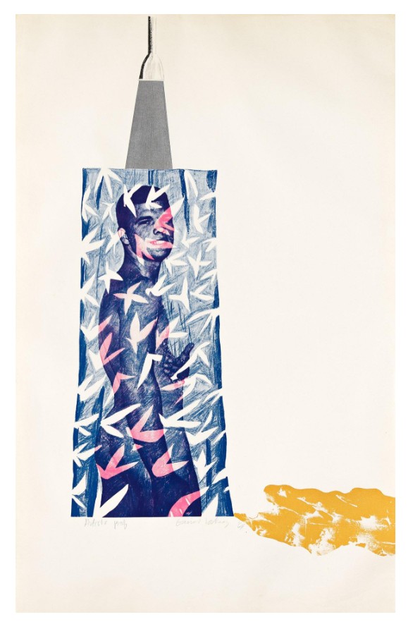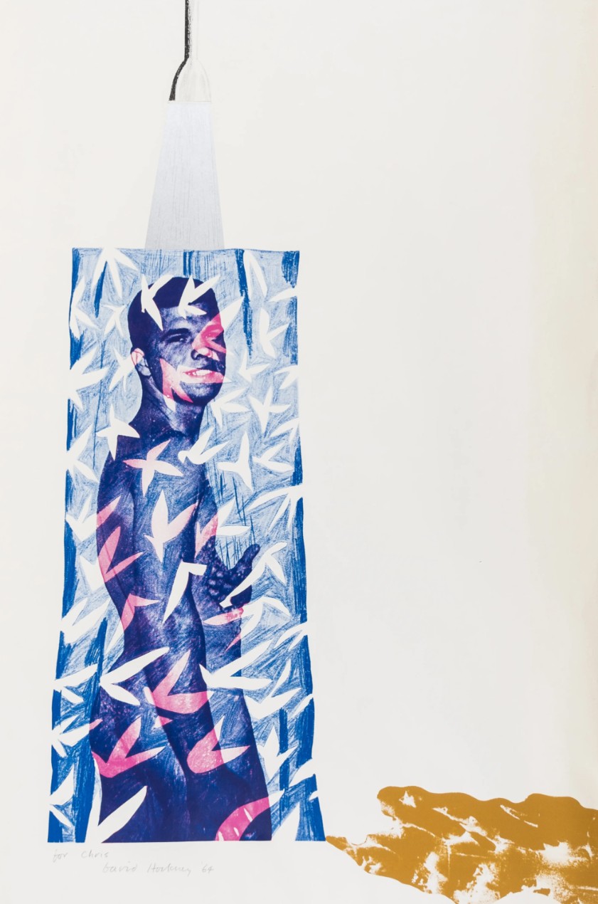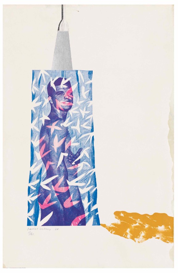 “This print of a naked youth behind a translucent shower curtain is based upon the photograph of a sixteen year old boy published in the American magazine, Physique Pictorial. As Hockney [born 1937] discovered, when he visited Los Angeles, the models used by the magazine were local boys, some of them just released from prison, who were persuaded to pose nude in pools and showers for a few dollars. The disparity between the classical ideal presented in the magazine and the real life circumstances of the models perhaps accounts for the ironic title of Hockney’s print.”