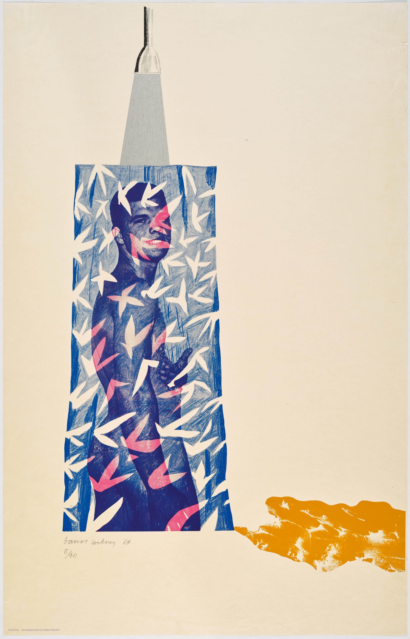 Cleanliness is Next to Godliness depicts a naked young man in a shower, seen through a patterned curtain, using bright colors influenced by David Hockney’s move to California. The work ironically uses the proverb to explore themes of sexuality, physical purity, and the candid beauty of the male form, sourcing the image from Physique Pictorial magazine, contrasting its idealized “beefcake” source with real, vulnerable intimacy, and marking a bold step in openly depicting gay life.