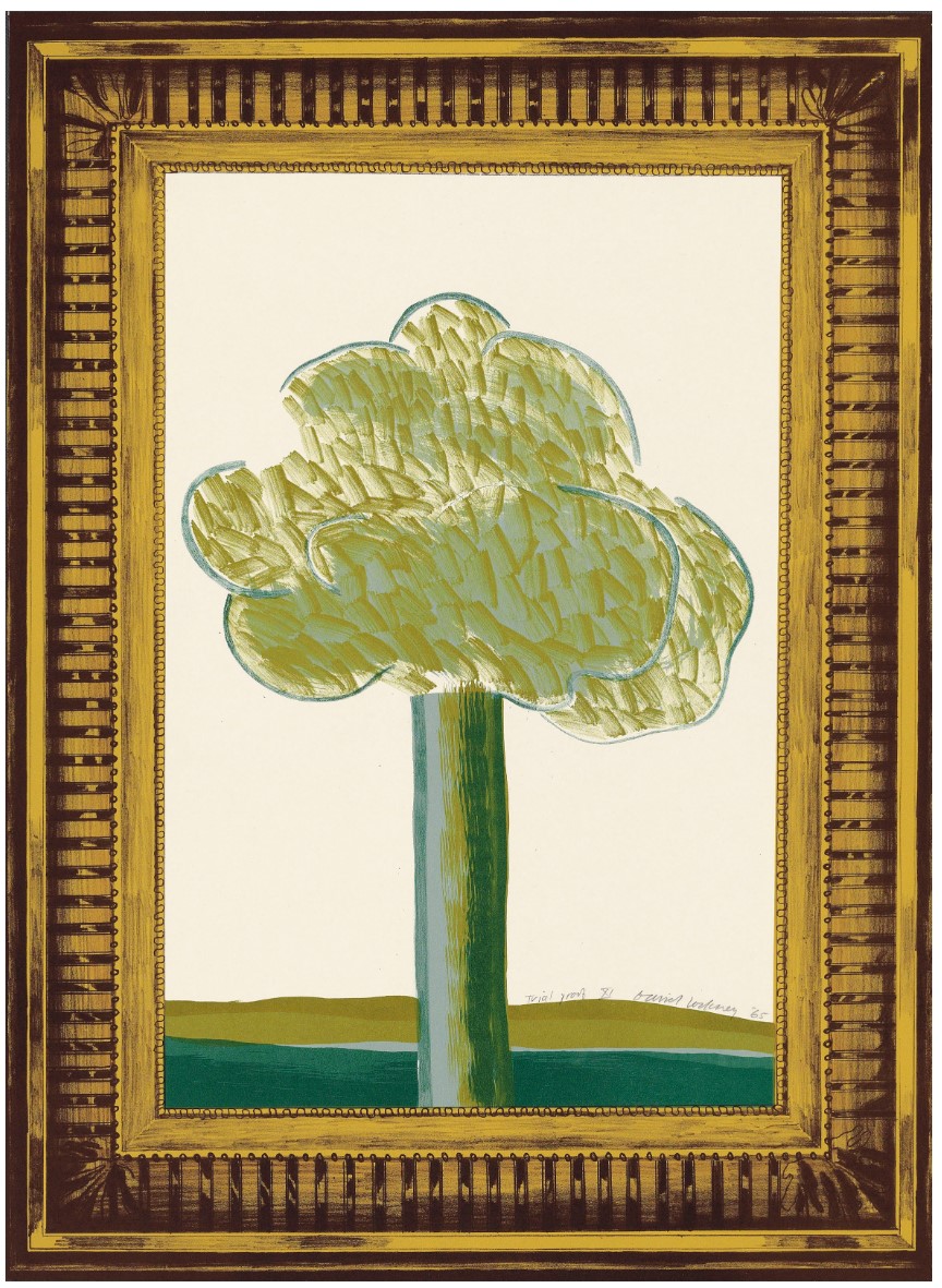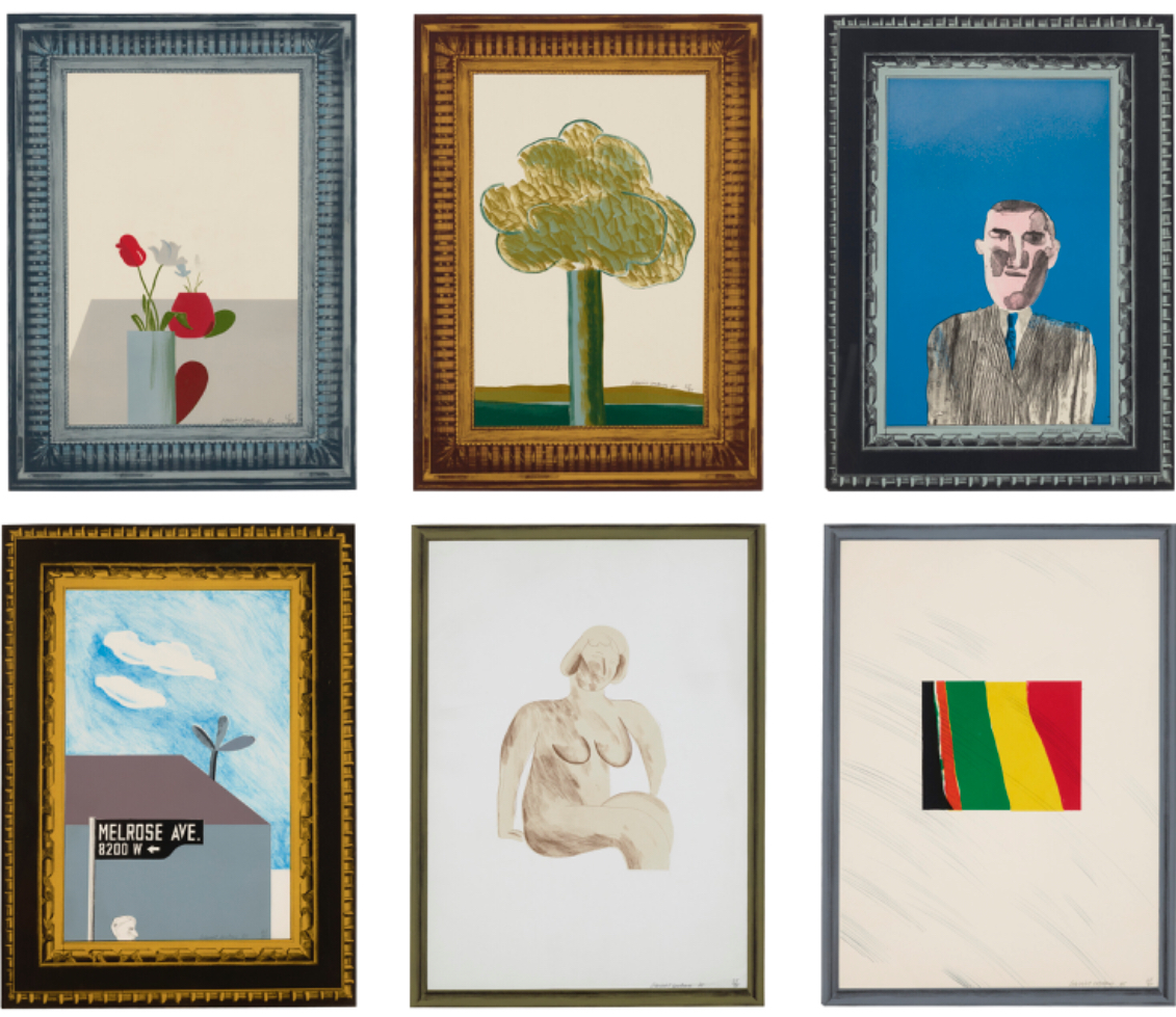 “It’s a kind of joke thing, a kind of home-made art collection with bits of everything in it, a nude, an abstract, a landscape and so on. I was working with a printer in Hollywood whose workshop was behind a framer’s. He had all these marvelous frames in the window. I got interested in this trompe l’oeil thing – a picture of a thing with something else within something else”