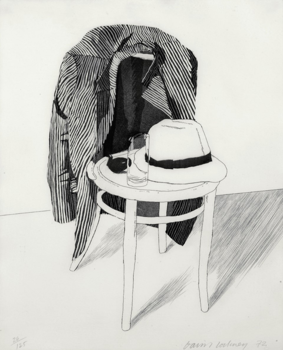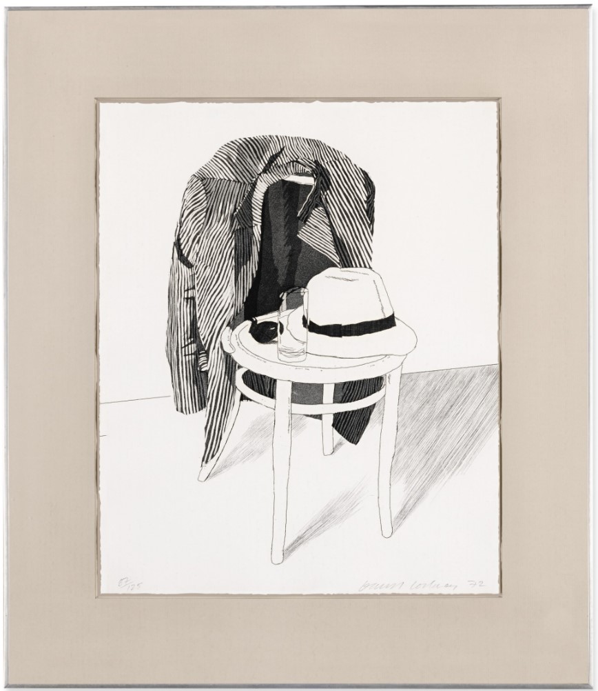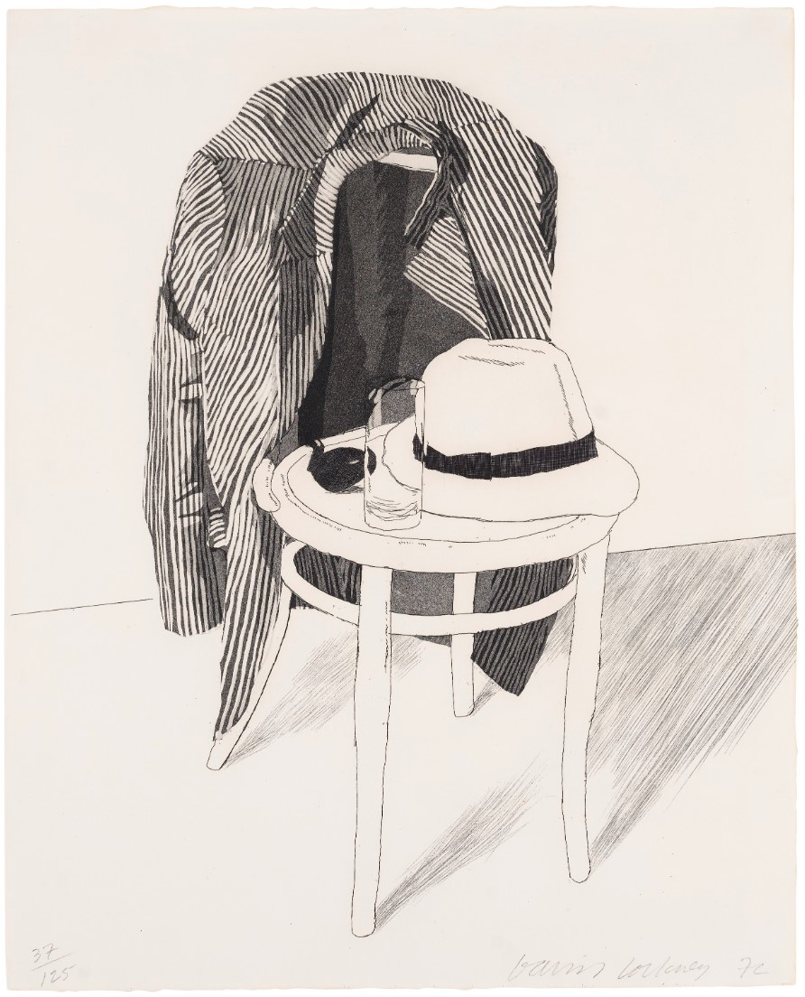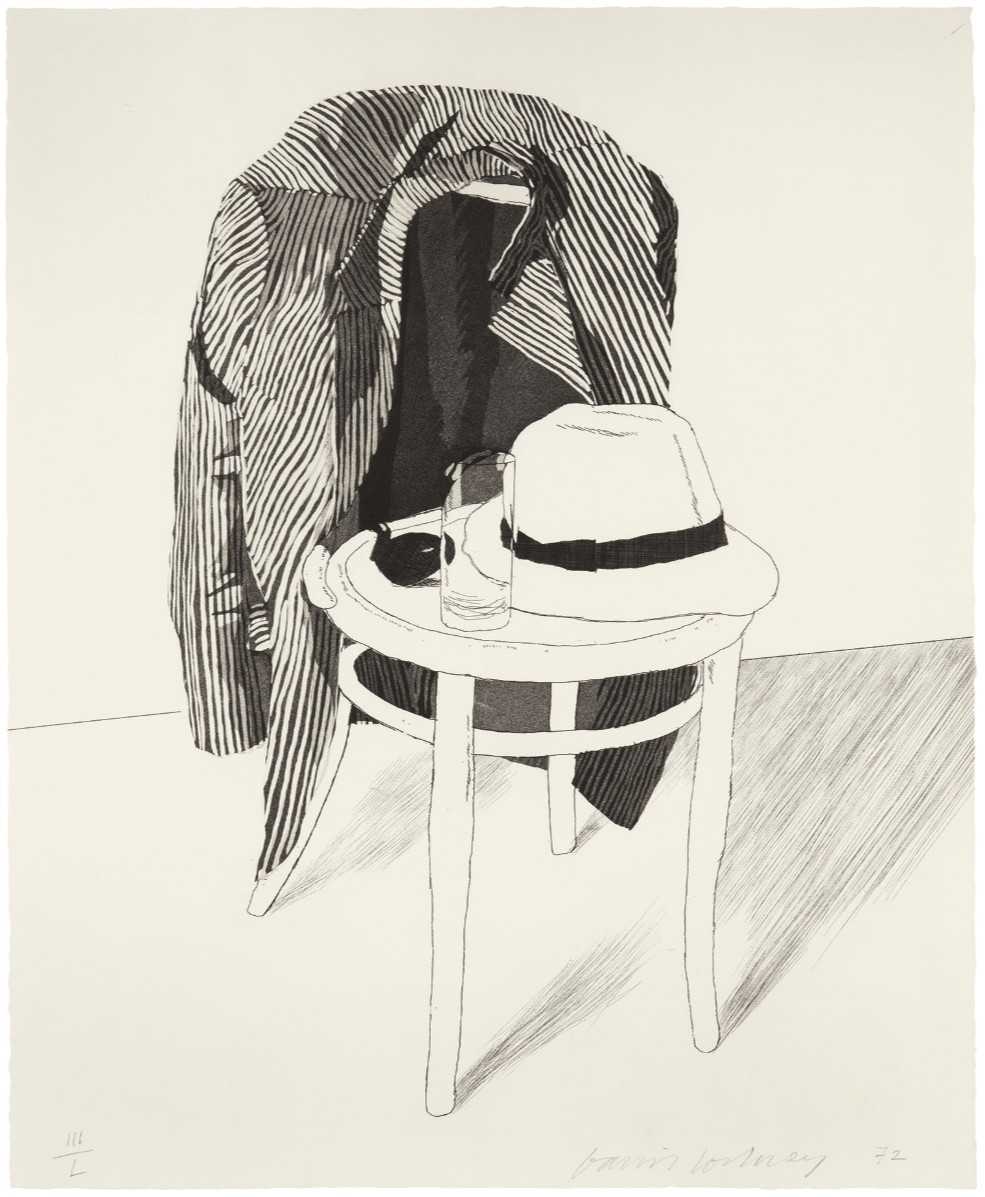 The print is simple in its composition, the chair and objects are placed against a white background, where depth is added solely through the addition of a shadow sketched gently on the right-hand side. As the chair, hat, pipe and glass are depicted with minimal texture, sketched mostly as empty shapes, this makes the jacket stand out within the composition. The dark, graphic texture of the stripes on the jacket not only adds texture and contrast within the rest of the print, but adds an extra layer of realism and depth. The simplistic, sketch-like style of this print echoes his other prints created in the early 1970s, such as French Shop, Rue de Seine and Flowers Made of Paper and Black Ink.