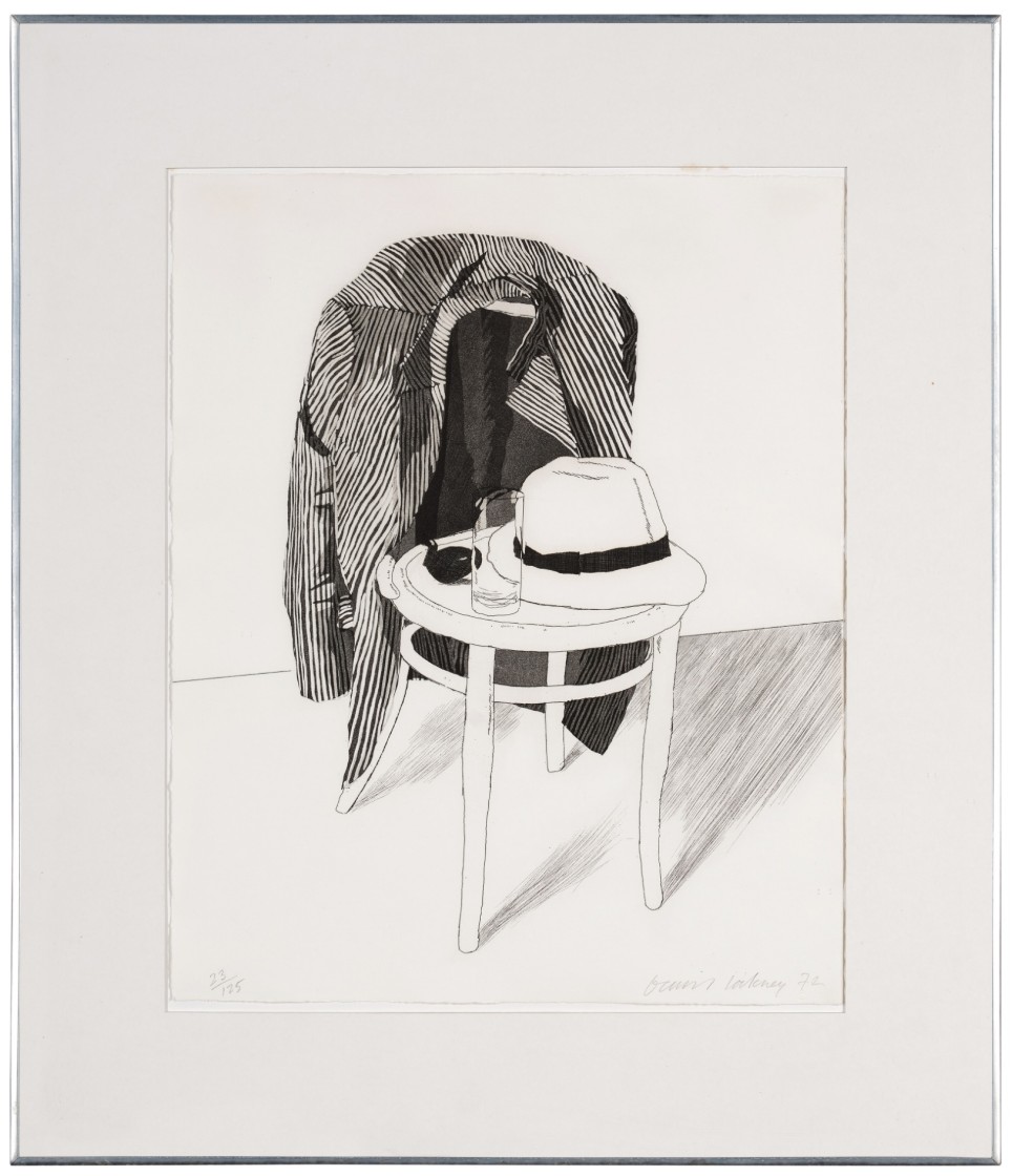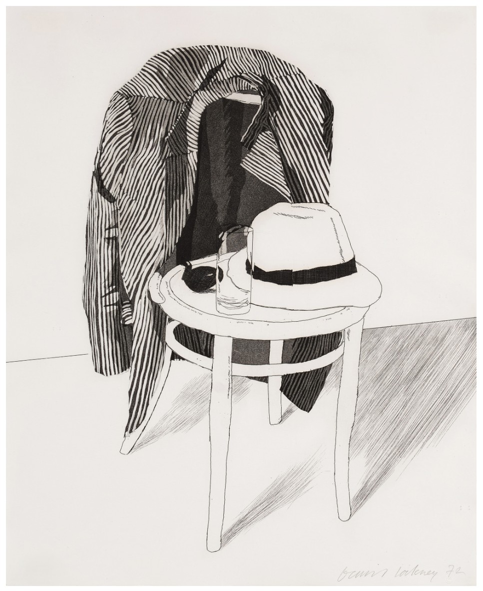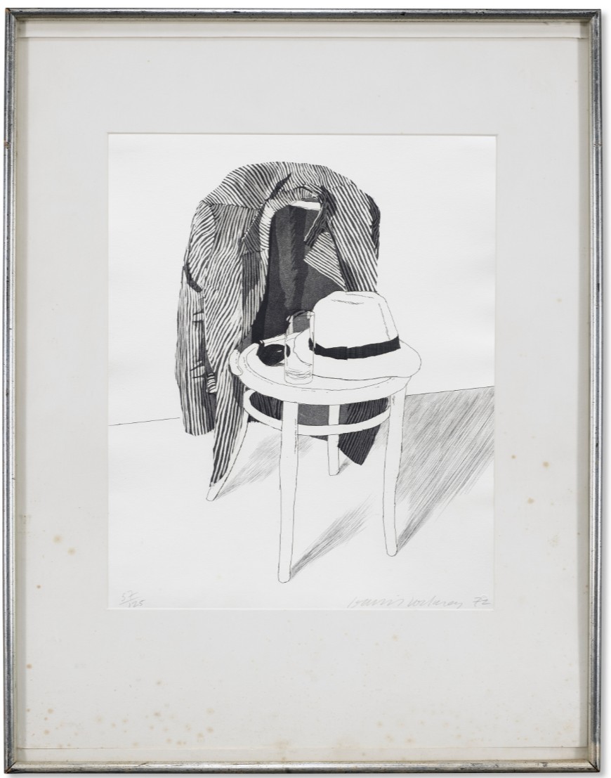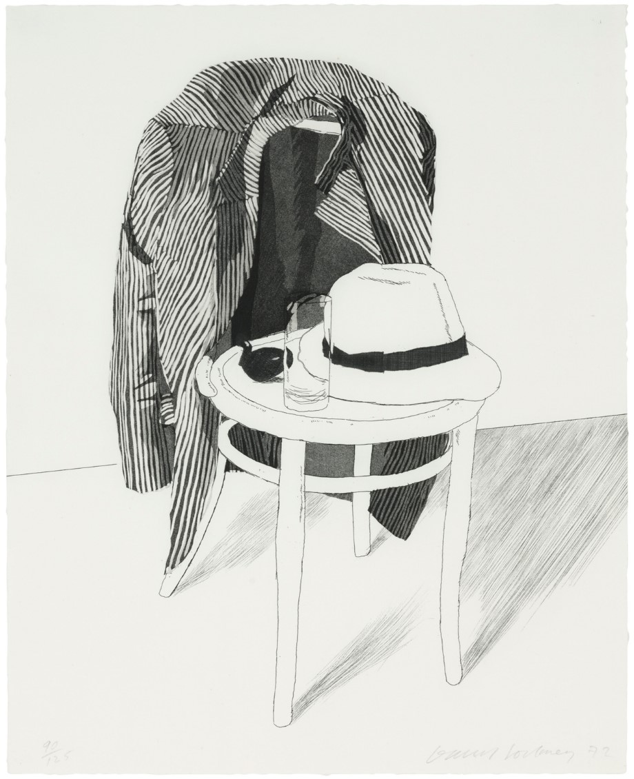 The print is simple in its composition, the chair and objects are placed against a white background, where depth is added solely through the addition of a shadow sketched gently on the right-hand side. As the chair, hat, pipe and glass are depicted with minimal texture, sketched mostly as empty shapes, this makes the jacket stand out within the composition. The dark, graphic texture of the stripes on the jacket not only adds texture and contrast within the rest of the print, but adds an extra layer of realism and depth. The simplistic, sketch-like style of this print echoes his other prints created in the early 1970s, such as French Shop, Rue de Seine and Flowers Made of Paper and Black Ink.