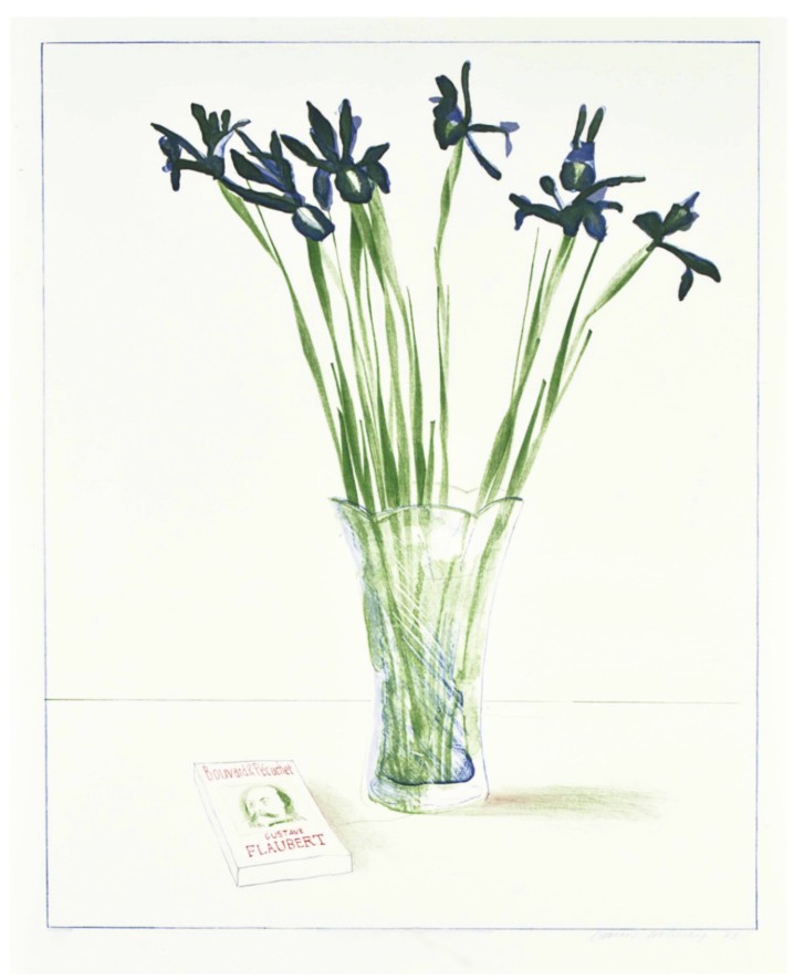 The image is a five-color lithograph print that produces a color pencil drawing effect. Subtle shading suggests light coming from the left. This image explores Hockney’s recurring themes: the still-life. Hockney used the still-life genre to explore light, optics, and representation. The irises and the vase and book create tension. The book highlights Hockney’s connection to art history and literature as well. Flaubert’s book adds characterization.