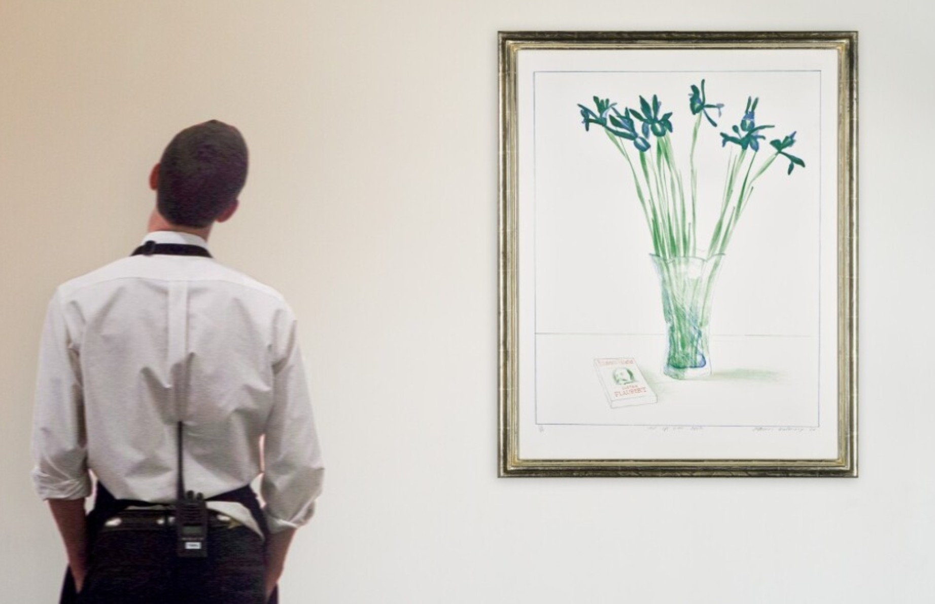 Still Life with Book features a vase of flowers next to a copy of Gustave Flaubert’s novel, Bouvard et Pécuchet. Its composition is simple: a bunch of blue irises sits in an Art Deco glass vase on a table, simply represented by a subtle line against a blank wall. Next to the vase is a copy of Bouvard et Pécuchet, with a man’s face visible on the cover.