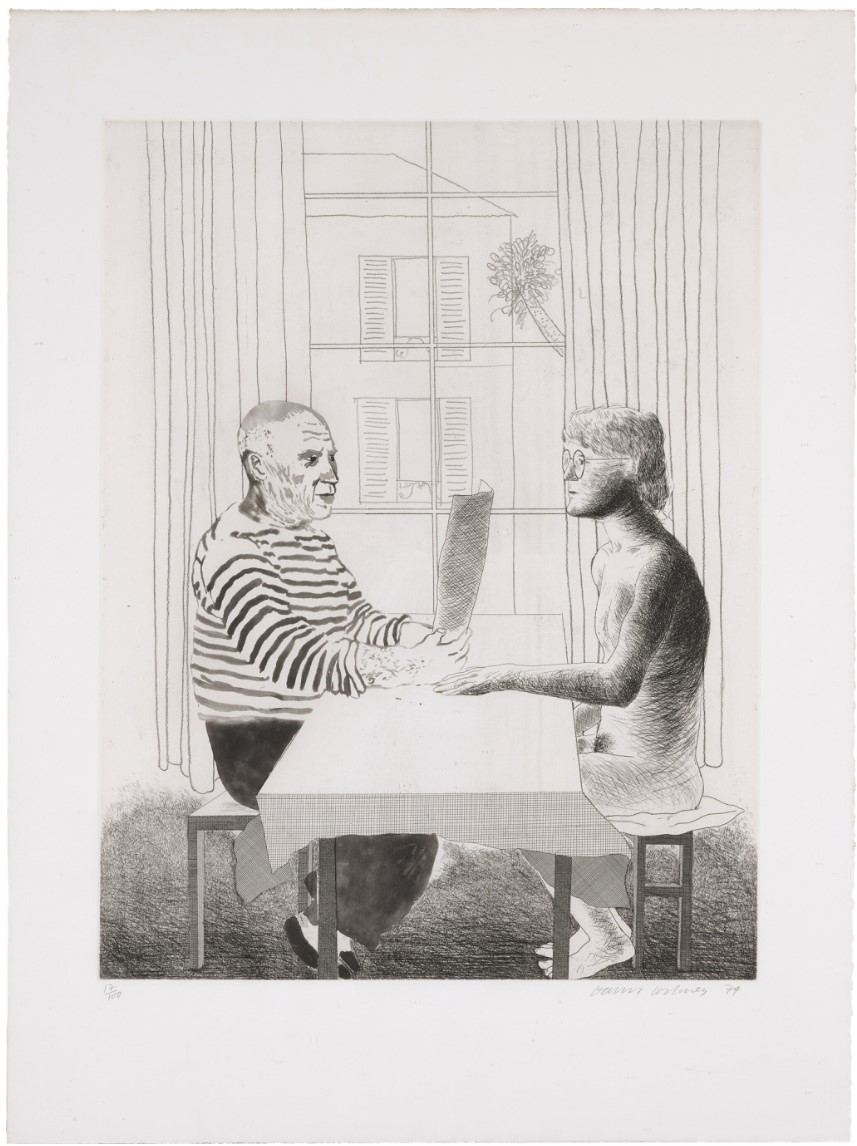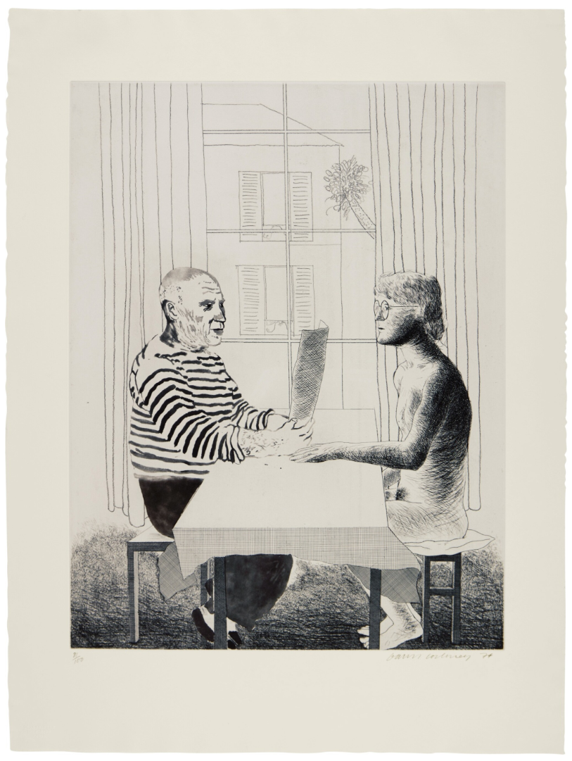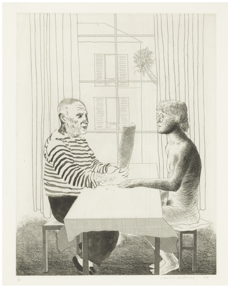 Following Picasso’s death in April 1973, Hockney made two etchings in the spirit of Picasso’s renowned Vollard Suite (1930−37). In the present one, Hockney depicts an imaginary meeting with the modern master, casting himself as the nude model and using different etching techniques to distinguish the two: for Picasso, the looser “sugar-lift” method—which involves brushing the figure directly on the plate with a sugar-based fluid—and a more densely hatched line for himself. Hockney had been taught the sugar-lift technique that year in Paris by Aldo Crommelynck, the master printer of Picasso’s later etchings.