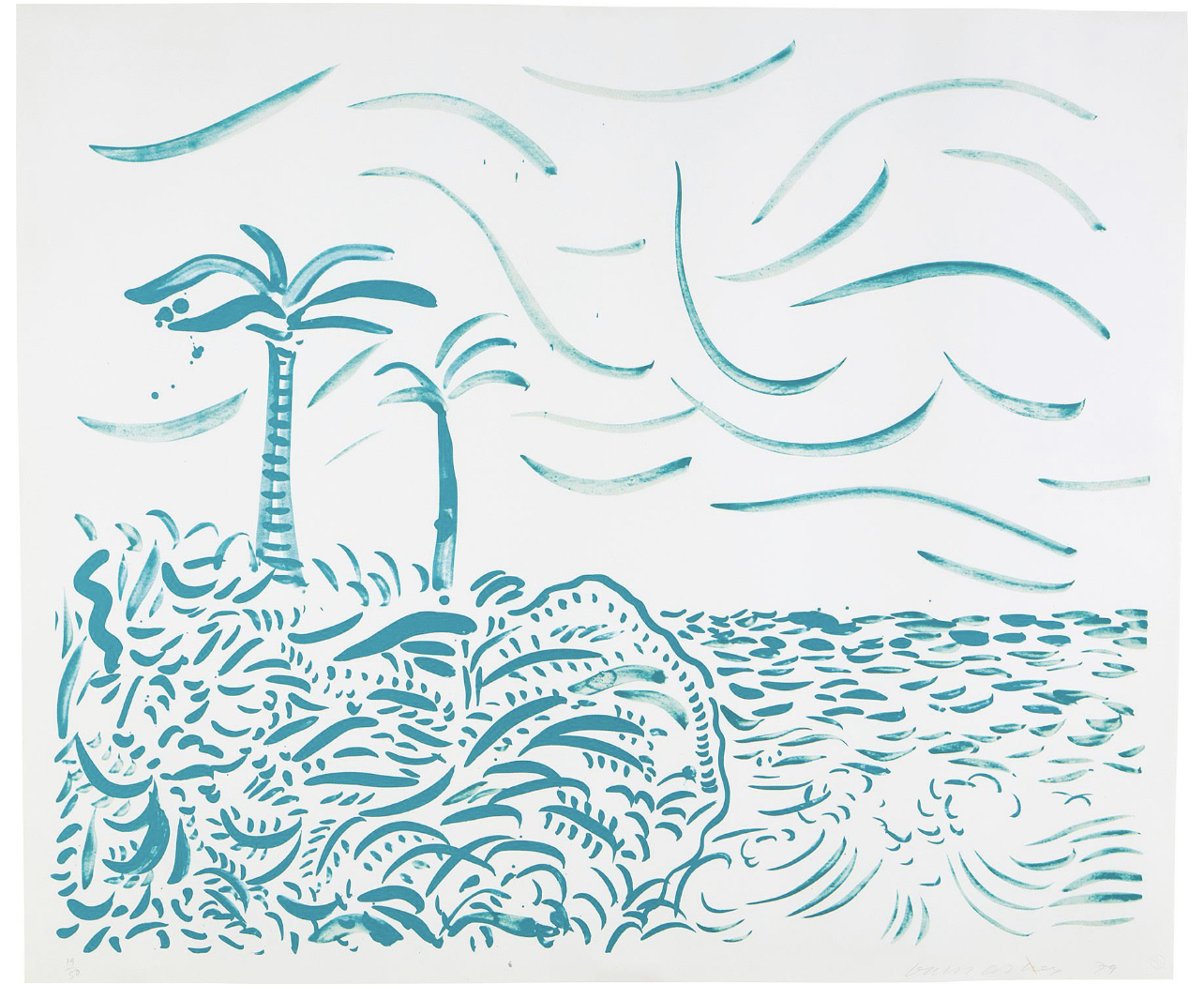 Bora Bora was created in 1979, a year after the artist moved to the Hollywood Hills. The light and ease of the Los Angeles lifestyle, which he had explored in his early work, can be felt in this work, which captures the swaying palm trees and lapping blue seas of the French Polynesian island in a few fluid strokes. Inky brushstrokes pick out the movement of clouds in the sky, the waves on the horizon and the lush vegetation of a tropical island. The marks are loose, almost Fauvist in style, recalling the work of Henri Matisse. Following the example of Toulouse Lautrec, who was one of the first artists to use lithography to mimic a painterly effect in print, Hockney adopted the method of drawing with a brush dipped in tusche (diluted lithographic ink) which allowed him to work more freely.
