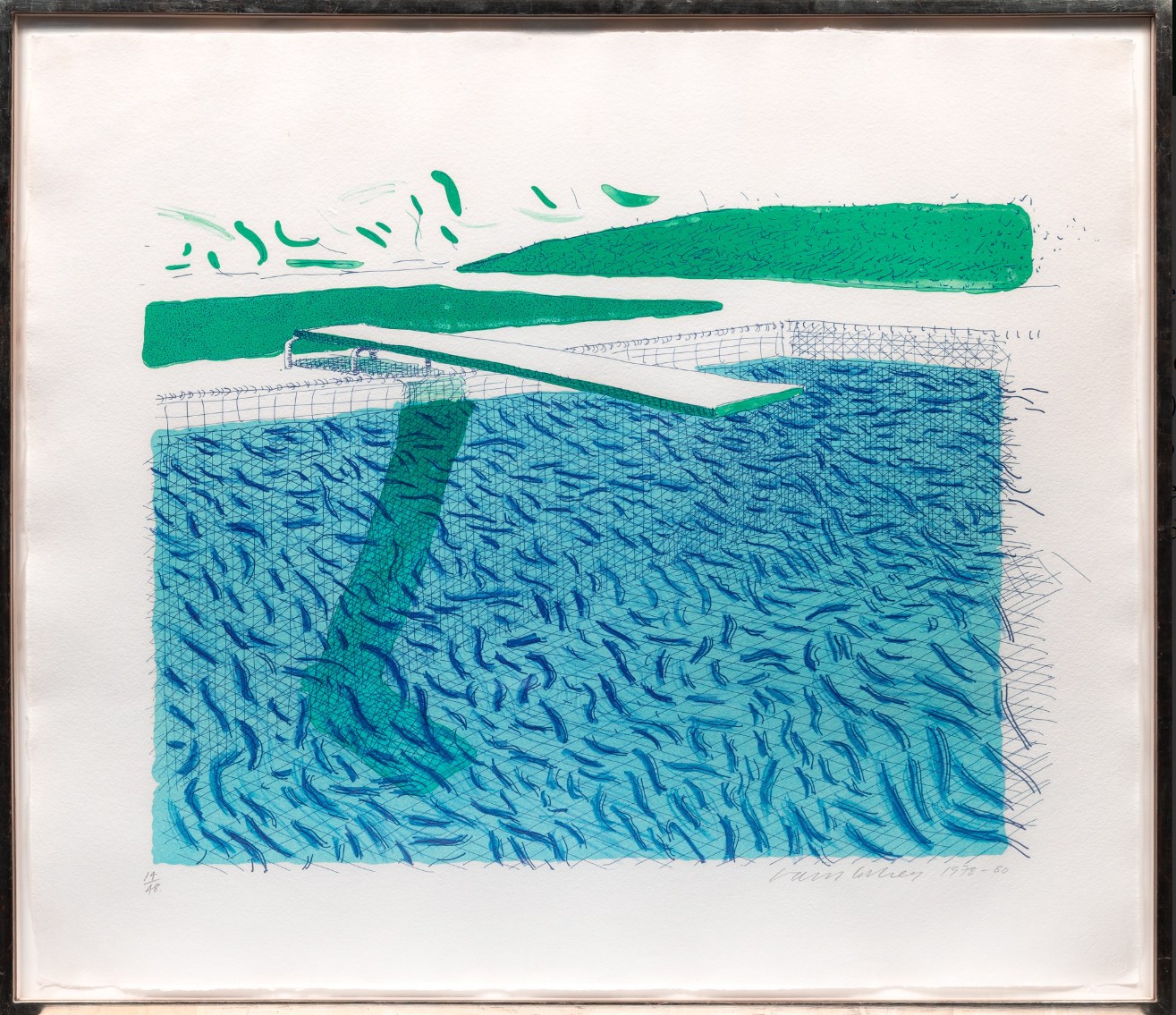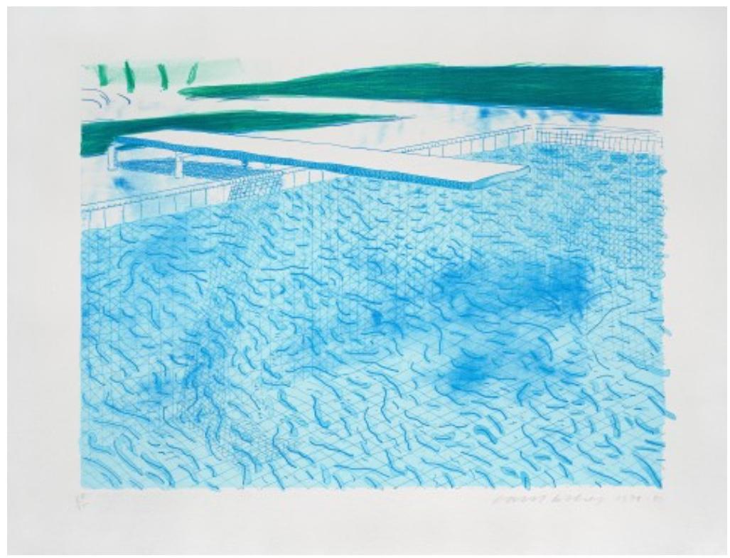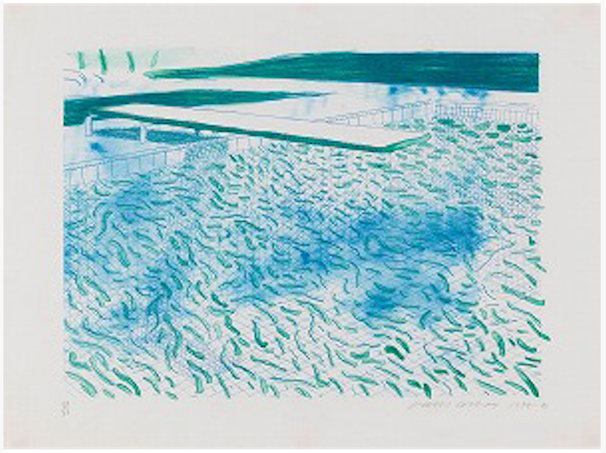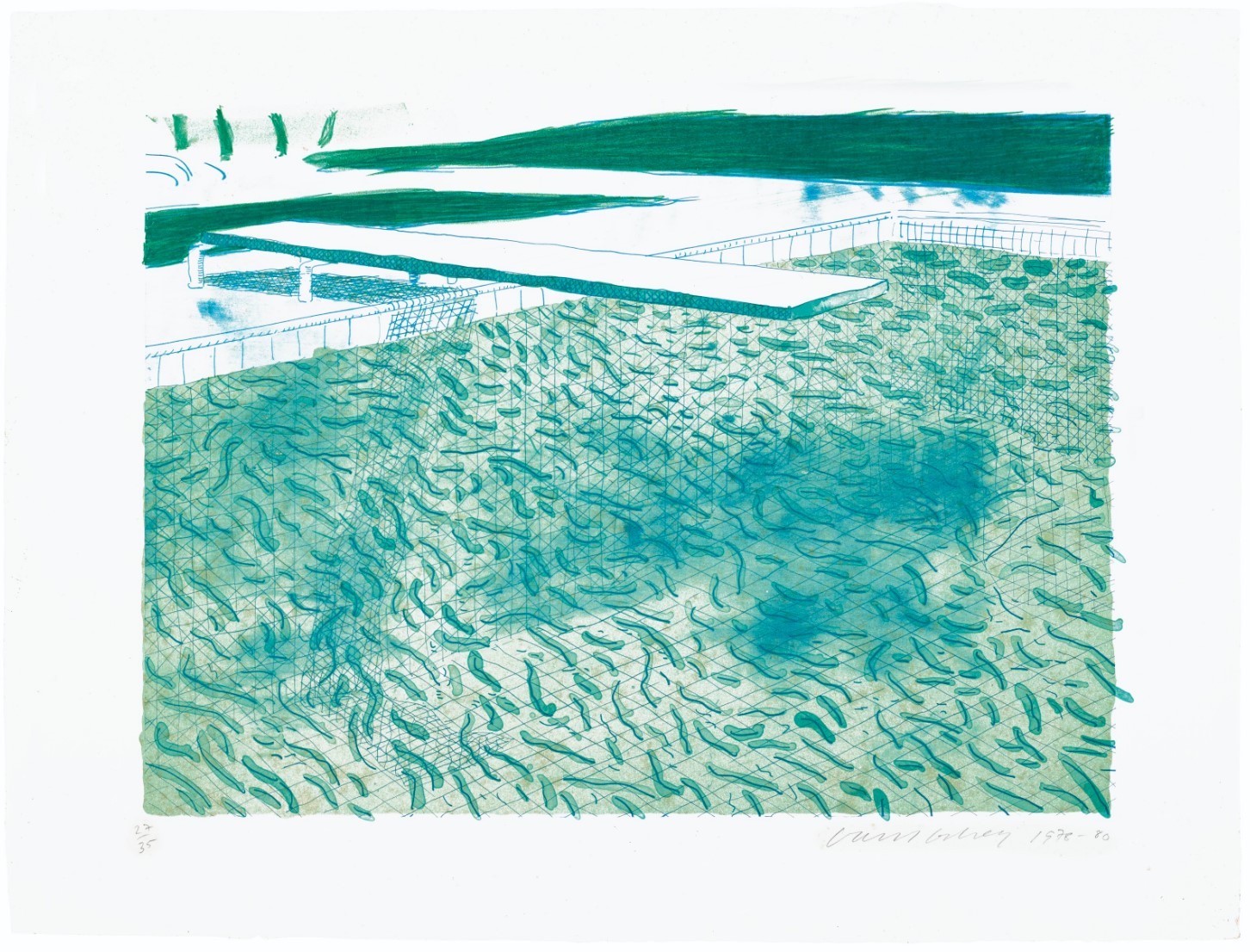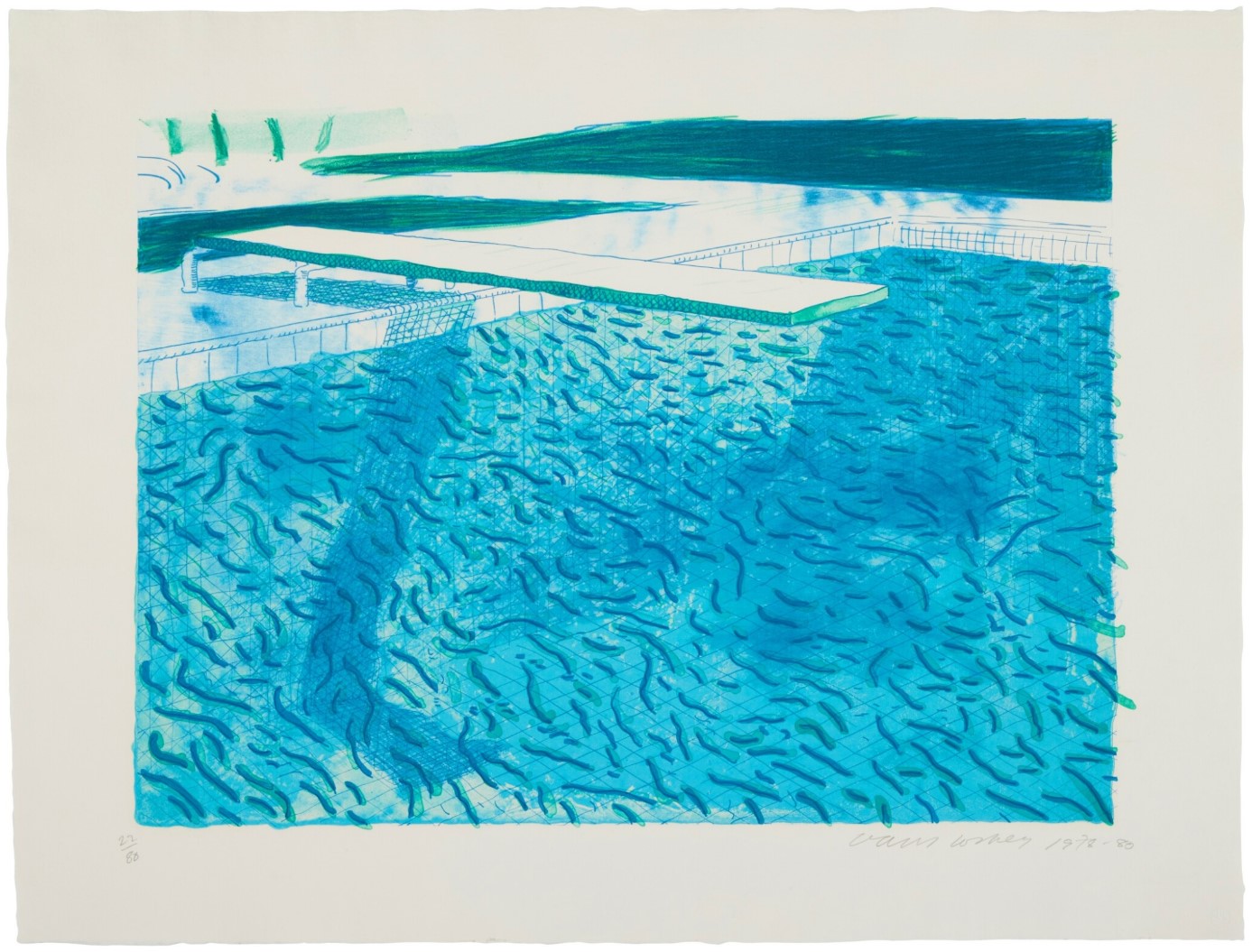The artist created a series of 11 lithographs of swimming pools with master printer Kenneth Tyler. Each print in the series has the same matrix of a diving board over the deep-end of the pool. As the series progresses, Hockney literally “fills the pool” with various lines and colors.