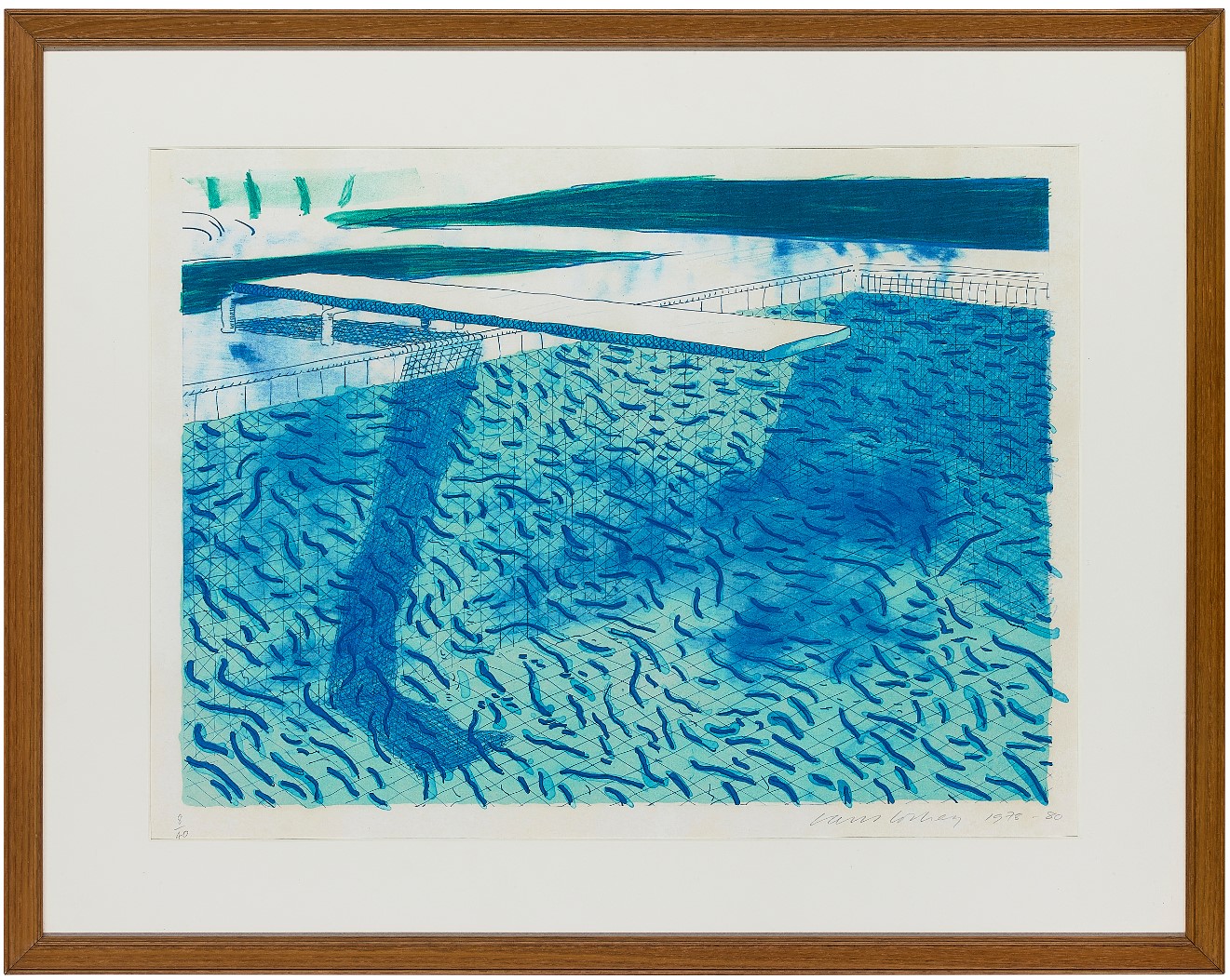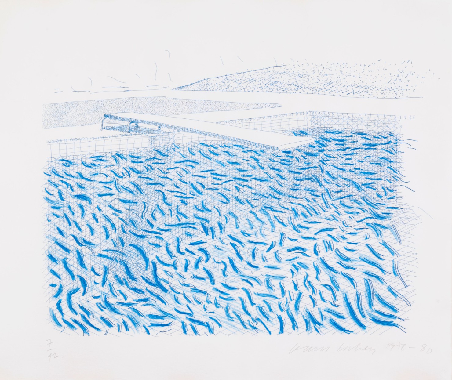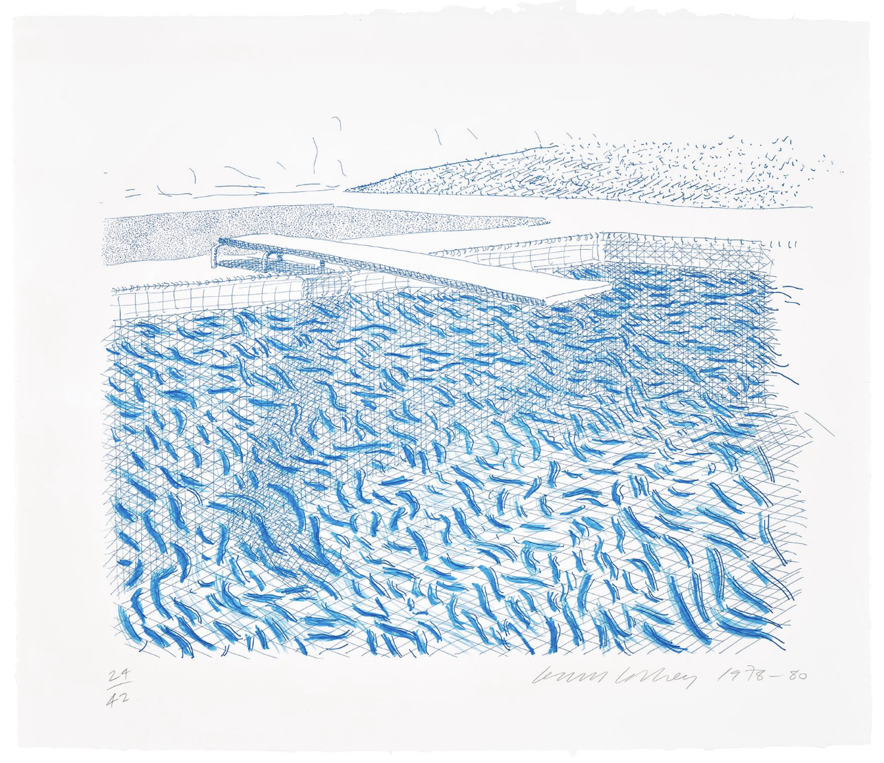 In 1964, David Hockney visited Los Angeles where he became entranced with the Southern Californian landscape, and in particular with swimming pools as unnatural waterscapes that underscored the hedonism and freedom that characterized life in California. In 1978, Hockney rented a home in the Hollywood Hills where he began a series of lithographs of swimming pools with master printer Kenneth Tyler. Each print in the series has the same matrix of a diving board over the deep-end of the pool. As the series progresses, Hockney literally “fills the pool” with various lines and colors.