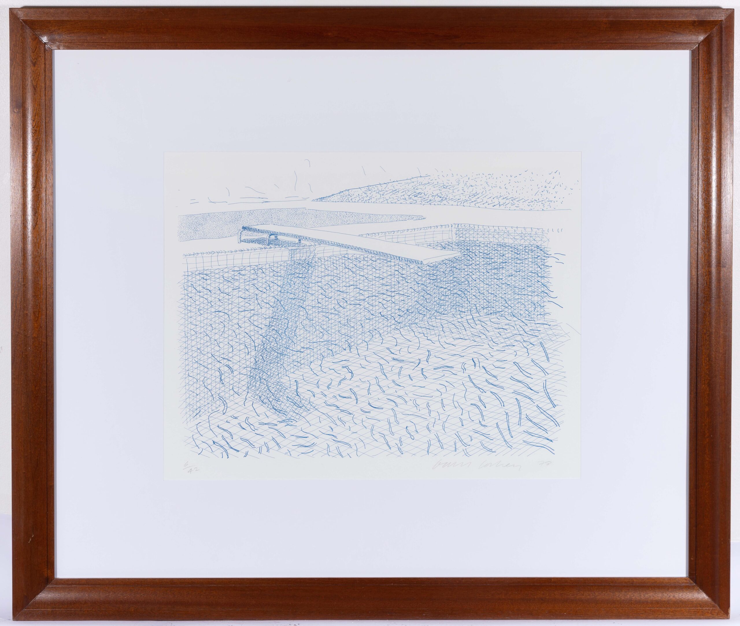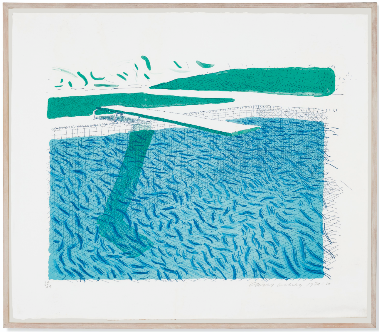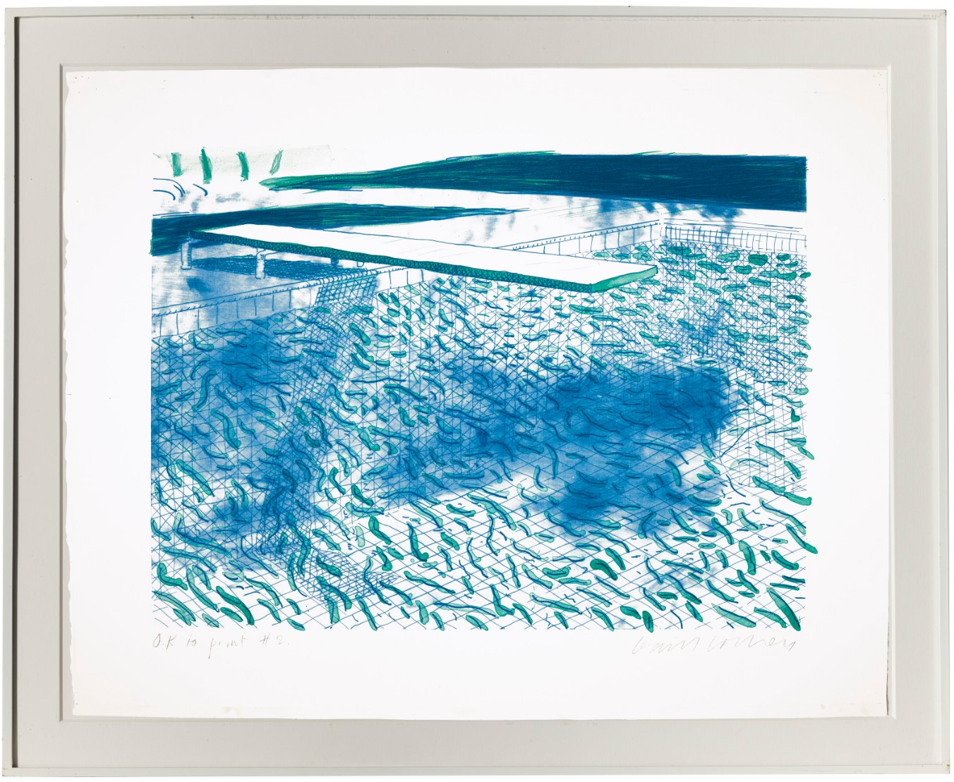 In 1964, David Hockney visited Los Angeles where he became entranced with the Southern Californian landscape, and in particular with swimming pools as unnatural waterscapes that underscored the hedonism and freedom that characterized life in California. In 1978, Hockney rented a home in the Hollywood Hills where he began a series of lithographs of swimming pools with master printer Kenneth Tyler. Each print in the series has the same matrix of a diving board over the deep-end of the pool. As the series progresses, Hockney literally “fills the pool” with various lines and colors.