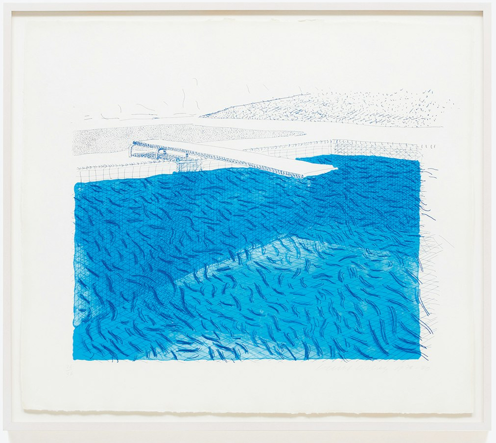 The concern of depicting water has occupied artists throughout history. Lithographic Water Made of Lines along with Pool Made with Paper Blue Blue Ink for Book, from Paper Pools. mark two stages in Hockney’s experimentations regarding the matter. Lithographic Water Made of Lines is one of eleven editions of lithographic prints that Hockney created of the same scene between 1978 and 1980. Using a single aluminum plate, Hockney demonstrates the diversity of line, creating depth, shadow, and variations in tone to produce the transparent effect of water. While other editions in this series use various washes to capture the everchanging light conditions, this example focuses solely on depicting the water’s characteristics. The graphic marks utilized in Lithographic Water Made of Lines continued to inform Hockney’s approach to depicting water and are again visible in Pool Made with Paper Blue Blue Ink for Book, from Paper Pools. The dynamic blue gestures evoke the water’s constant movement and are reminiscent of the bold arcs that Hockney had painted on the bottom of his own backyard pool by 1978.