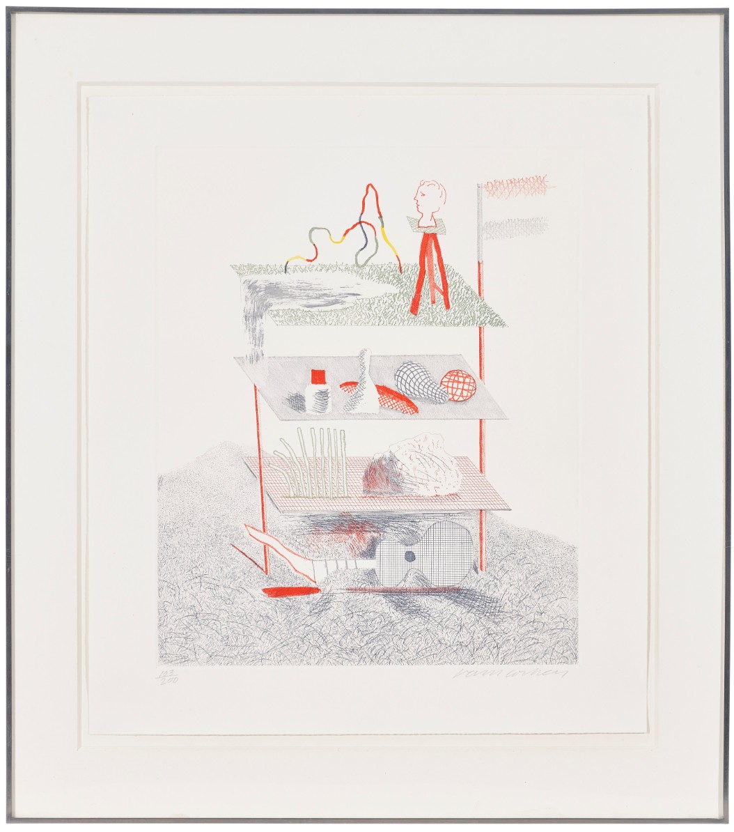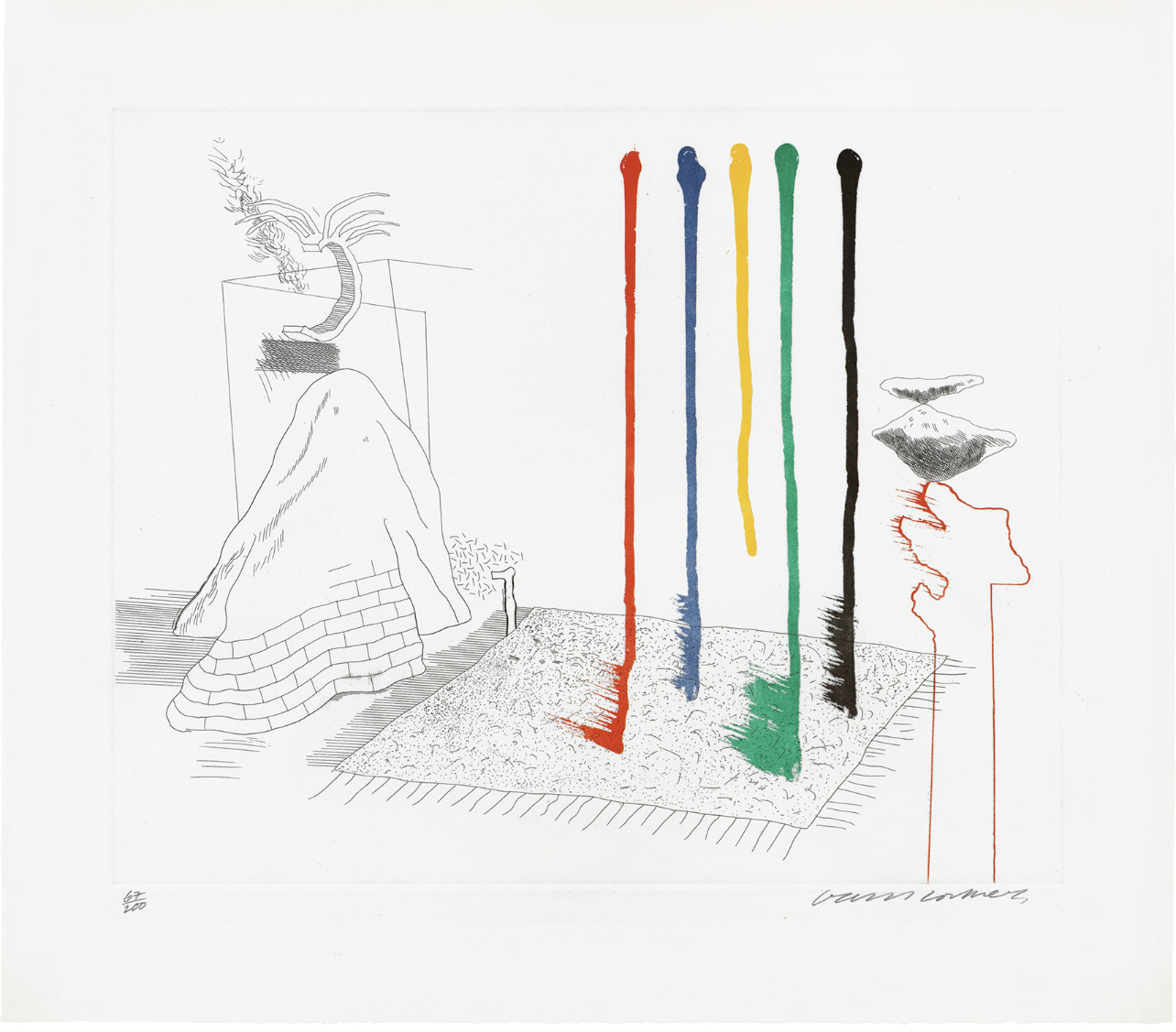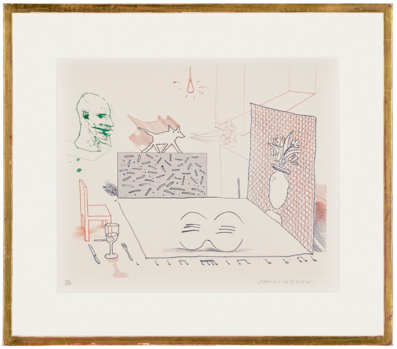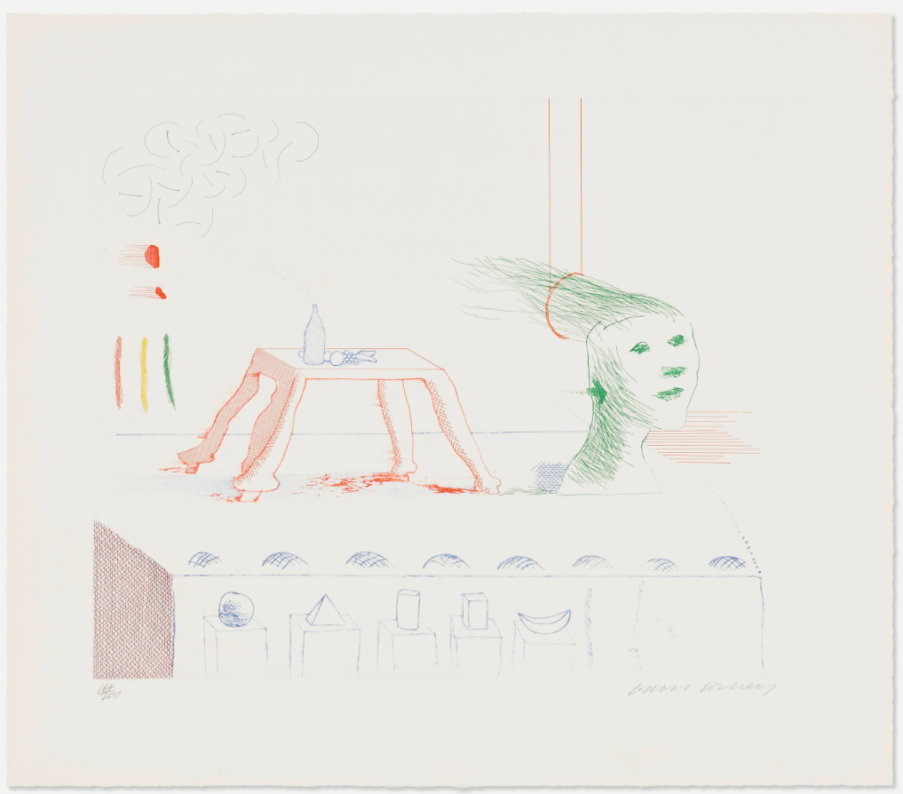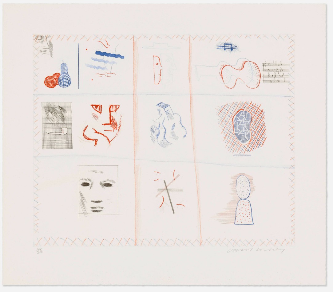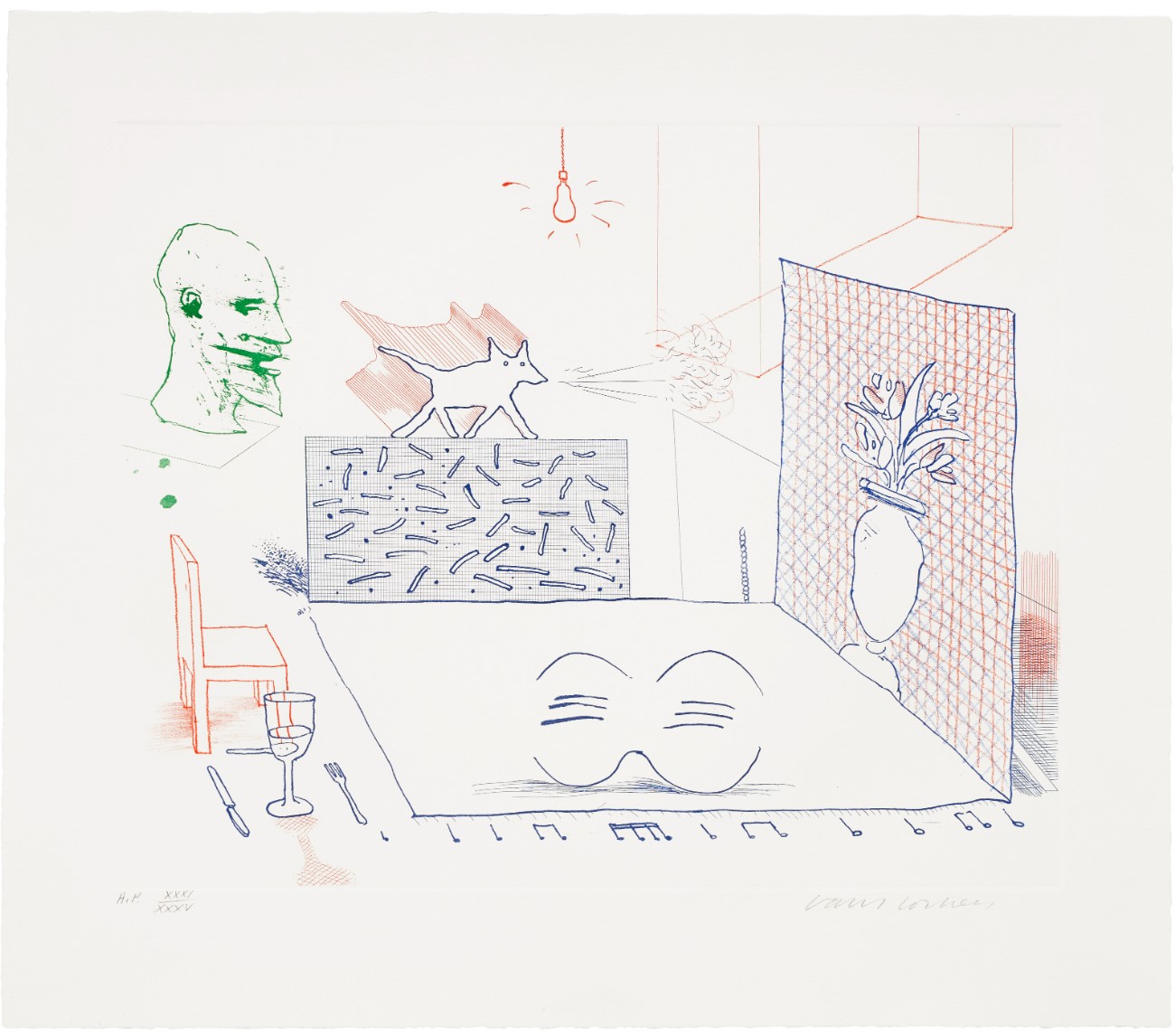 Individual plates are populated with a multitude of references to Picasso’s work including imagery of guitars, still lives, stage sets and distorted perspectives. Figures with Still Life recreates a Cubist scene and echoes Hockney’s earlier etched homage to Picasso, Artist and Model, 1973-74 in which he sits opposite and in visual dialogue with his venerated predecessor. But the final plate, What is this Picasso? provides the most overt reference to Picasso, including his 1937 Portrait of Dora Maar, his muse and lover. The layers of influence continue in perpetuity: Etchings by David Hockney, who was inspired by Wallace Stevens, who was inspired by Pablo Picasso, who was inspired by Dora Maar? Afterall, as Hockney says, “good artists don’t borrow, they steal”.