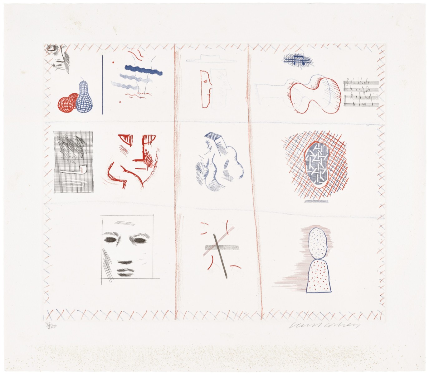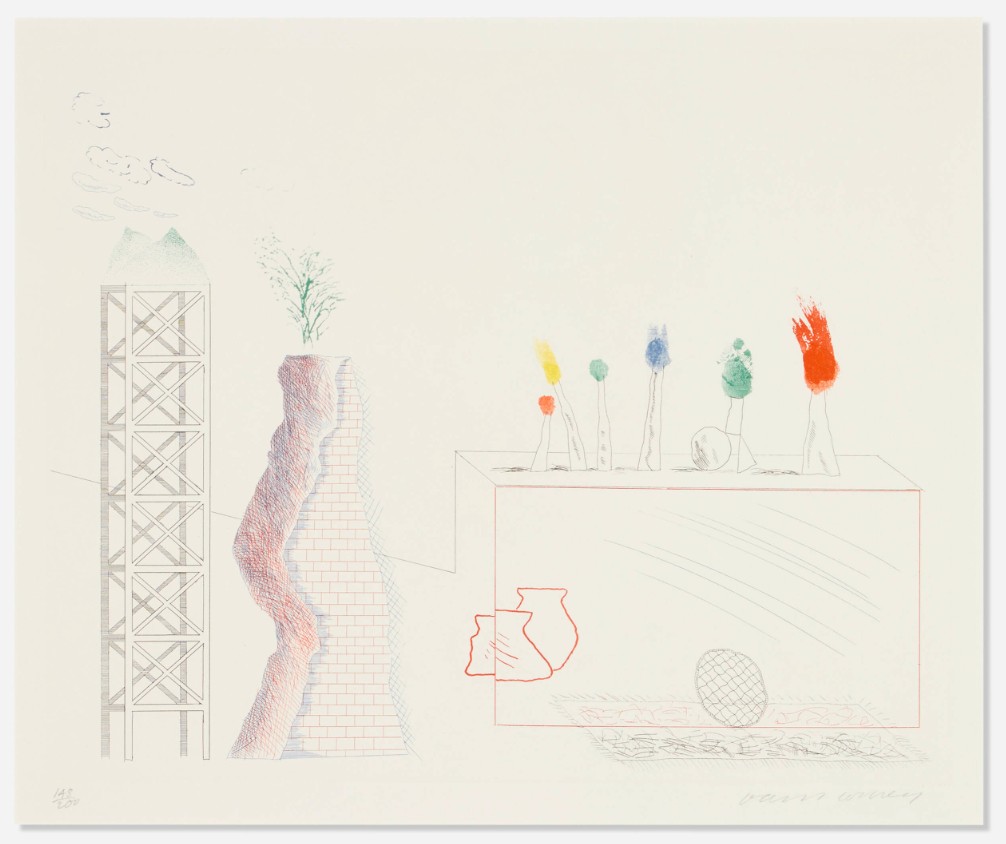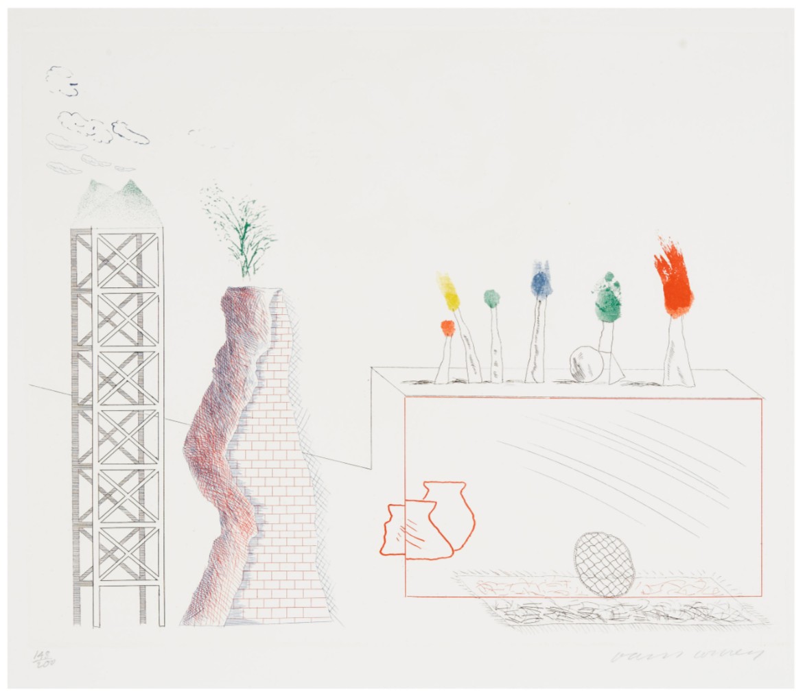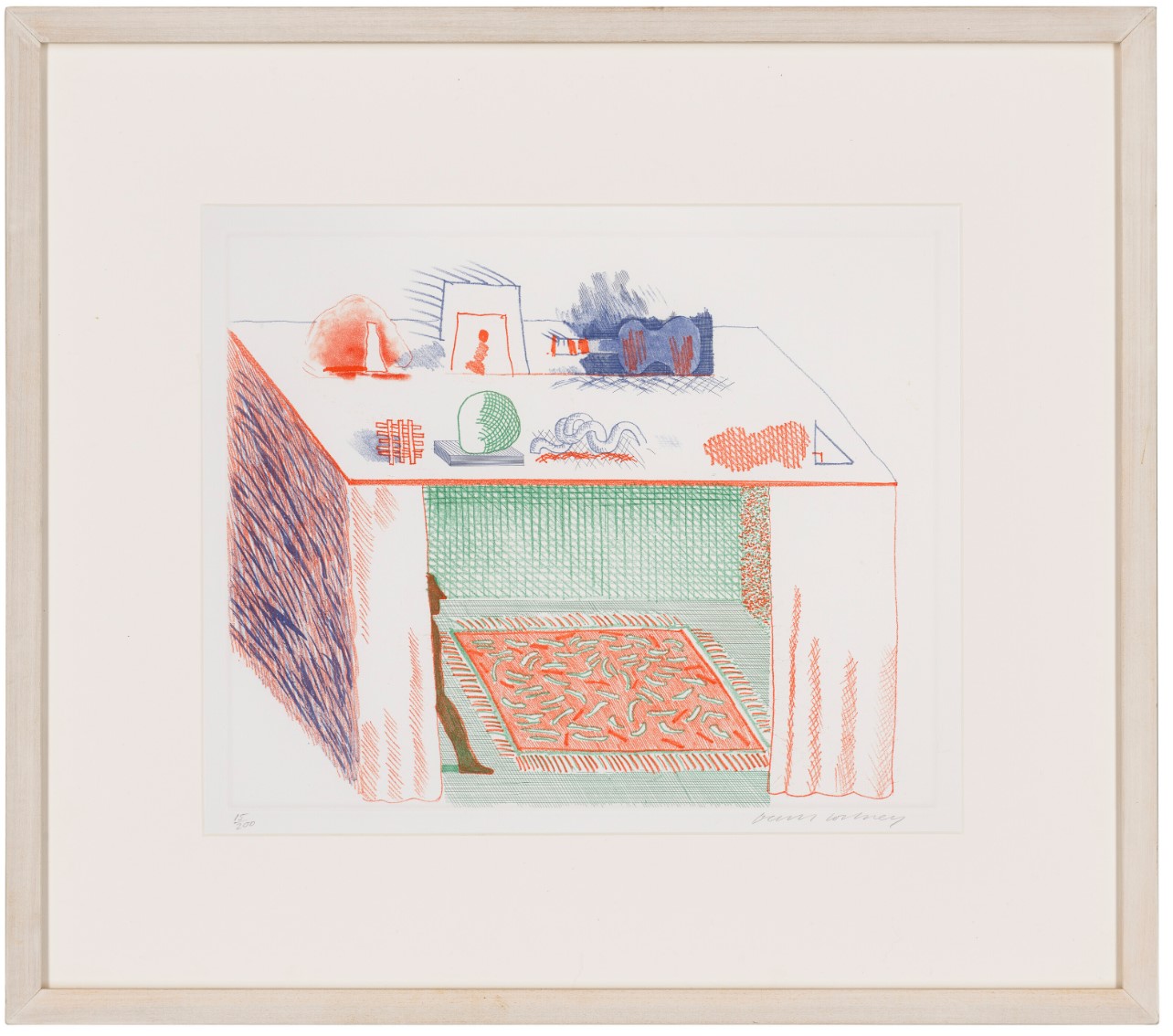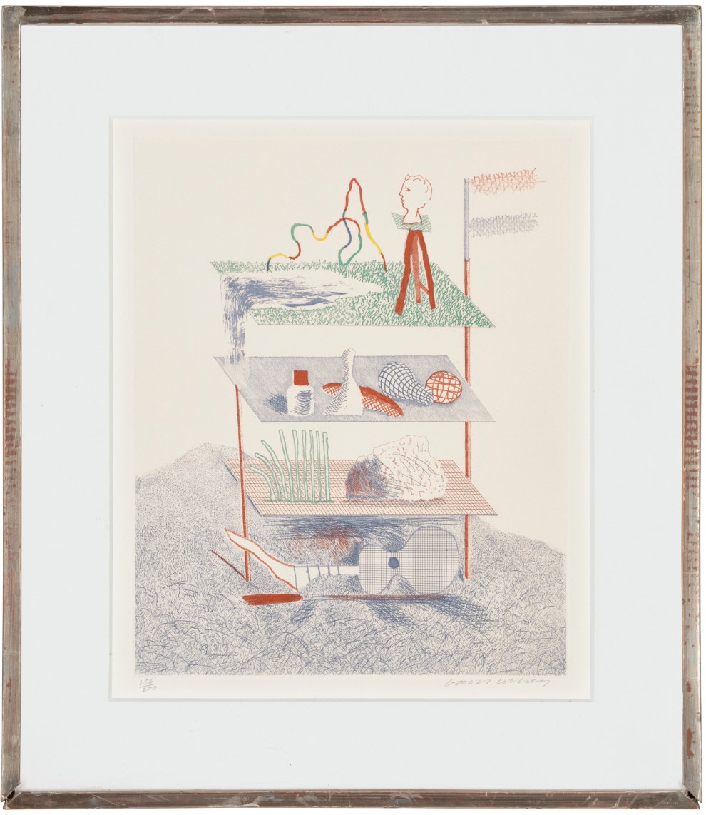 Individual plates are populated with a multitude of references to Picasso’s work including imagery of guitars, still lives, stage sets and distorted perspectives. Figures with Still Life recreates a Cubist scene and echoes Hockney’s earlier etched homage to Picasso, Artist and Model, 1973-74 in which he sits opposite and in visual dialogue with his venerated predecessor. But the final plate, What is this Picasso? provides the most overt reference to Picasso, including his 1937 Portrait of Dora Maar, his muse and lover. The layers of influence continue in perpetuity: Etchings by David Hockney, who was inspired by Wallace Stevens, who was inspired by Pablo Picasso, who was inspired by Dora Maar? Afterall, as Hockney says, “good artists don’t borrow, they steal”.