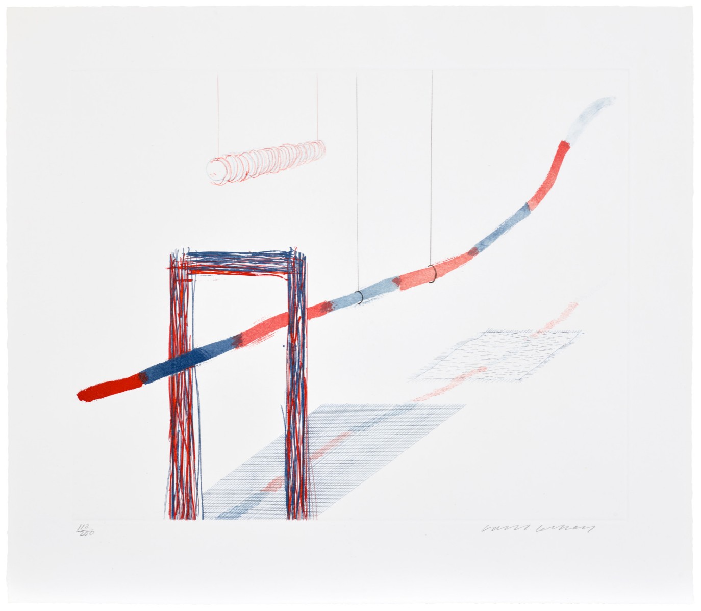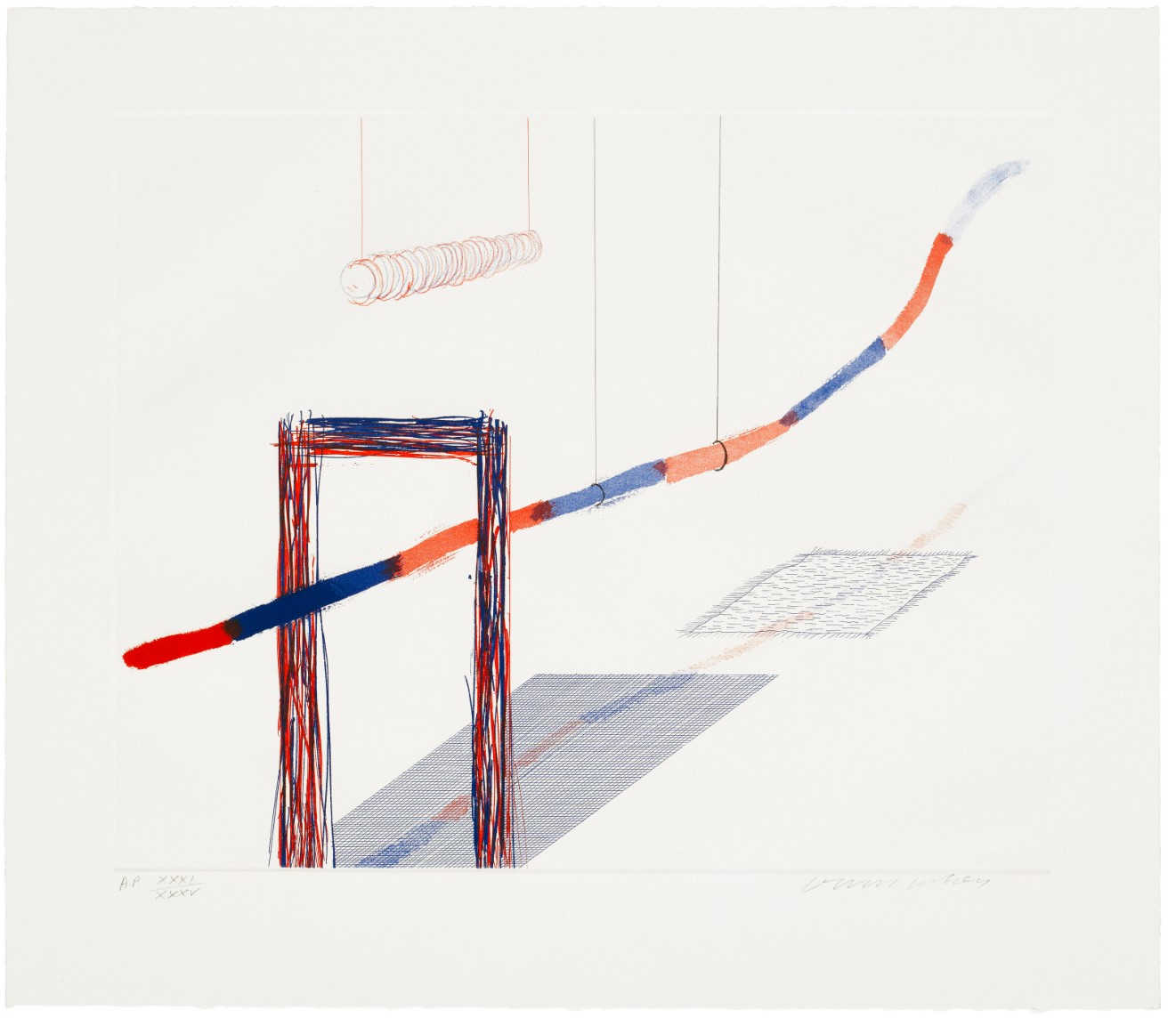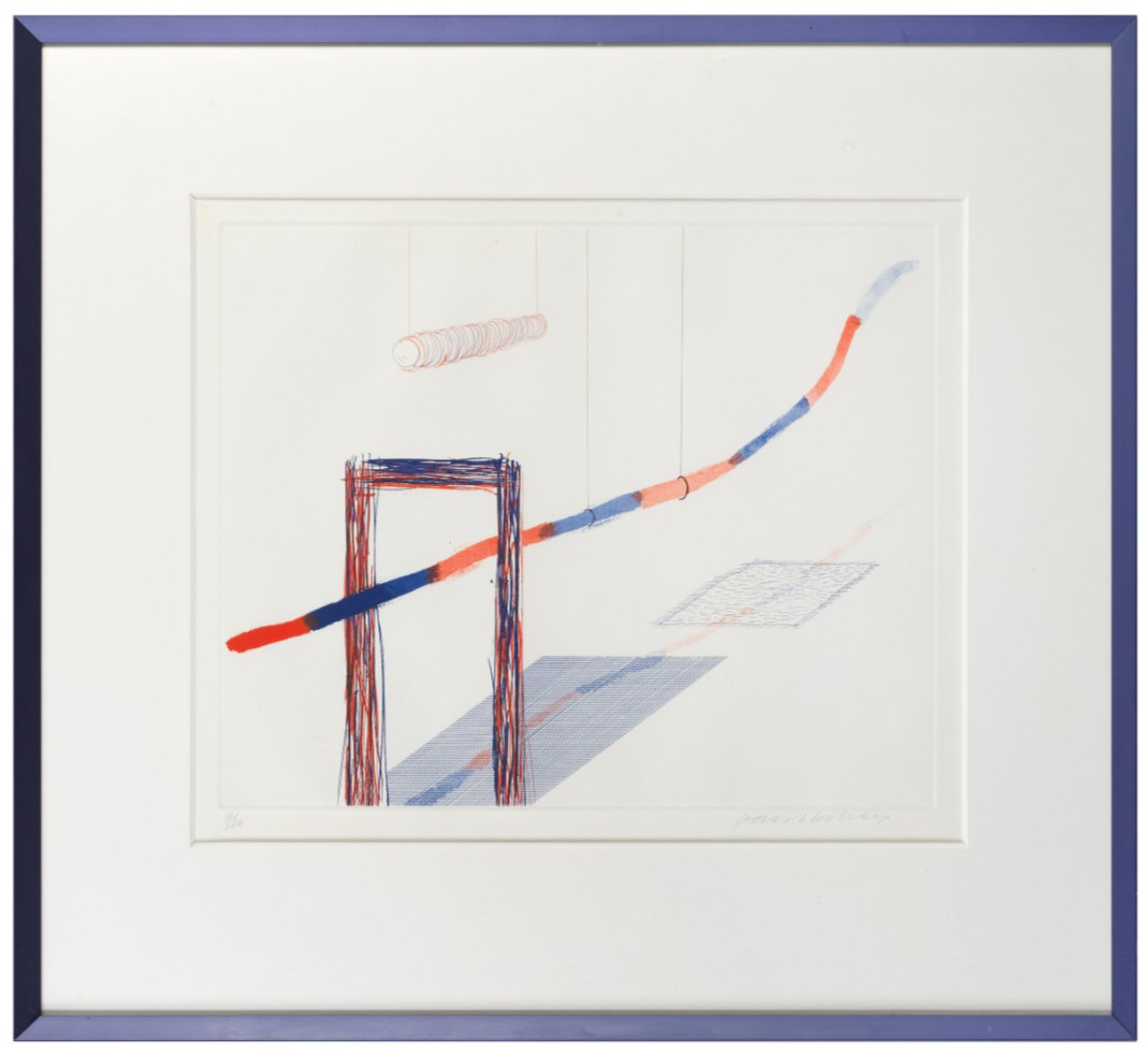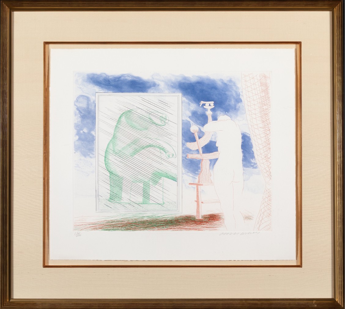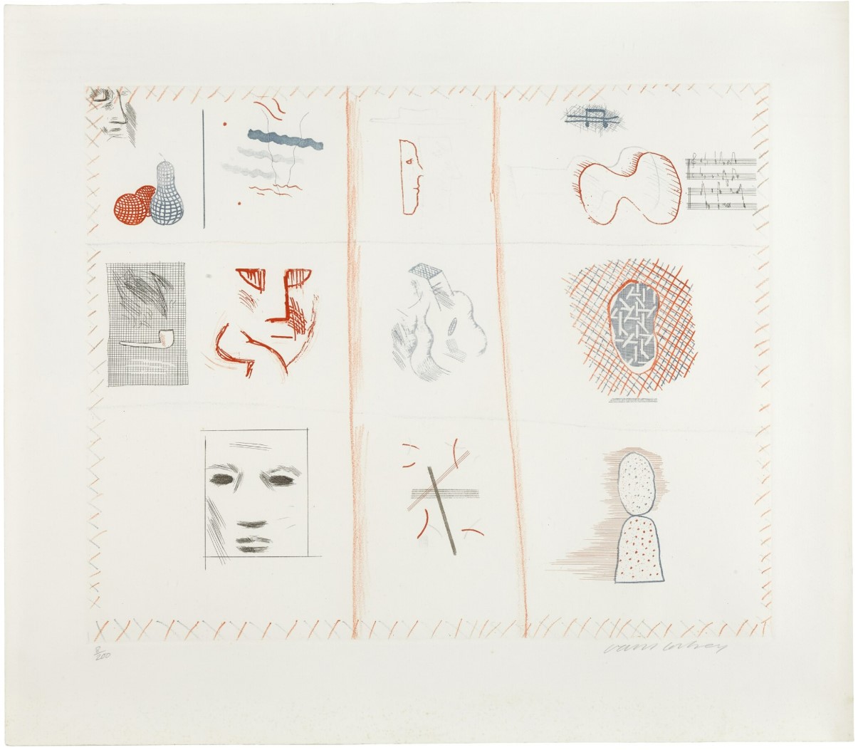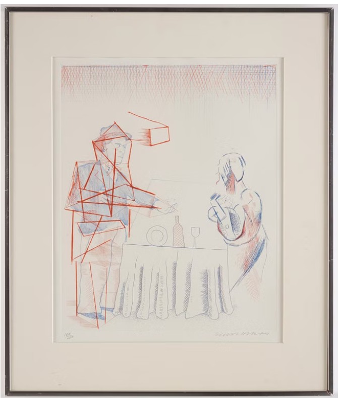 Individual plates are populated with a multitude of references to Picasso’s work including imagery of guitars, still lives, stage sets and distorted perspectives. Figures with Still Life recreates a Cubist scene and echoes Hockney’s earlier etched homage to Picasso, Artist and Model, 1973-74 in which he sits opposite and in visual dialogue with his venerated predecessor. But the final plate, What is this Picasso? provides the most overt reference to Picasso, including his 1937 Portrait of Dora Maar, his muse and lover. The layers of influence continue in perpetuity: Etchings by David Hockney, who was inspired by Wallace Stevens, who was inspired by Pablo Picasso, who was inspired by Dora Maar? Afterall, as Hockney says, “good artists don’t borrow, they steal”.