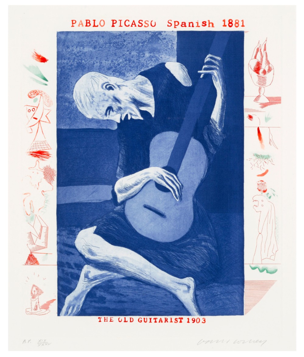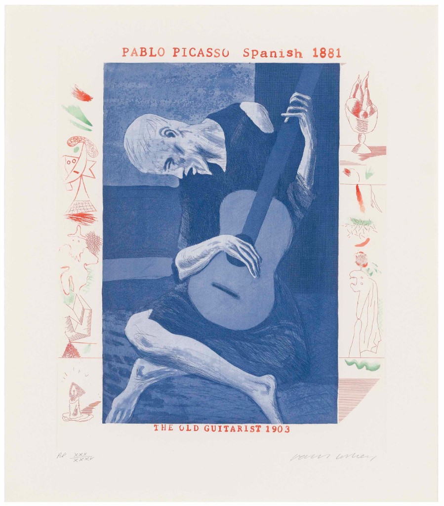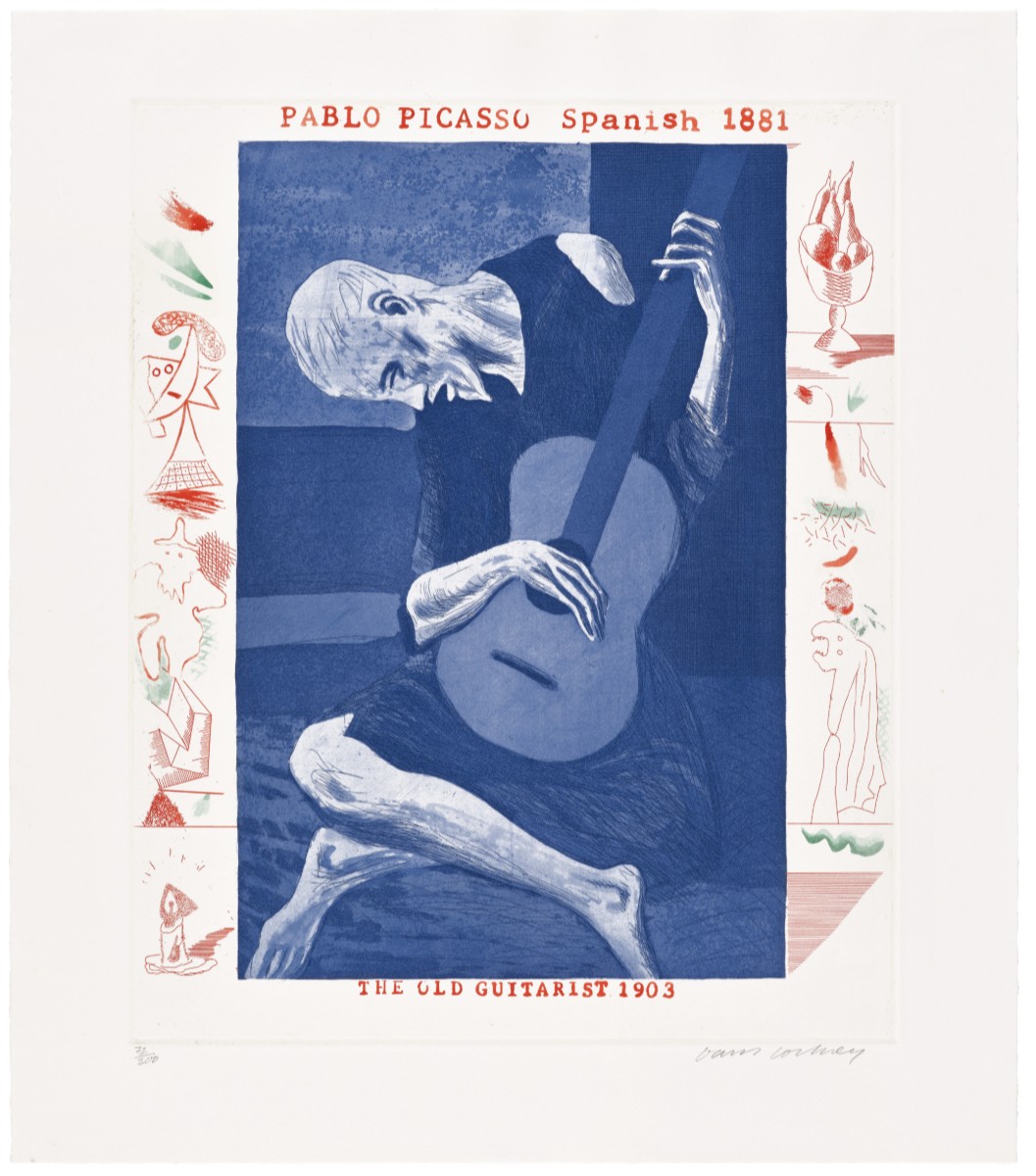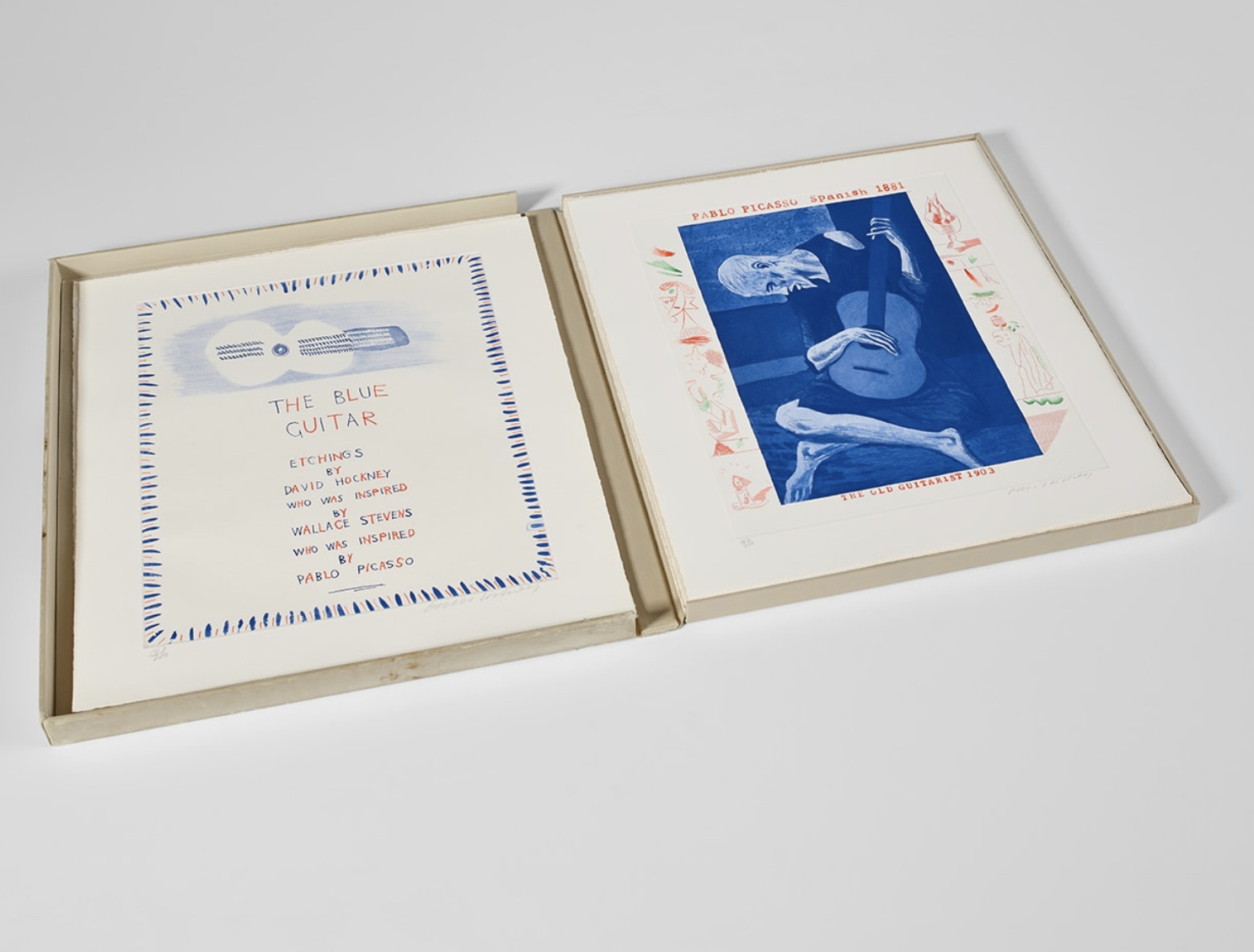When Picasso died in 1973 Hockney was invited to contribute a print to the portfolio Homage to Picasso. Deciding to make an etching he went to the studio of Aldo Crommelynck, Picasso’s master printer, in Paris. It was under Crommelynck’s tutelage that Hockney learnt about the sugar lift aquatint, a method used extensively by Picasso, as well as color etching techniques which he would use later in The Blue Guitar to great effect.
