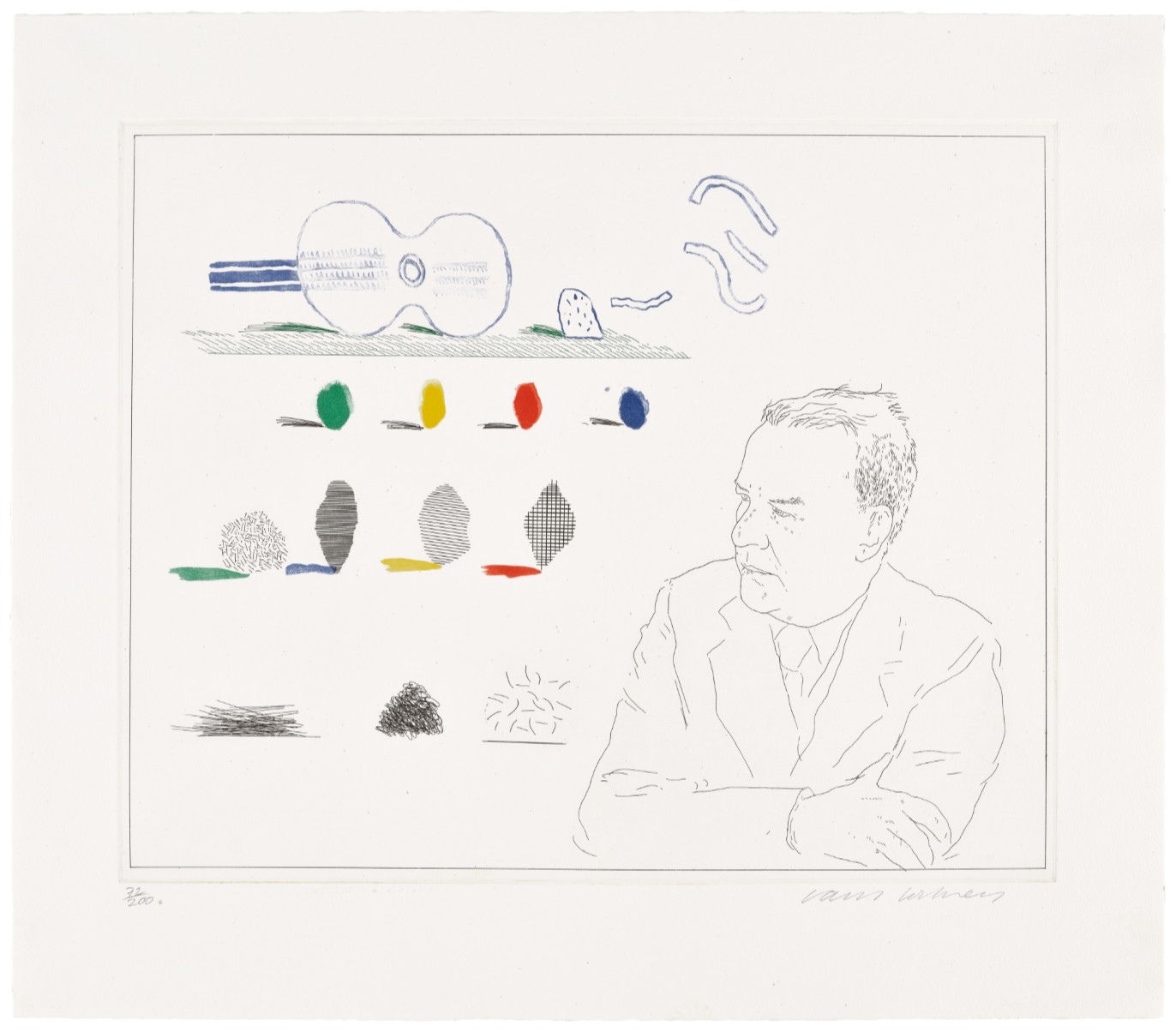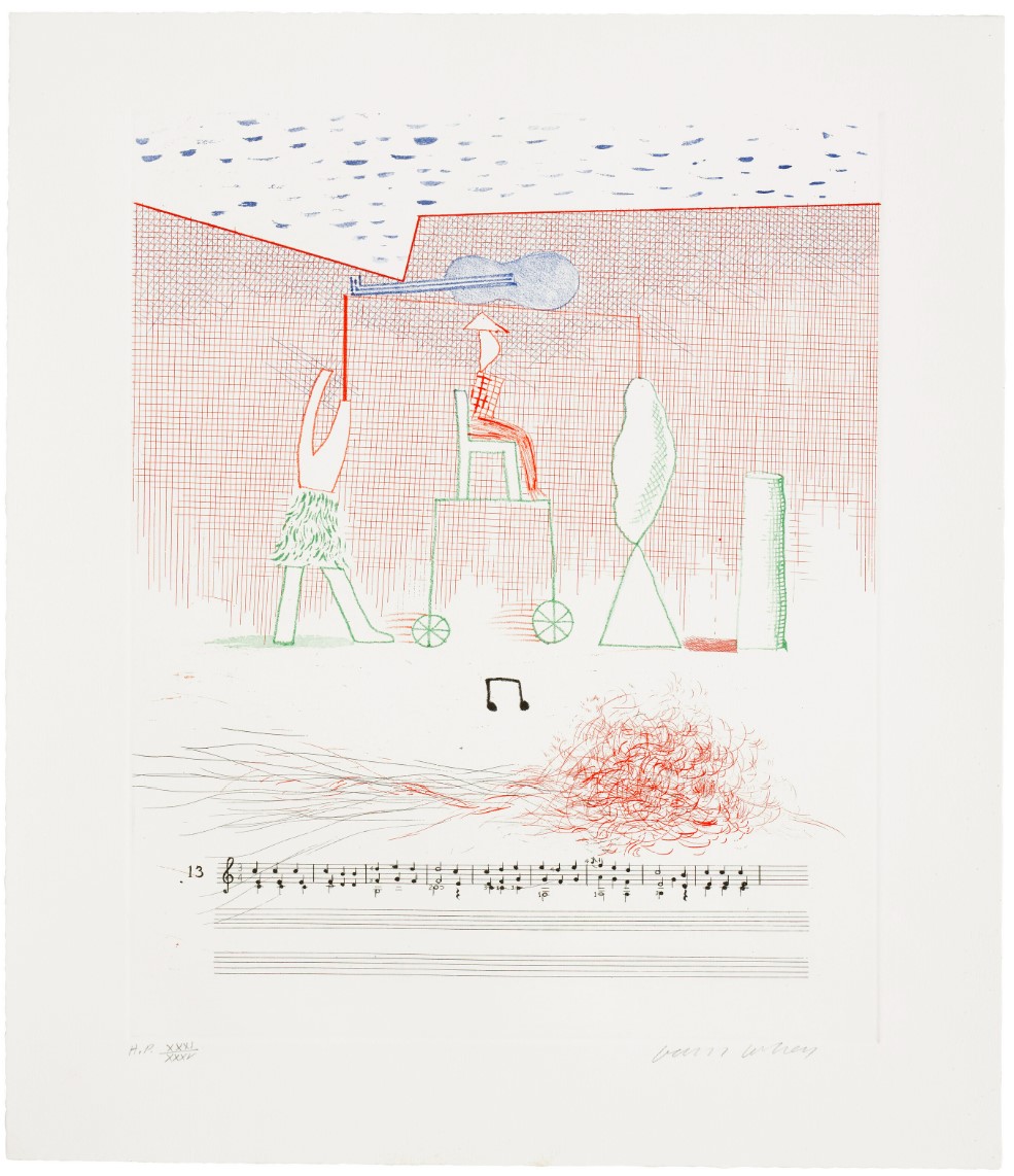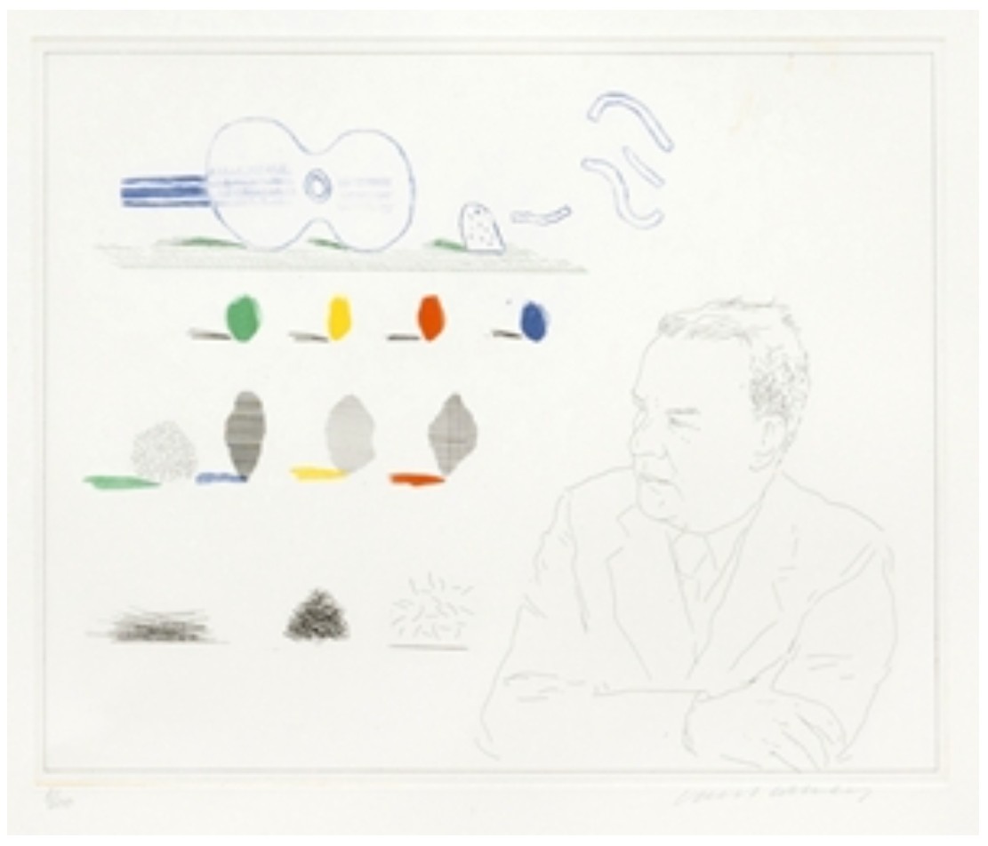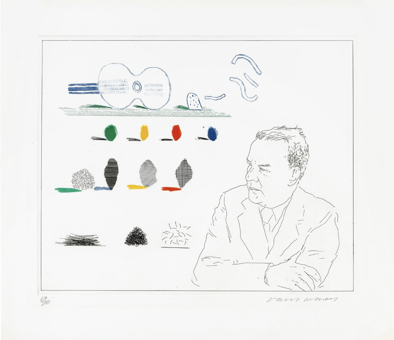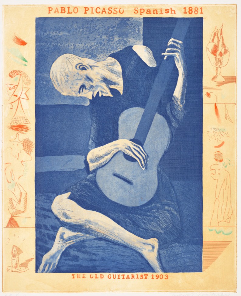 When Picasso died in 1973 Hockney was invited to contribute a print to the portfolio Homage to Picasso. Deciding to make an etching he went to the studio of Aldo Crommelynck, Picasso’s master printer, in Paris. It was under Crommelynck’s tutelage that Hockney learnt about the sugar lift aquatint, a method used extensively by Picasso, as well as color etching techniques which he would use later in The Blue Guitar to great effect.