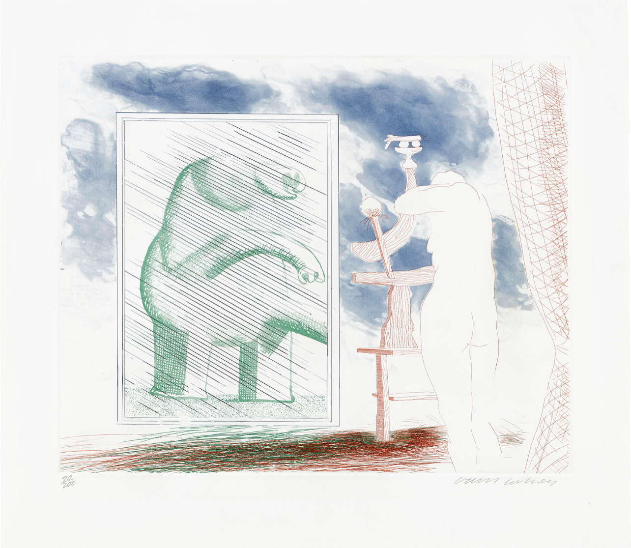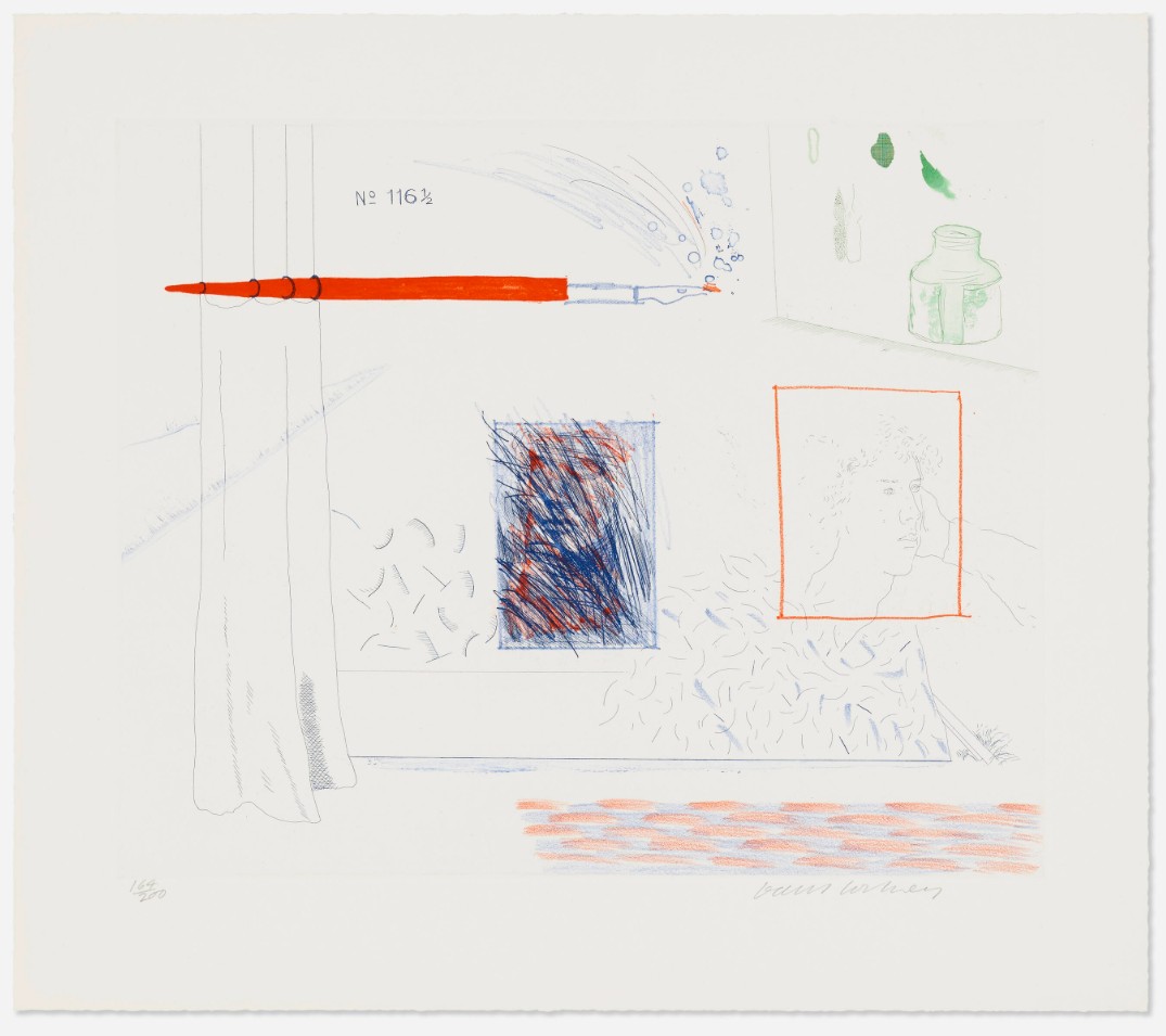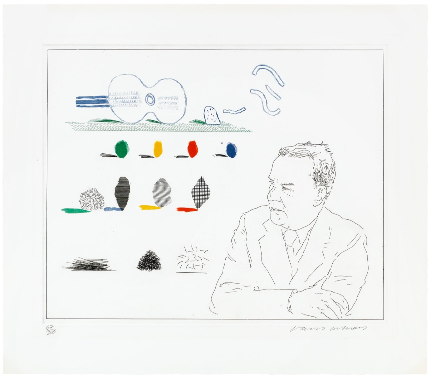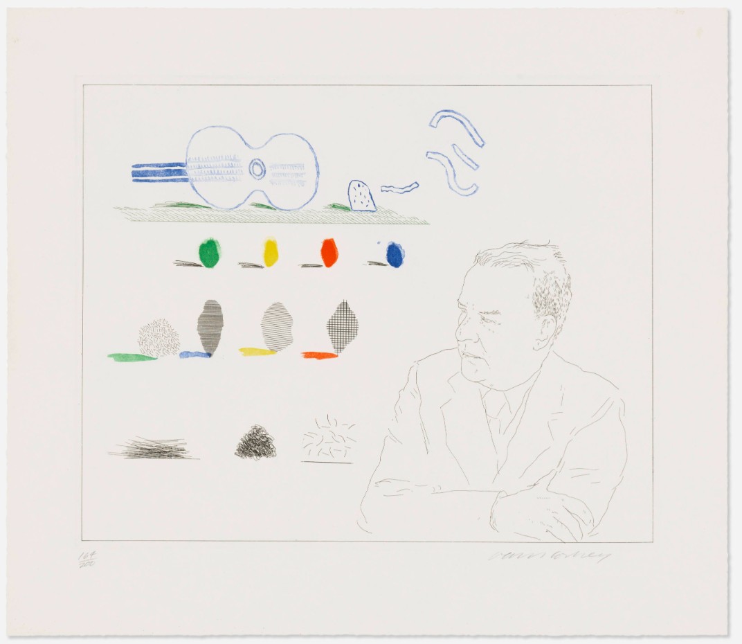 When Picasso died in 1973 Hockney was invited to contribute a print to the portfolio Homage to Picasso. Deciding to make an etching he went to the studio of Aldo Crommelynck, Picasso’s master printer, in Paris. It was under Crommelynck’s tutelage that Hockney learnt about the sugar lift aquatint, a method used extensively by Picasso, as well as color etching techniques which he would use later in The Blue Guitar to great effect.