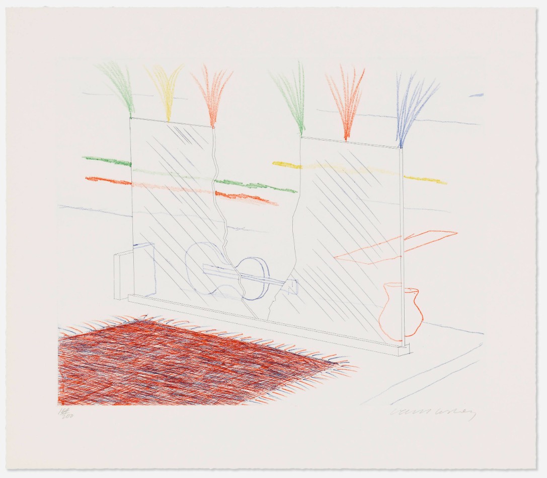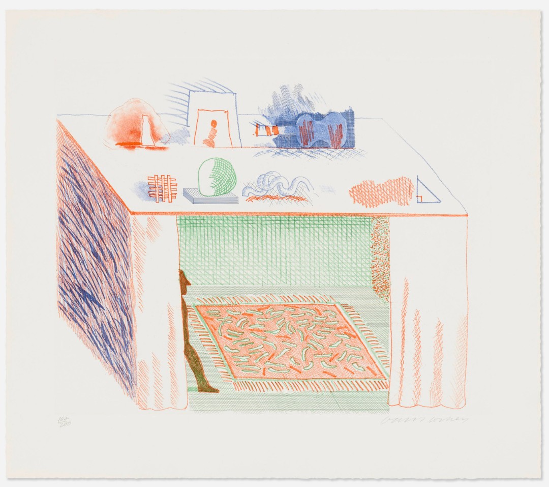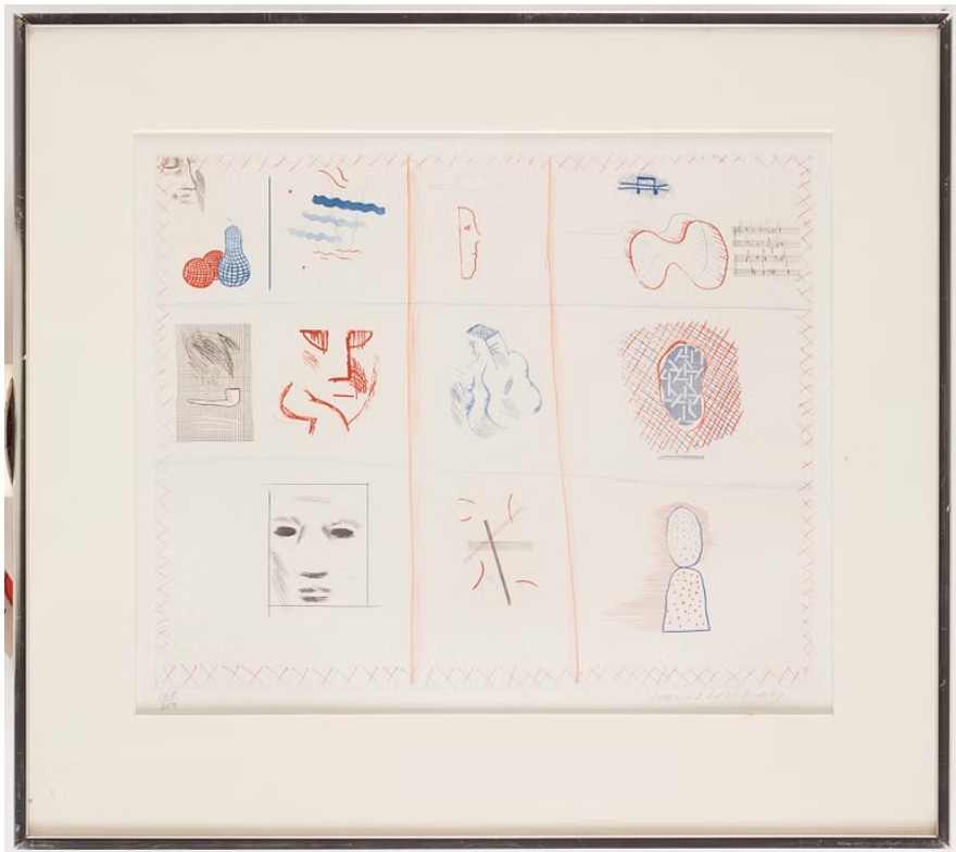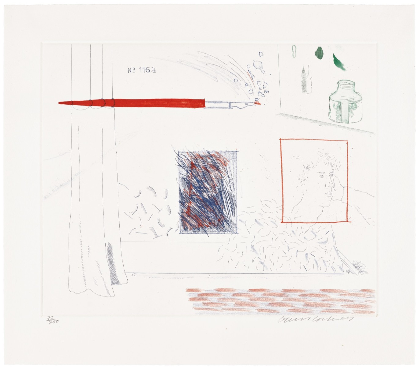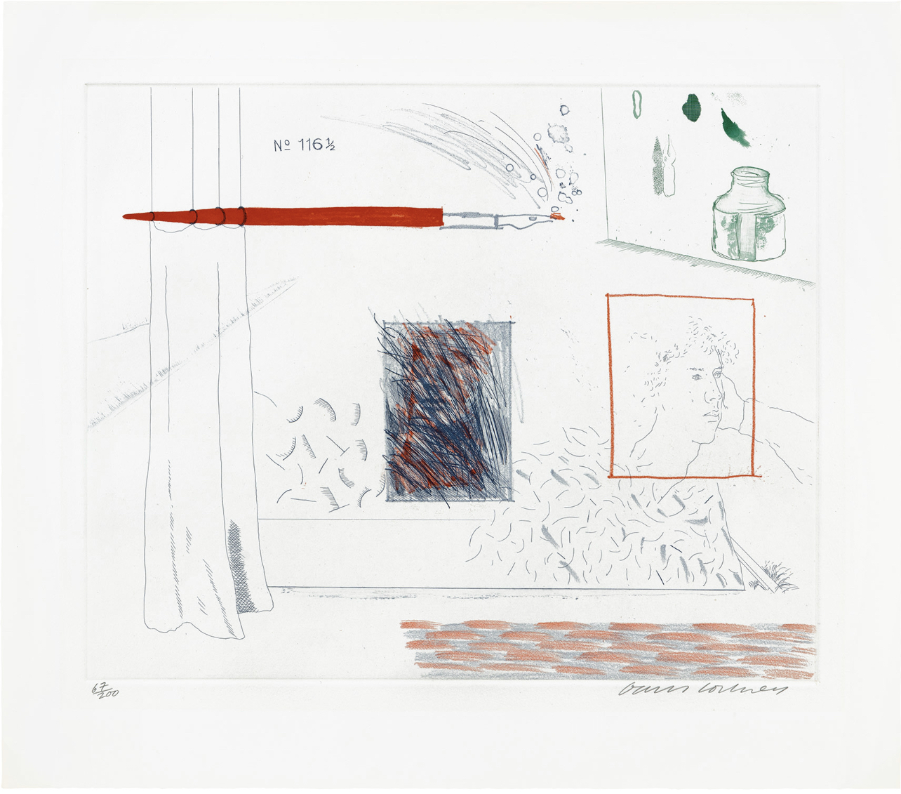 When Picasso died in 1973 Hockney was invited to contribute a print to the portfolio Homage to Picasso. Deciding to make an etching he went to the studio of Aldo Crommelynck, Picasso’s master printer, in Paris. It was under Crommelynck’s tutelage that Hockney learnt about the sugar lift aquatint, a method used extensively by Picasso, as well as color etching techniques which he would use later in The Blue Guitar to great effect.