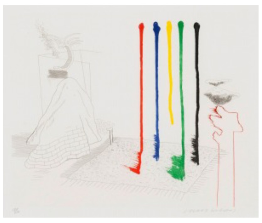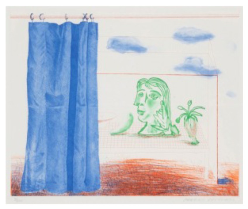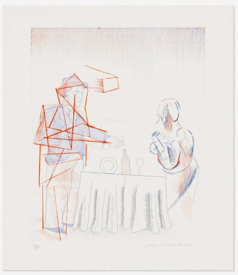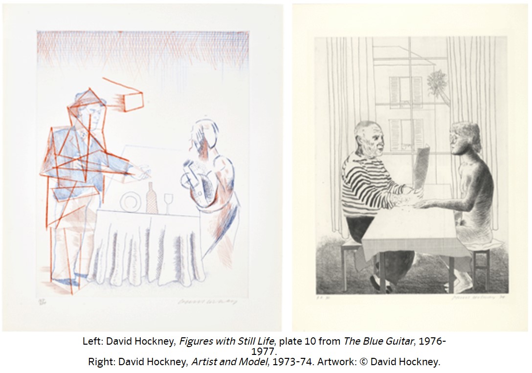 Hockney first encountered Picasso’s work on a visit to London as an art student in 1954, and when an important Picasso show was mounted at the Tate in 1960, Hockney, then a student at the Royal Academy of Art, visited the exhibition eight times. Yet in spite of this early enthusiasm, it was not until the 1970s that the first pictorial references to the Spanish master started to appear in his paintings and prints.