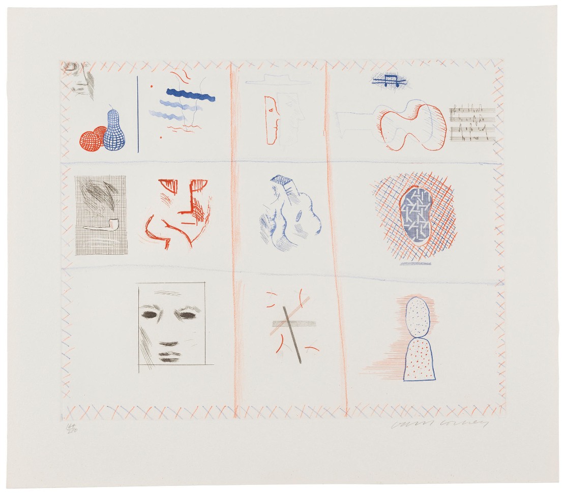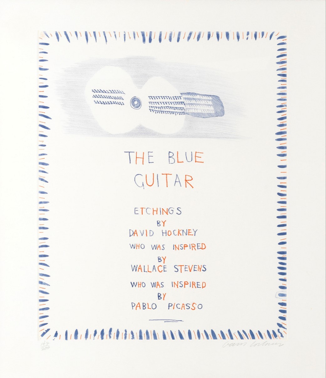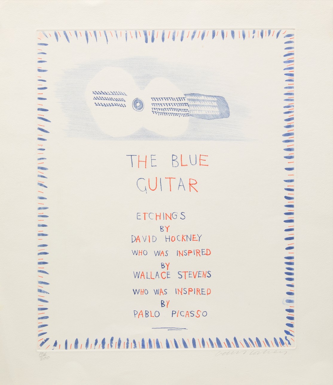Hockney had first incorporated fragments of poetry in his 1961 painting, We Two Boys Clinging Together, which integrated two lines from a Walt Whitman poem of the same title. But Stevens’ book-length poem encouraged a much greater creative output from Hockney, who embarked upon an extensive series of twenty etchings, The Blue Guitar: Etchings by David Hockney, who was inspired by Wallace Stevens, who was inspired by Pablo Picasso.