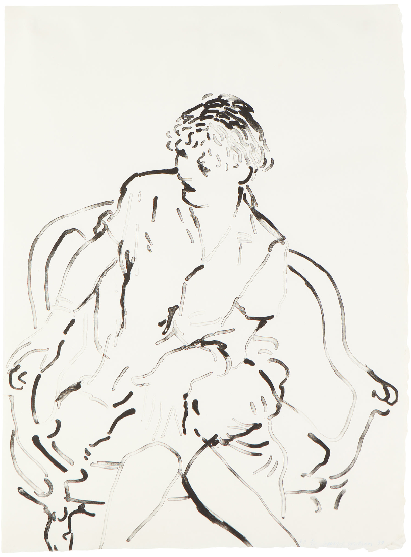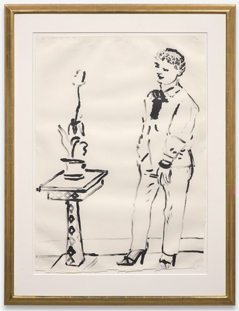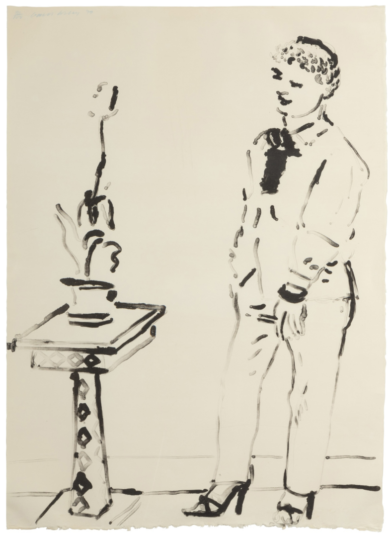 Like Hockney, Birtwell was born in the North of England, and she moved to London to pursue her creative passions. She married Raymond ‘Ossie’ Clark, a fashion designer, in 1969 with David Hockney in attendance as Ossie’s best man. Birtwell had studied textile design, and she collaborated with Clark on many projects. Through their patterned silks and chiffons, they helped define the aesthetic of the Swinging Sixties. In Celia in a Wicker Chair, Hockney uses her vibrant dress as a device through which to convey her personality, creativity, and occupation.