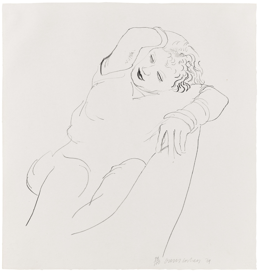 Hockney has been inspired by Birtwell for over half a century, capturing the myriads of her likeness and personality over time. In this lithograph, Birtwell’s facial features are gently accentuated, partially obscured by the cascading curls of her hair. Her skin is paper-white, but Hockney adds vibrancy to his sitter by skillfully rendering her piercing blue eyes. Boldly outlined, they stare directly out at the viewer in a compelling and engaging manner. Nonetheless, it is Celia’s boldly patterned and brightly colored dress that takes center stage in this lithograph. Rather than aiming to exactly replicate his model’s likeness, Hockney instead seeks to portray other characteristics which more aptly capture the essence of his sitter. In this instance, he focuses on her love of pattern, for which Celia Birtwell is most well-known.