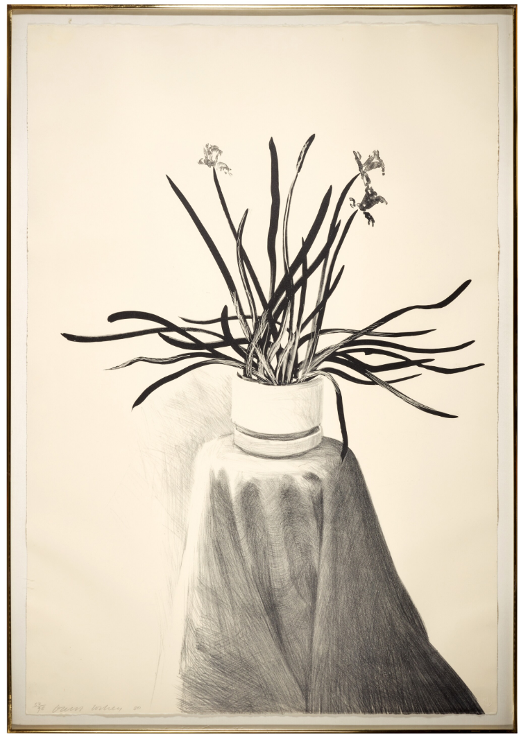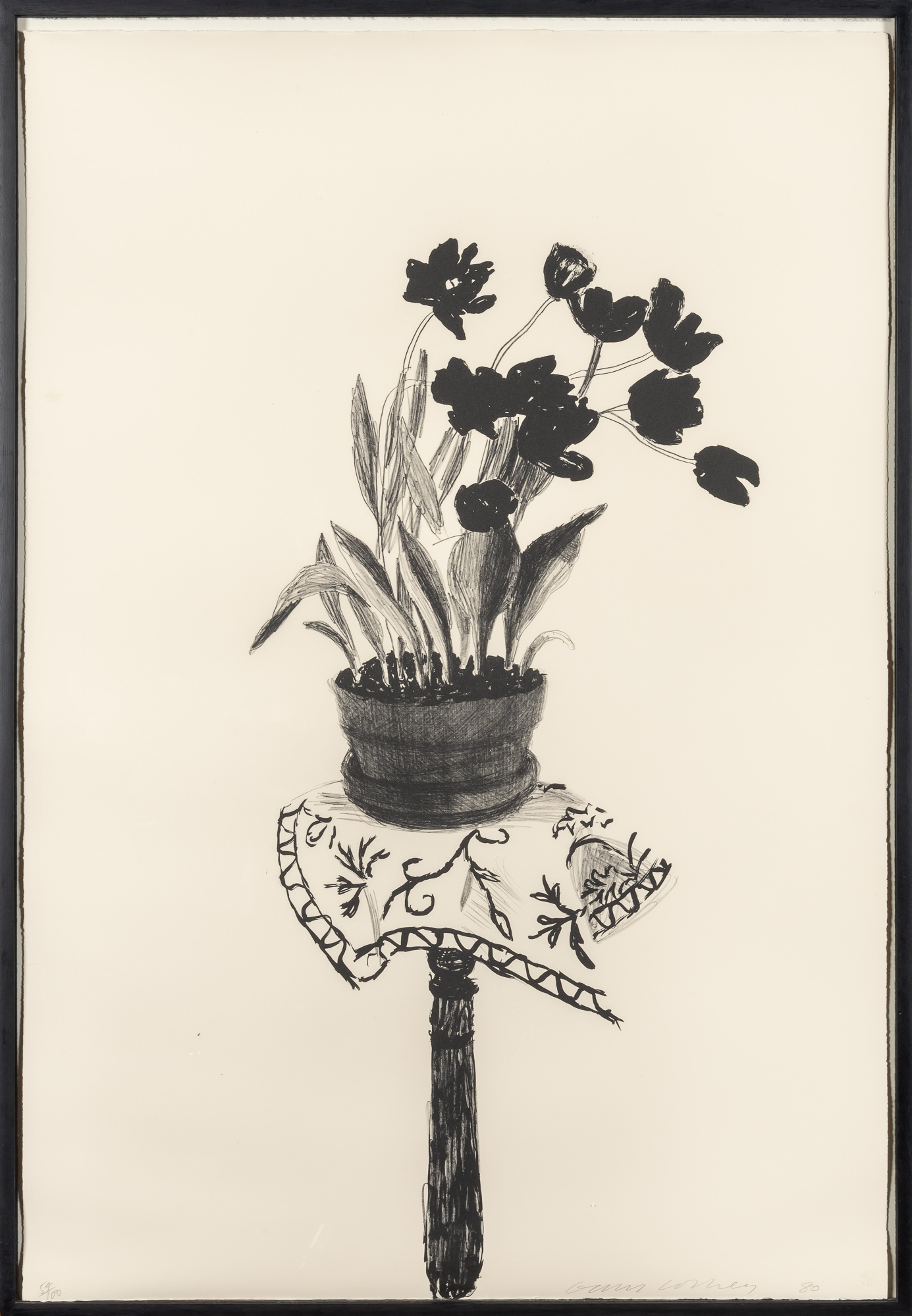 Potted Daffodils and Black Tulips are large-format lithographs printed in black ink on cream BFK Rives paper, giving them the appearance of an exquisite pencil or pen-and-ink drawing. They were created at Tyler Graphics, Ltd., a collaboration that allowed Hockney increased technical resources for complex layering and tonal work. Unlike typical still lifes that feature flowers in a vase, these images show the flowers rooted in soil within a pot and a saucer, a notable departure from tradition.