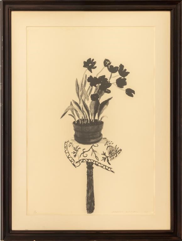 David Hockney’s 1980 prints Potted Daffodils and Black Tulips are monochromatic lithographs that transform traditional still-life subjects into striking, almost surreal images, demonstrating his mastery of the printmaking medium.