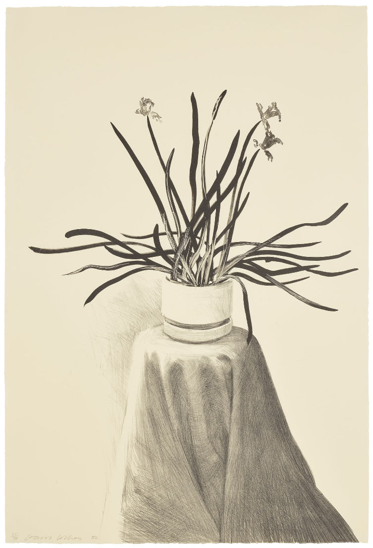 While created in Los Angeles in 1980, the daffodil, a flower deeply rooted in British cultural identity and celebrated by poets like Wordsworth, reflects Hockney’s enduring bond with his English homeland. Those works also reflect Hockney’s inspiration from masters like Matisse and Morandi, while his use of the still-life genre provides a vehicle for endless experimentation with pictorial construction and the representation of space and light.