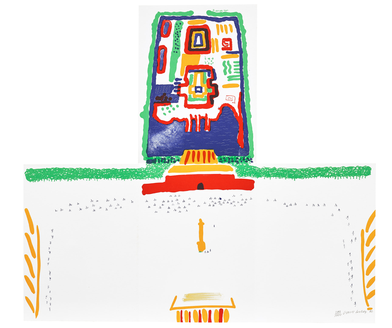 Lithograph in colors on Somerset paper, the full sheet folded three times to form four panels
