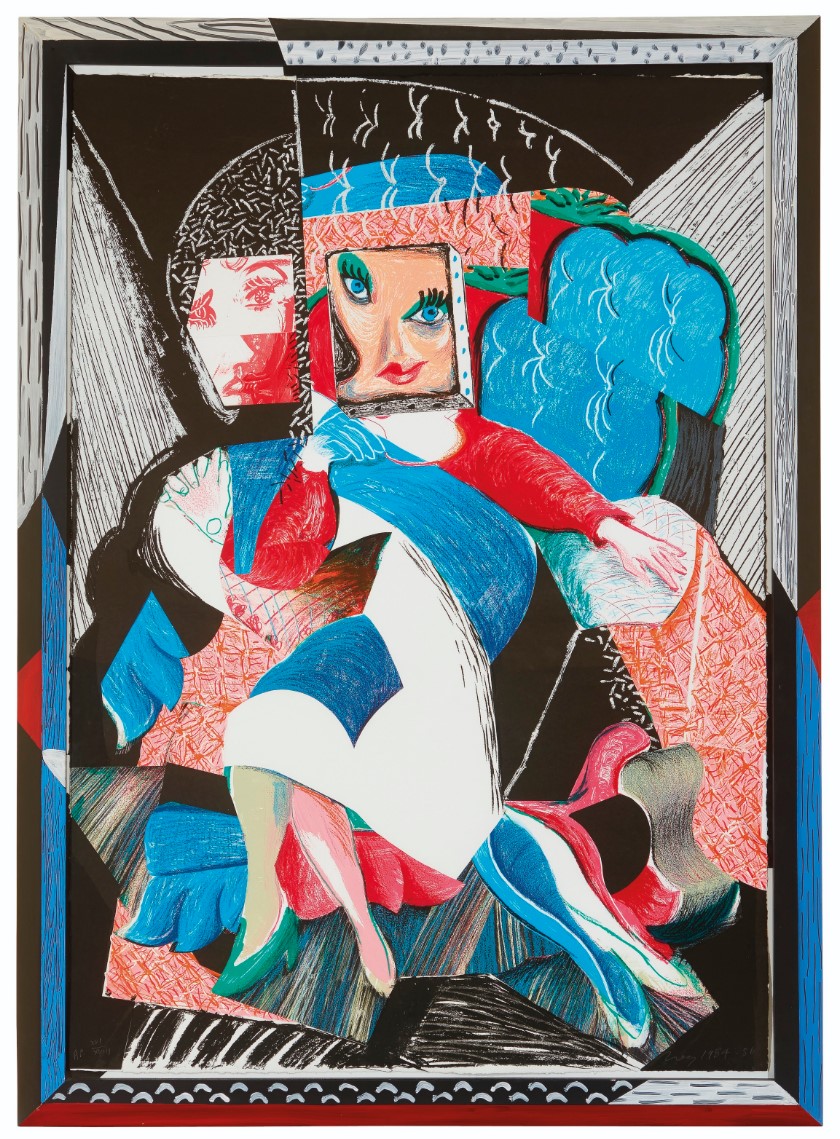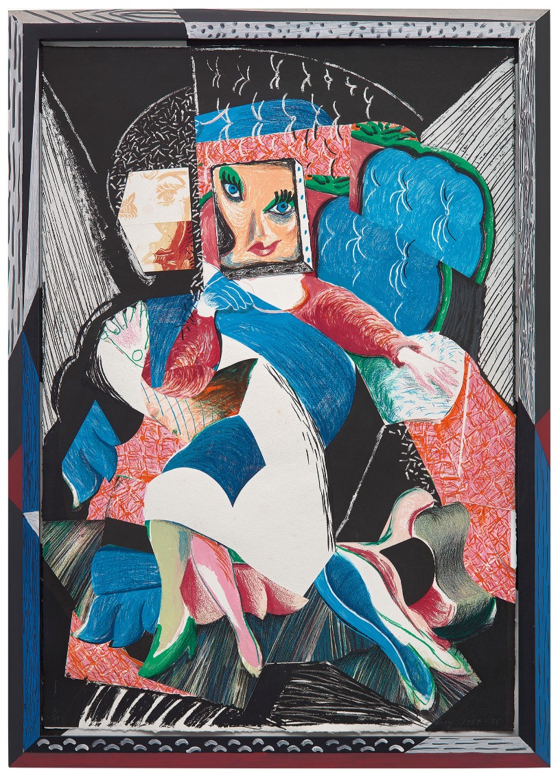 An Image of Celia is a cubist work, which brings together different views of Celia in a fragmented and abstract manner. This style seems particularly fitting for such a portrait, as Birtwell herself was influenced by the works of Pablo Picasso. The bold red and blue hues vibrantly blend the two bodies; in contrast, the black and white background serves to further lift the image from the paper.