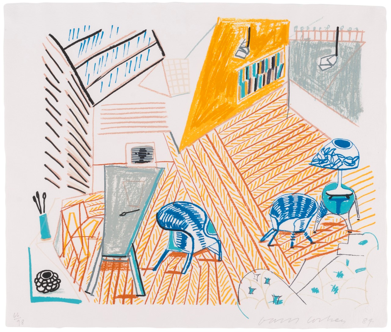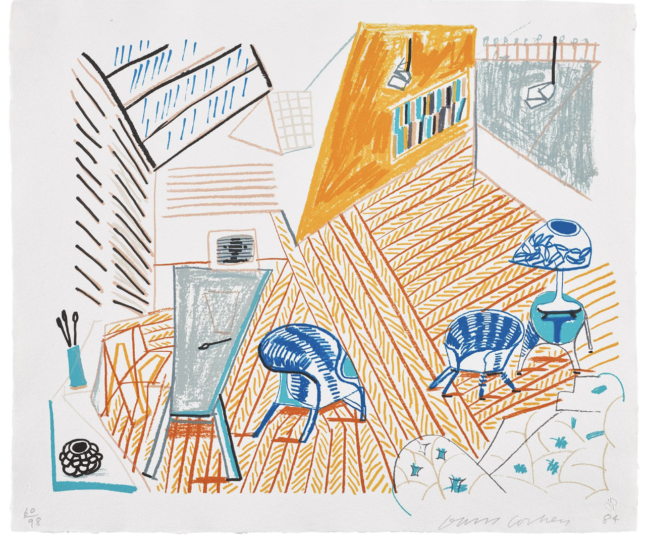 Pembroke Studio with Blue Chairs and Lamp features Hockney’s studio, the Pembroke Studio, as a skewed and fractured interior. The scene uses an unnatural, multi-point perspective. The studio’s floor, ceiling, and furnishings appear at odd angles, creating a dramatic, almost “seasick” effect for the viewer. The recognizable everyday objects of the studio, the chairs and the lamp, are seen from multiple angles simultaneously, collapsing their form and structure. The scene is rendered with simple, crayon-like lines in a bold and bright palette.