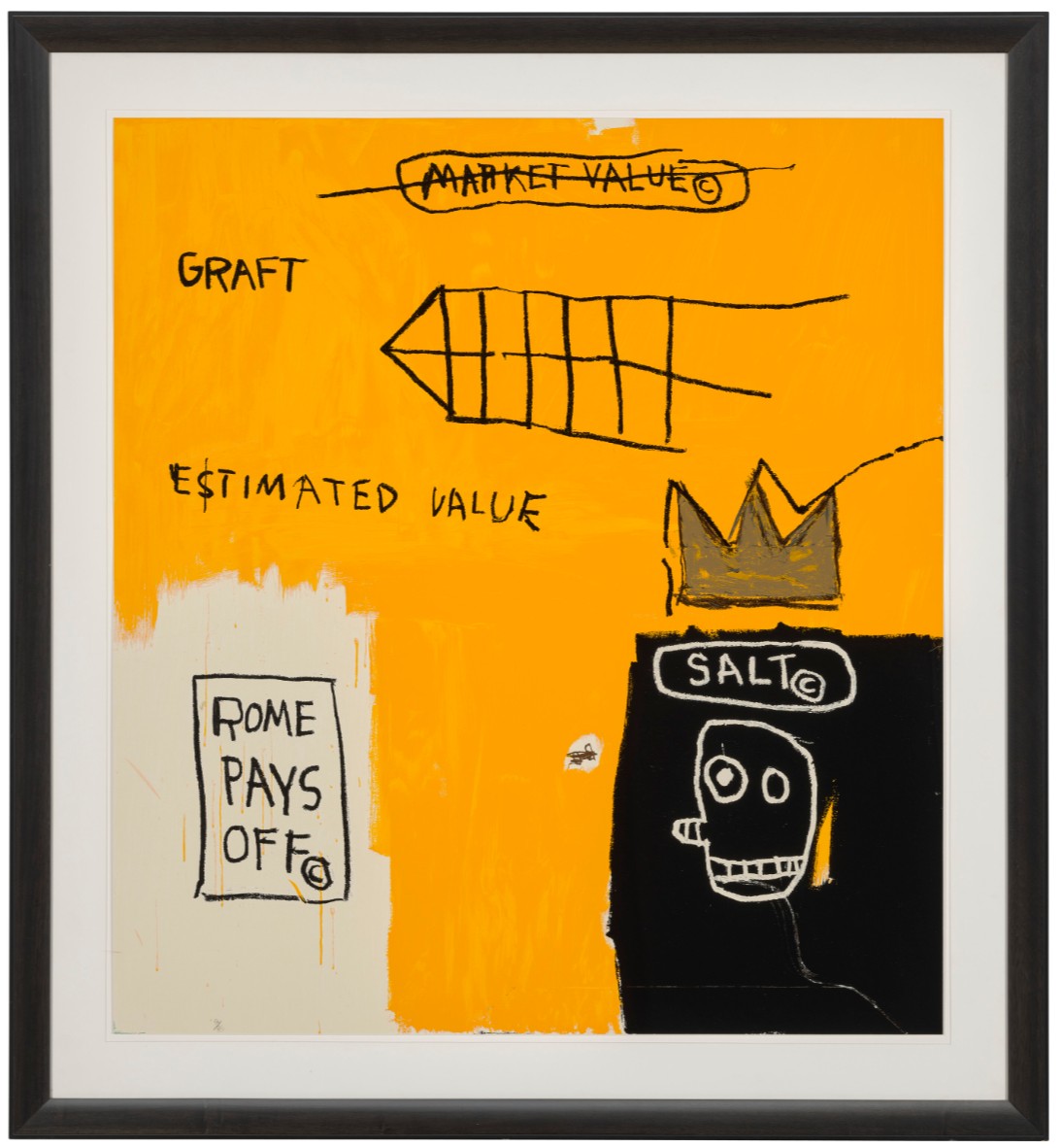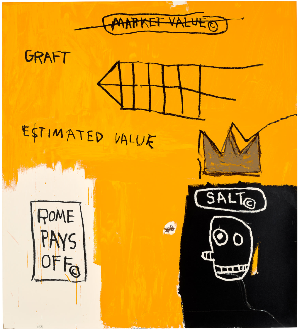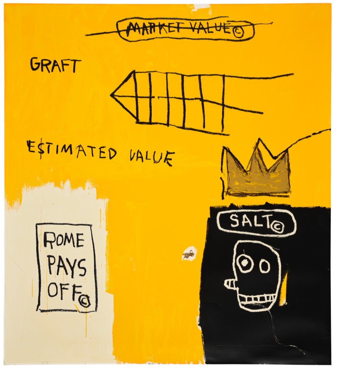 Rome Pays Off is a striking example of Basquiat’s characteristic scrawl in text and image. His emblematic crown atop a stick figure, copyright signs, text referring to another world and marketplace, and roughly squared blocks of color all point to Basquiat’s fully mature style.