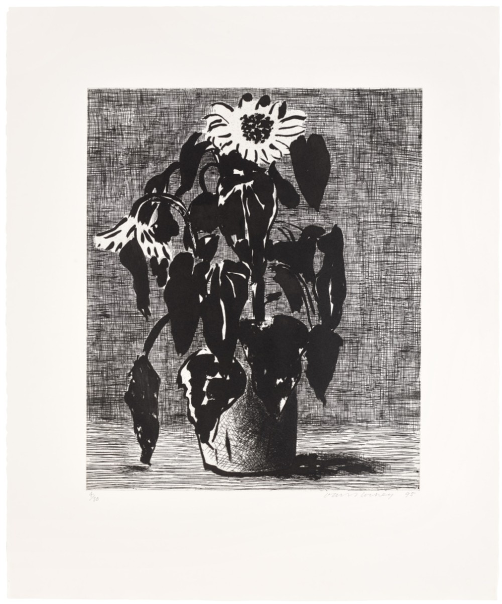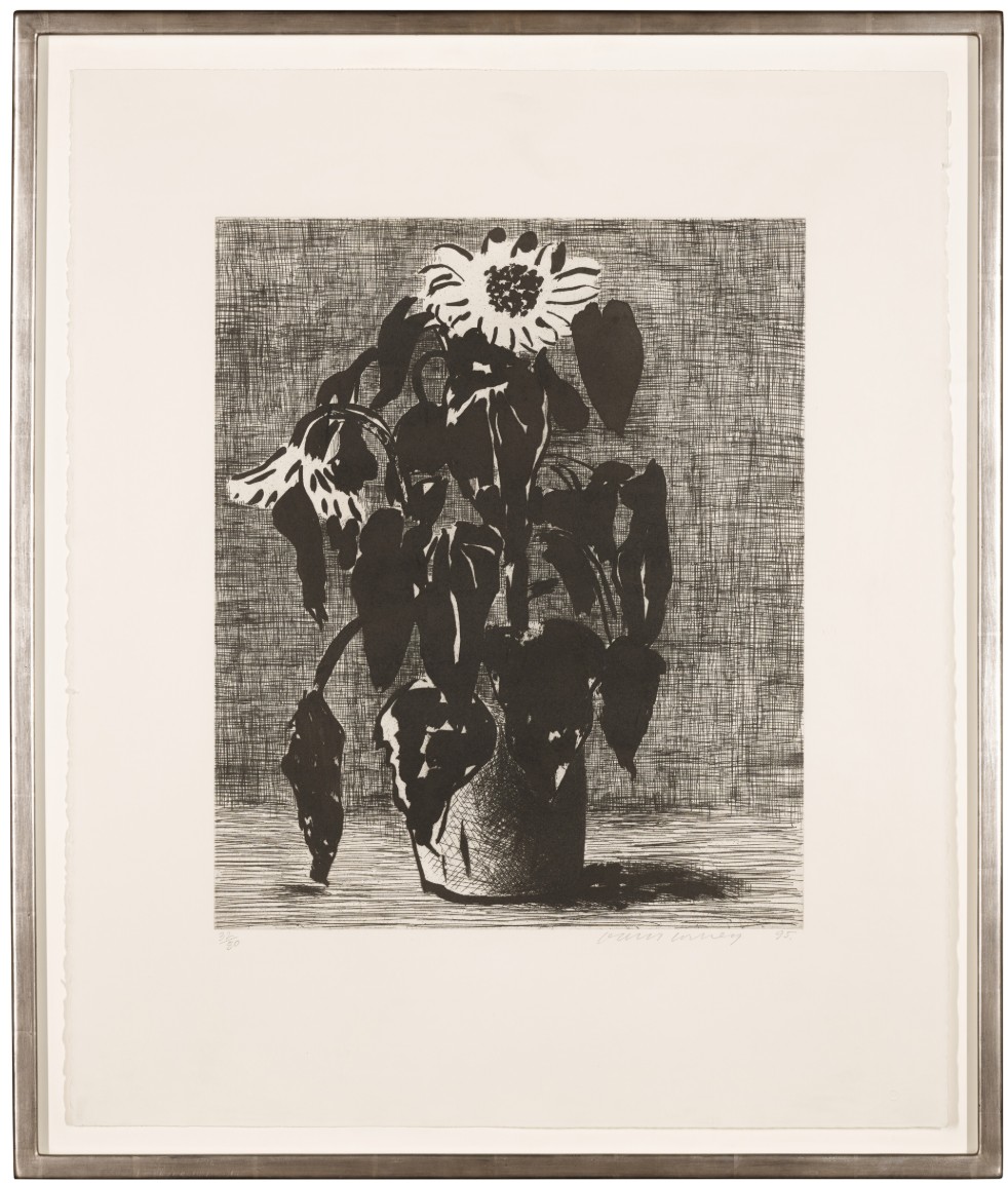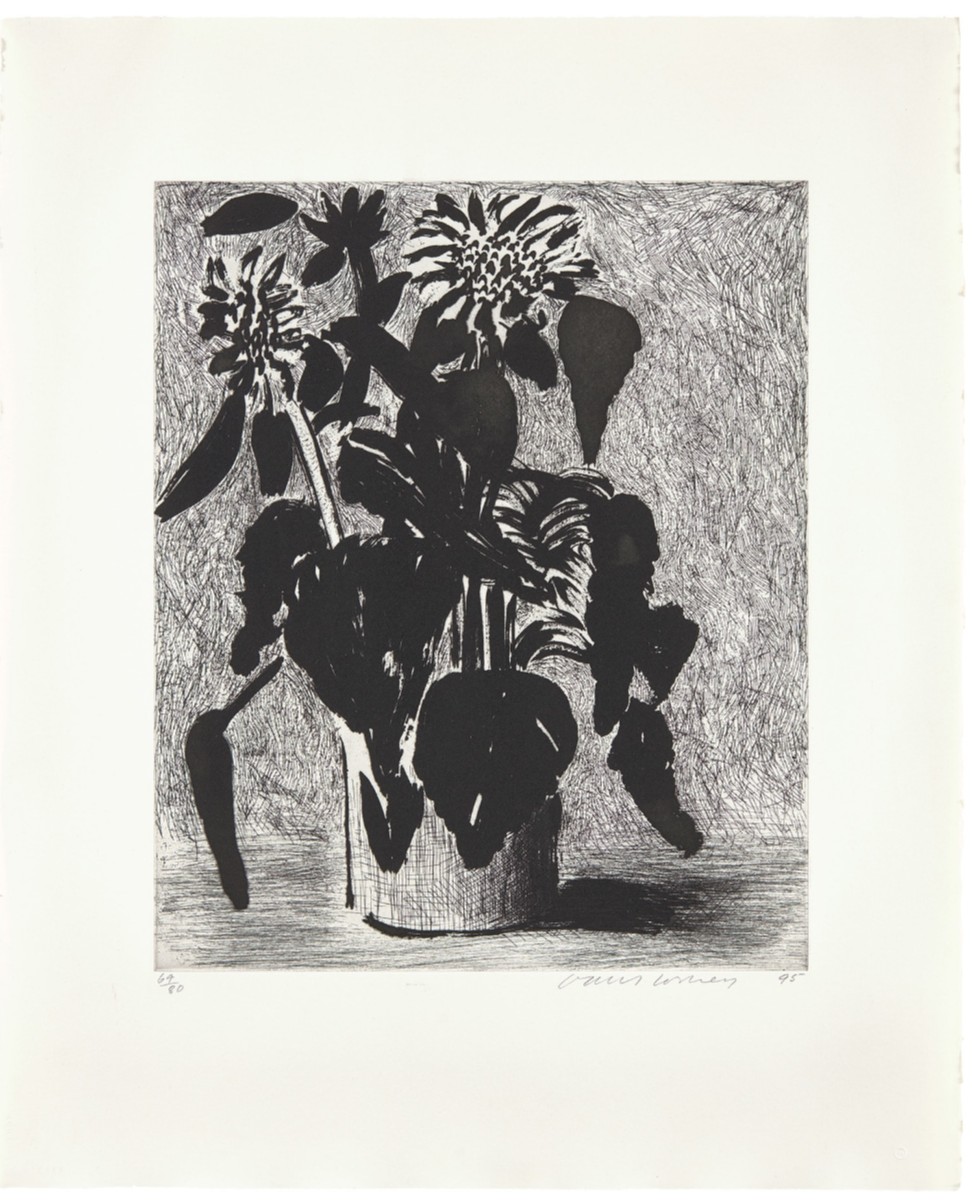 Sunflowers embody the transience of life, and this etching captures that theme through the contrast between two large sunflowers in full bloom against the surrounding ripening buds, set within dense foliage. Hockney’s use of rich aquatint in the stems and leaves of the flowers, set against the light grain of the wall and surface, emphasizes their sturdiness and sense of weight.