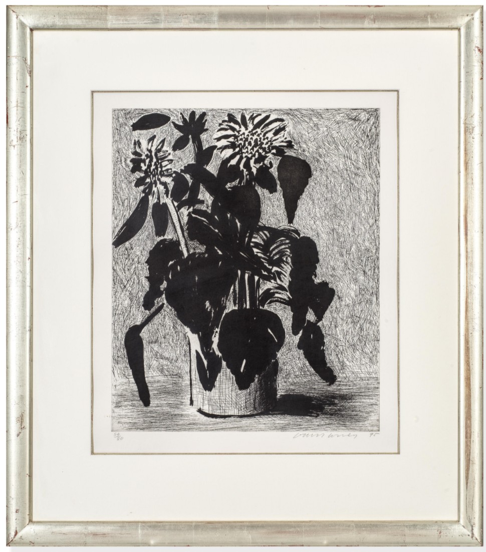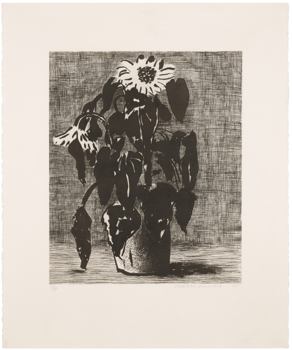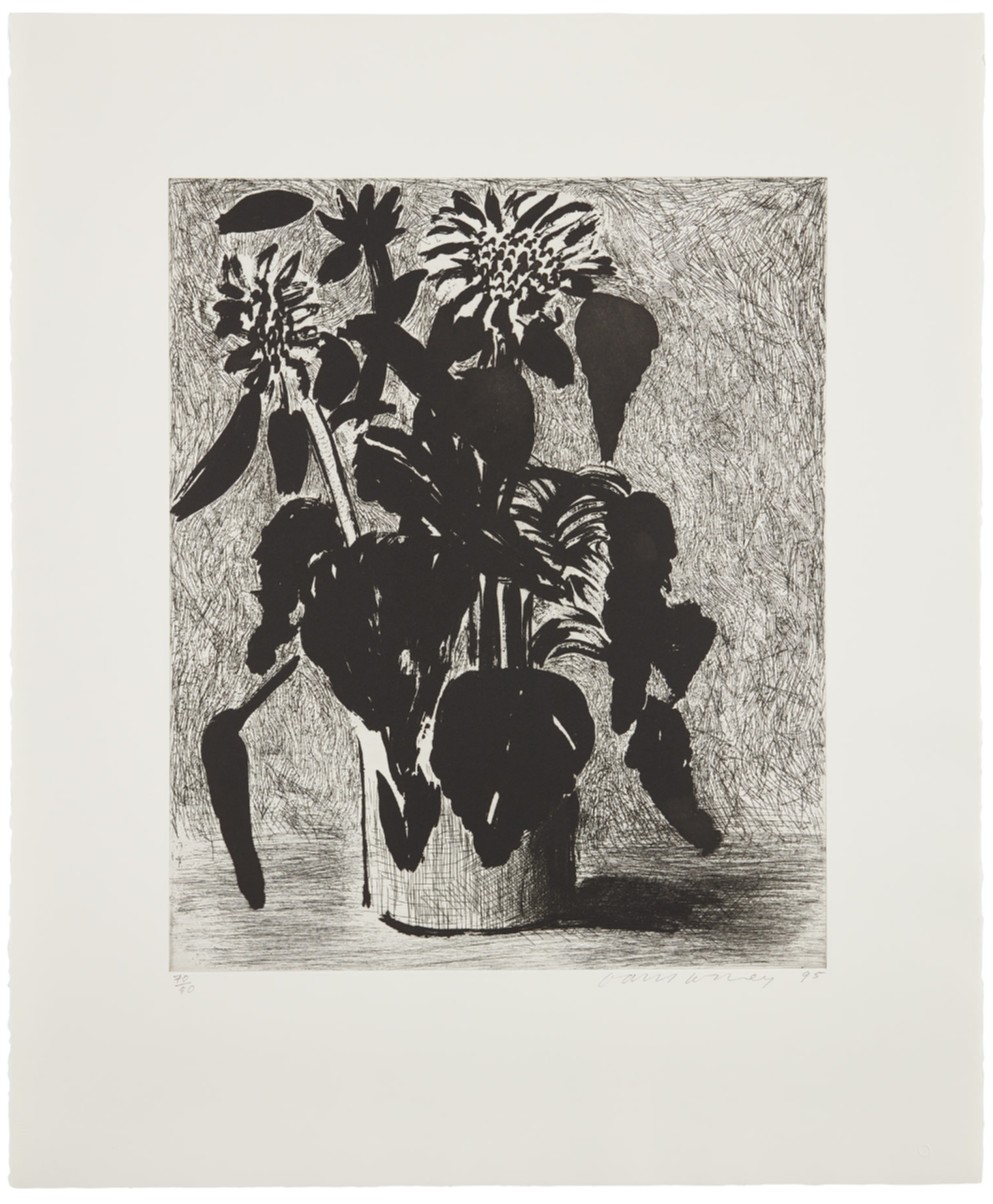 Sunflowers embody the transience of life, and this etching captures that theme through the contrast between two large sunflowers in full bloom against the surrounding ripening buds, set within dense foliage. Hockney’s use of rich aquatint in the stems and leaves of the flowers, set against the light grain of the wall and surface, emphasizes their sturdiness and sense of weight.