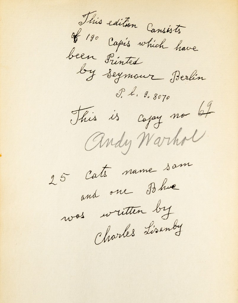 Signed ‘Andy Warhol’ by the artist’s mother and dedicated ‘Bradbury Thompson’ in blue ball-point pen Numbered 8 of 190 on the colophon, with the original buckram boards