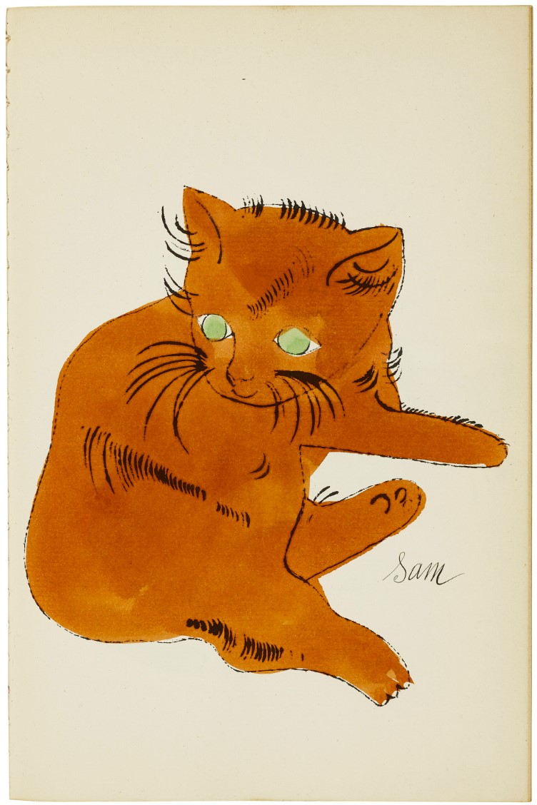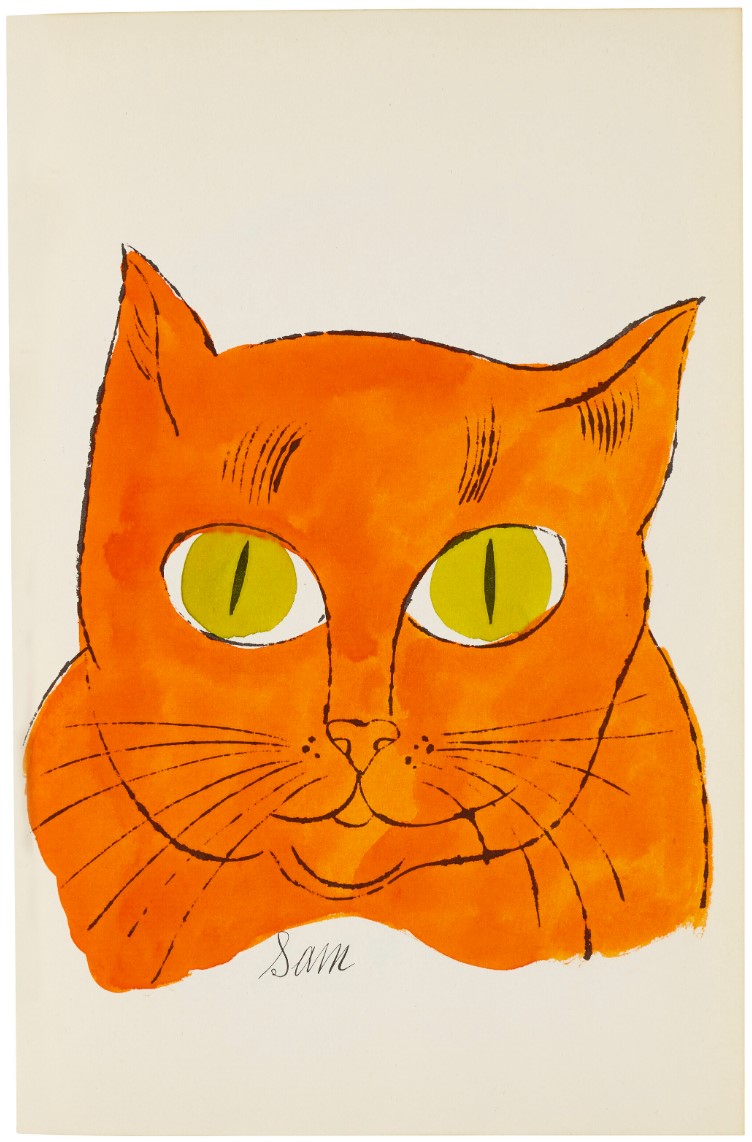 Published in 1954, 25 Cats Named Sam and One Blue Pussy is one of the earliest and most charming artistic projects created by Andy Warhol before his rise as the central figure of Pop Art. The work takes the form of a small illustrated artist’s book containing hand-colored lithographs of cats, each accompanied by playful calligraphic lettering. Despite the title, the book actually presents sixteen cats rather than twenty-five, each humorously identified as “Sam.” The final image depicts a distinctive blue-colored cat, referenced by the cheeky phrase “one blue pussy.” This whimsical discrepancy between title and content reflects Warhol’s early sense of irony and playful subversion of expectations.