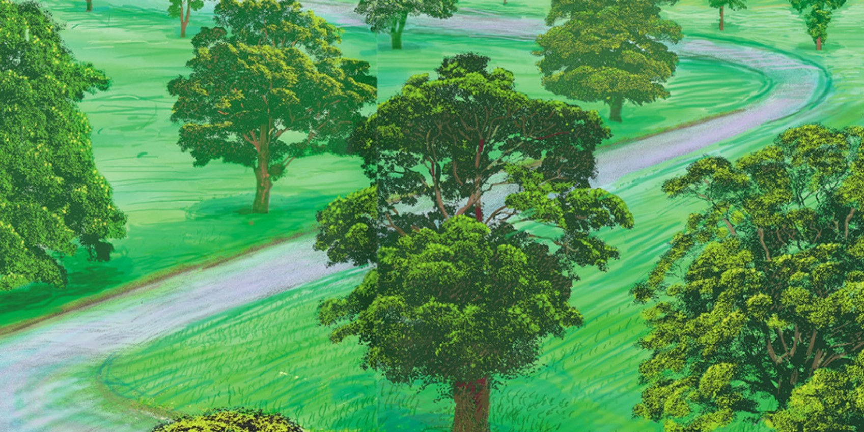 Embracing the nuance of the often-nondescript landscapes around him, Hockney found the perfect subject with which he could continue his preoccupation with how we see the world around us, and how that can be accurately translated into an image. In the early 1980’s Hockney made composite pictures called ‘joiners’ from numerous Polaroid snaps re-arranged as a mosaic to form a new whole. His aim was to overcome the Cyclopean view of a singe photograph and the discrepancy between how we see and experience the three-dimensional world in space, volume and time, and how to translate that vision into a two-dimensional image. To try and answer this question in relation to his Yorkshire landscapes, Hockney began experimenting with computer drawings, using Quantel paintbox and later photoshop to create quick and spontaneous ‘brushstrokes’ using a stylus, which he could collage with photographic imagery. In A Bigger Green Valley, the resulting contrast of the hyperreal and the primitive, nostalgically soft mark-making creates a jarring vibration between our lived visual experience, and our knowledge and memory of traditional landscape painting. We have seen landscapes with our own eyes, we have seen landscape paintings, and we have seen photographs of landscapes, but somehow through combining these versions of landscapes, Hockney creates something new. He revitalizes what we thought was familiar and proves that even such a traditional genre as landscape panting can be ripe for innovation.