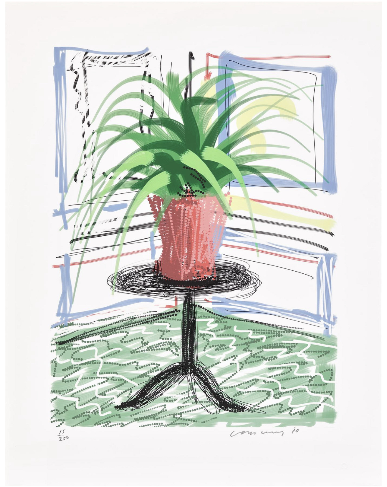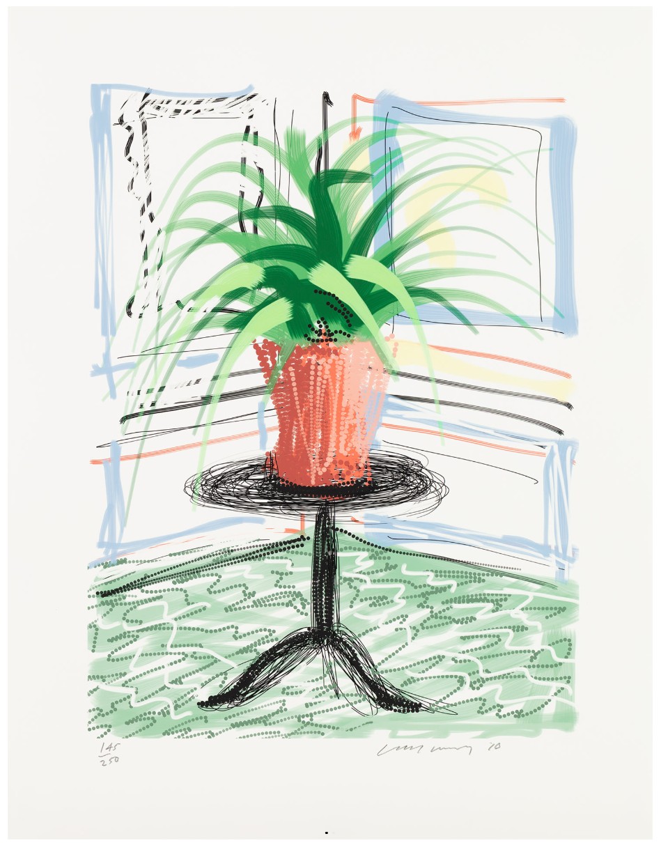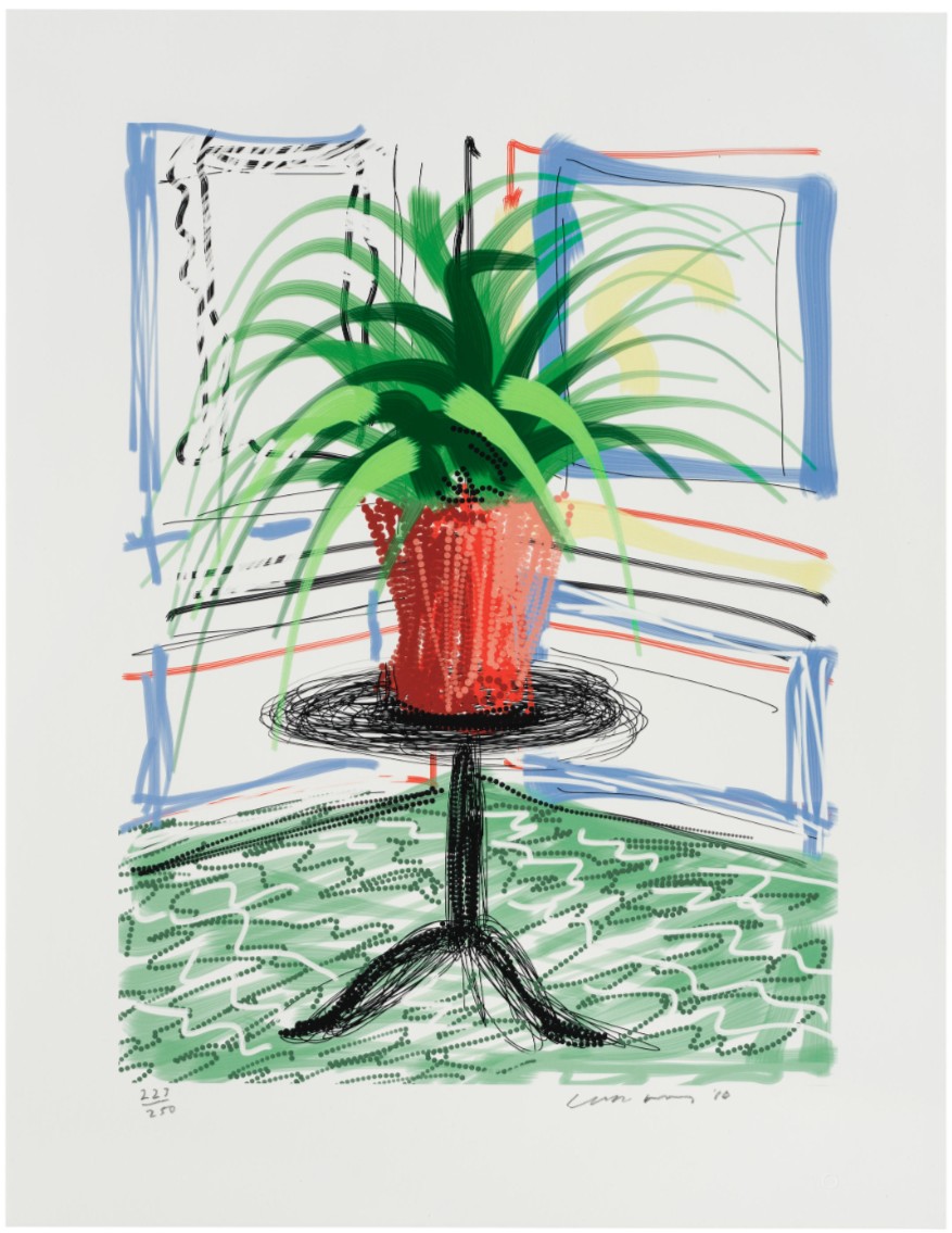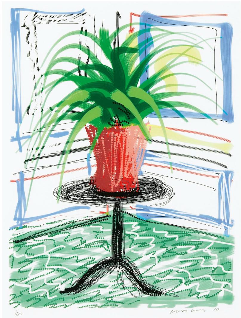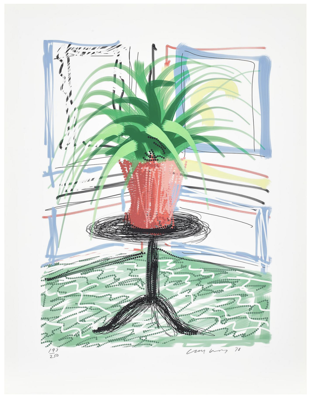 Hockney draws each of the plant’s drooping leaves in one bold, expressive stroke, bursting with energy against the rigidity of the suggested walled interior. Color is used to connect the plant pot with its domestic environment, the ordinary plant pot almost becoming part of the furniture.