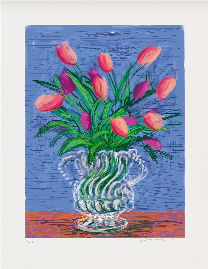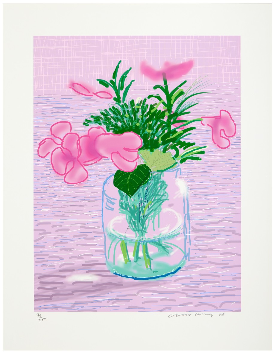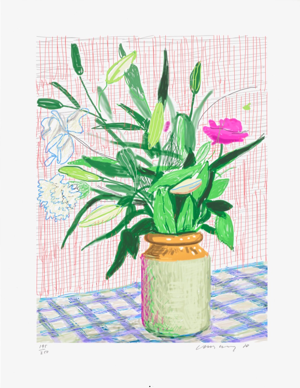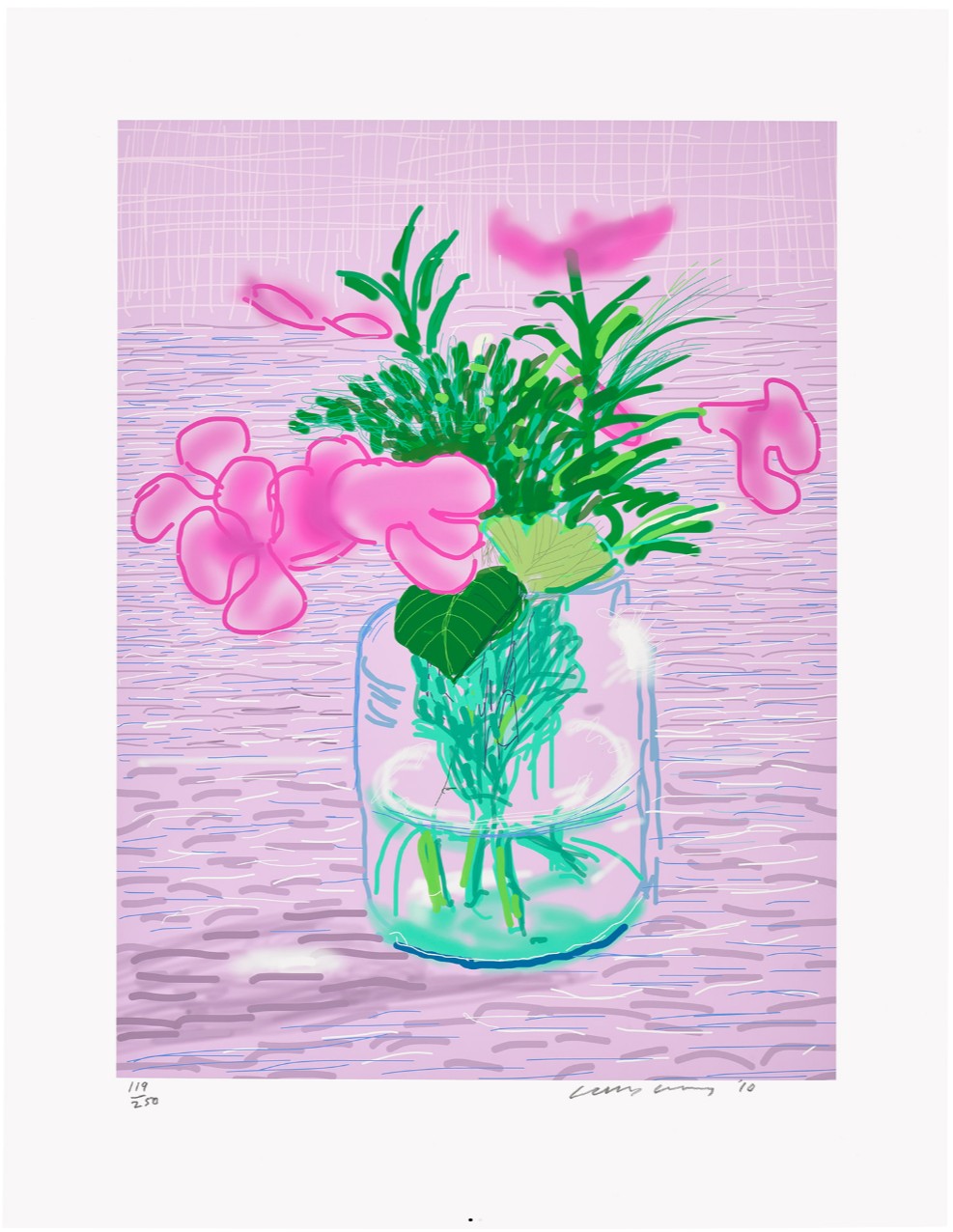 Hockney mimics traditional brushwork without attempting to replace it; his mark making is both painterly and proudly digital. Through placing his work in direct conversation with the art historical still life, Hockney resists the hierarchy of traditional mediums such as oil paint and demonstrates the equally expressive fluidity of modern digital line.