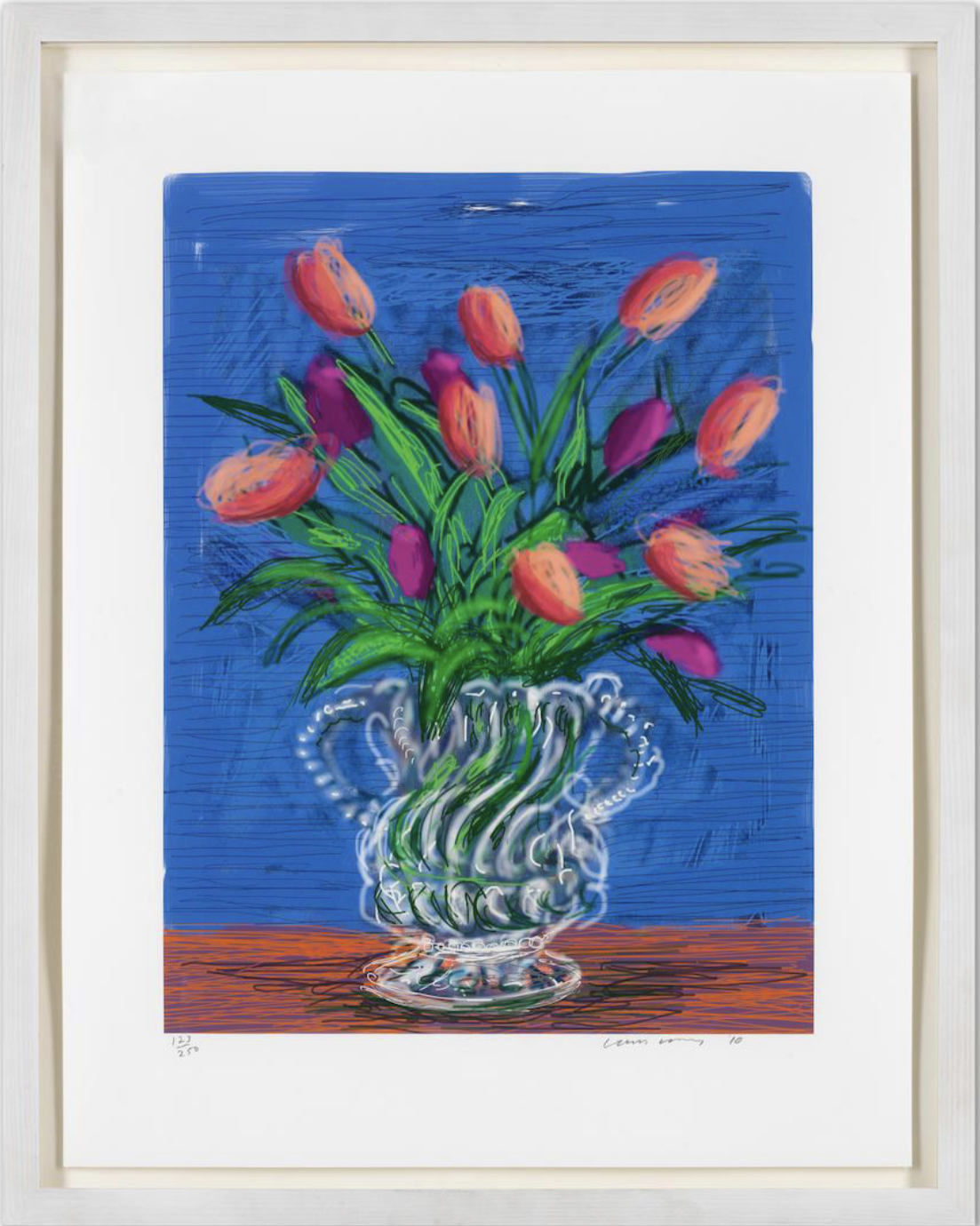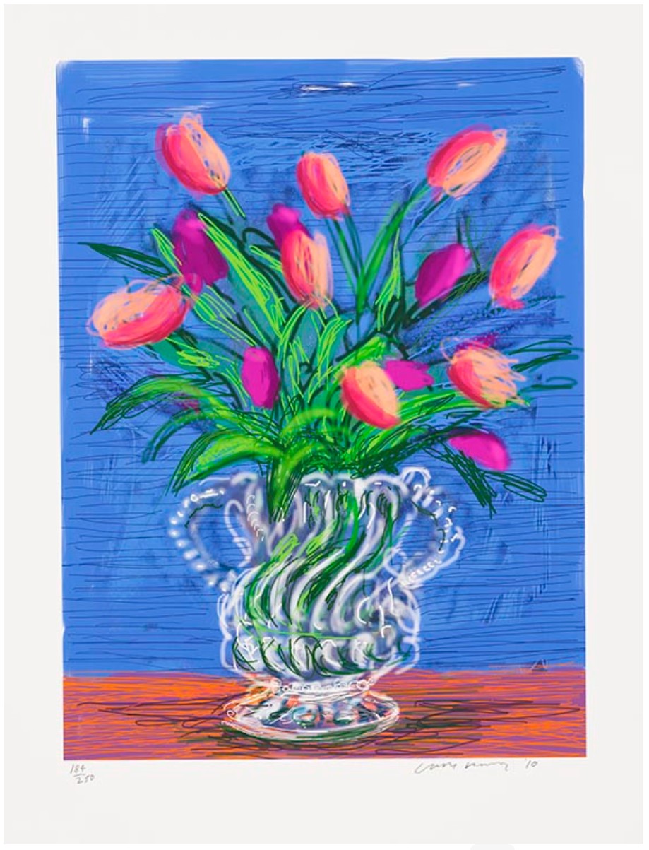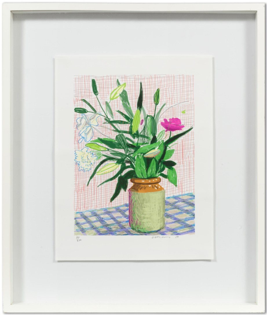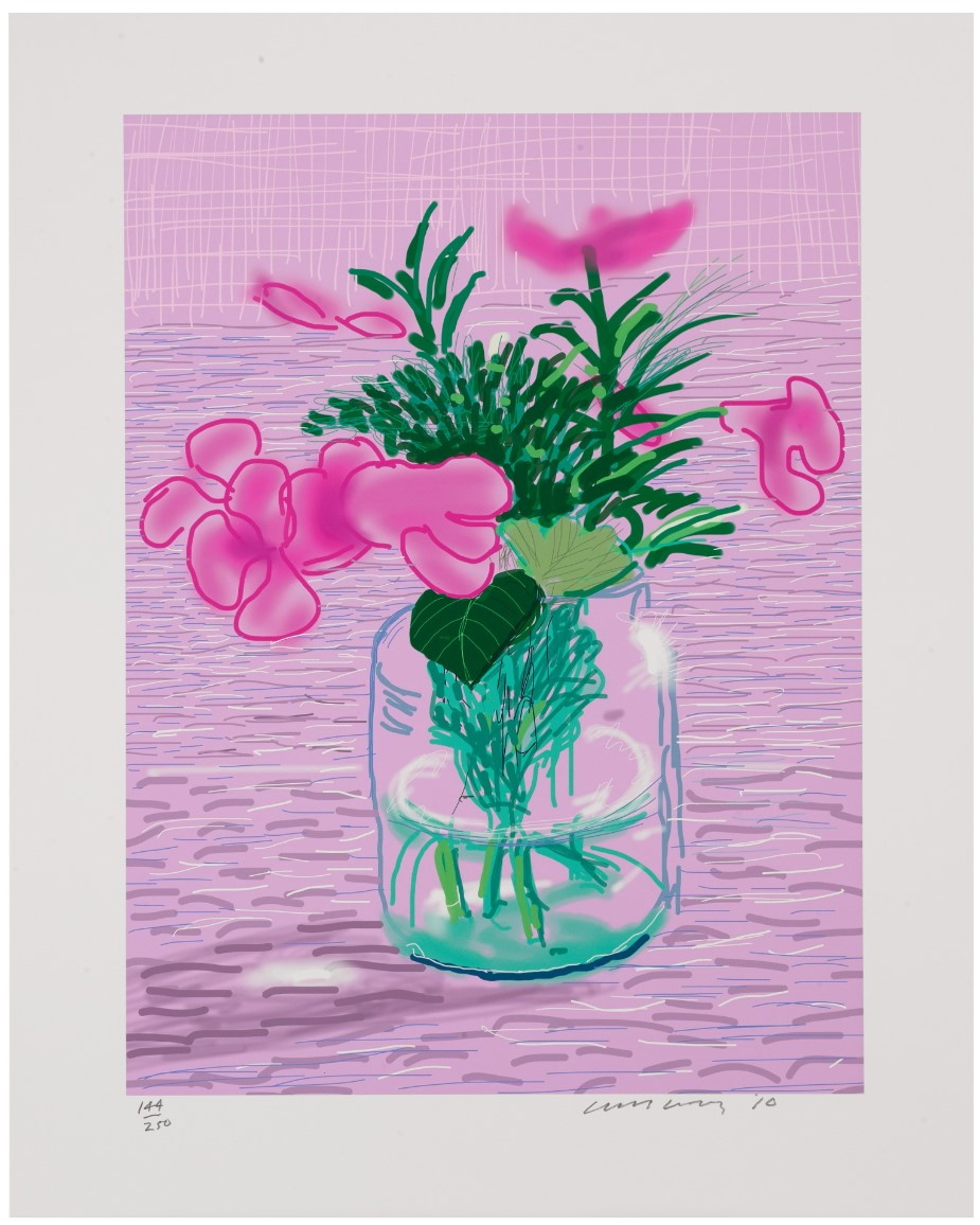 Hockney mimics traditional brushwork without attempting to replace it; his mark making is both painterly and proudly digital. Through placing his work in direct conversation with the art historical still life, Hockney resists the hierarchy of traditional mediums such as oil paint and demonstrates the equally expressive fluidity of modern digital line.