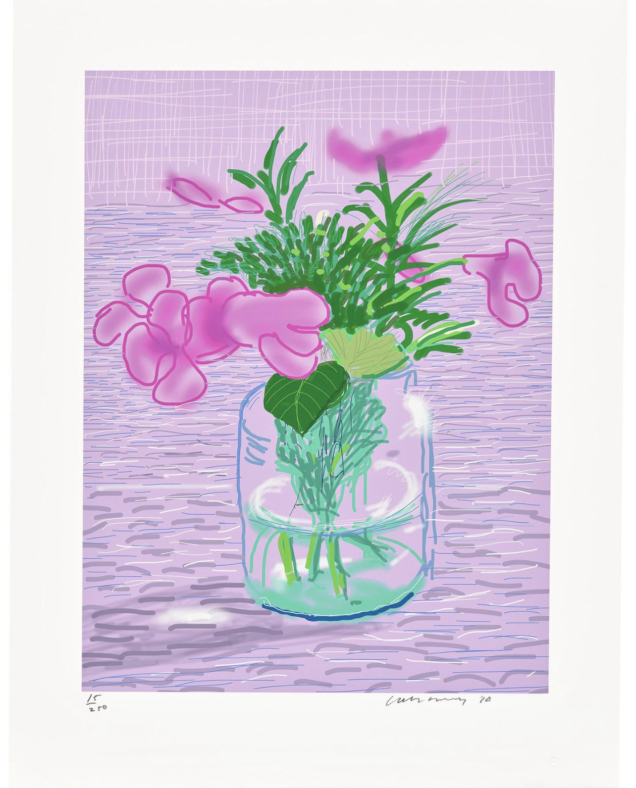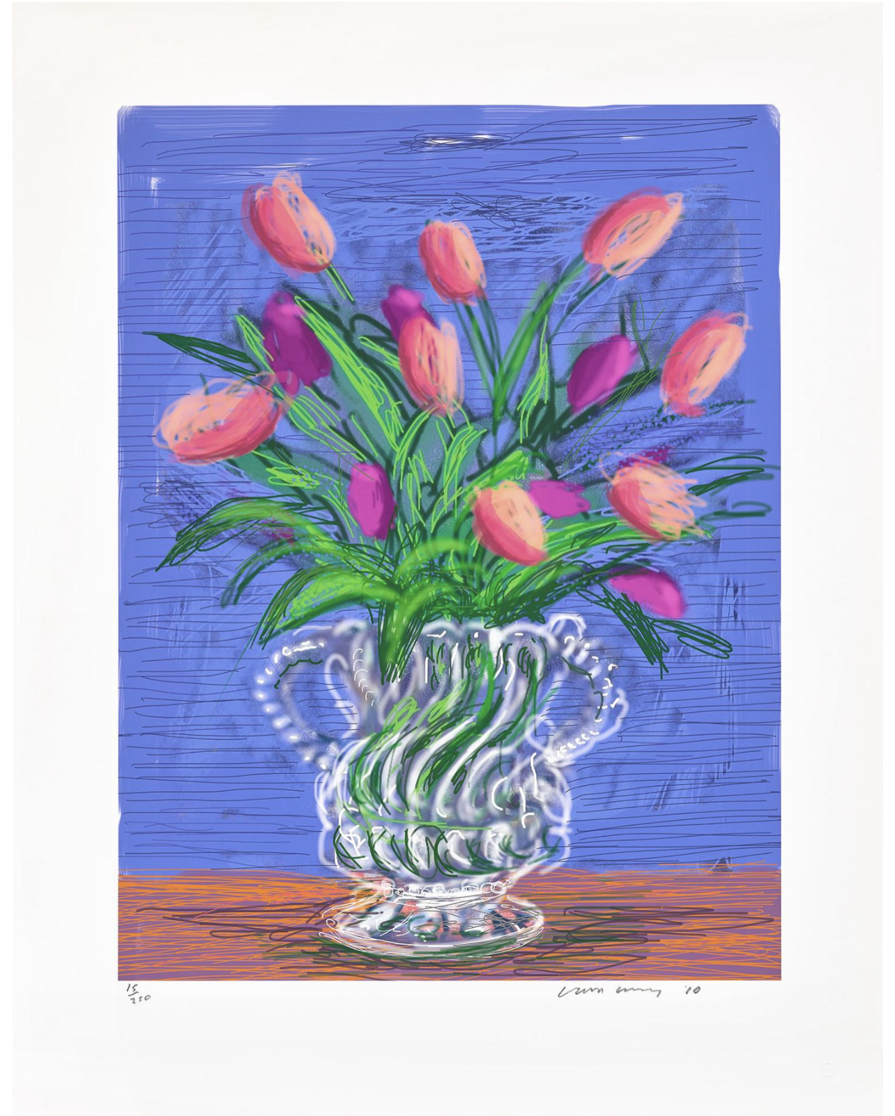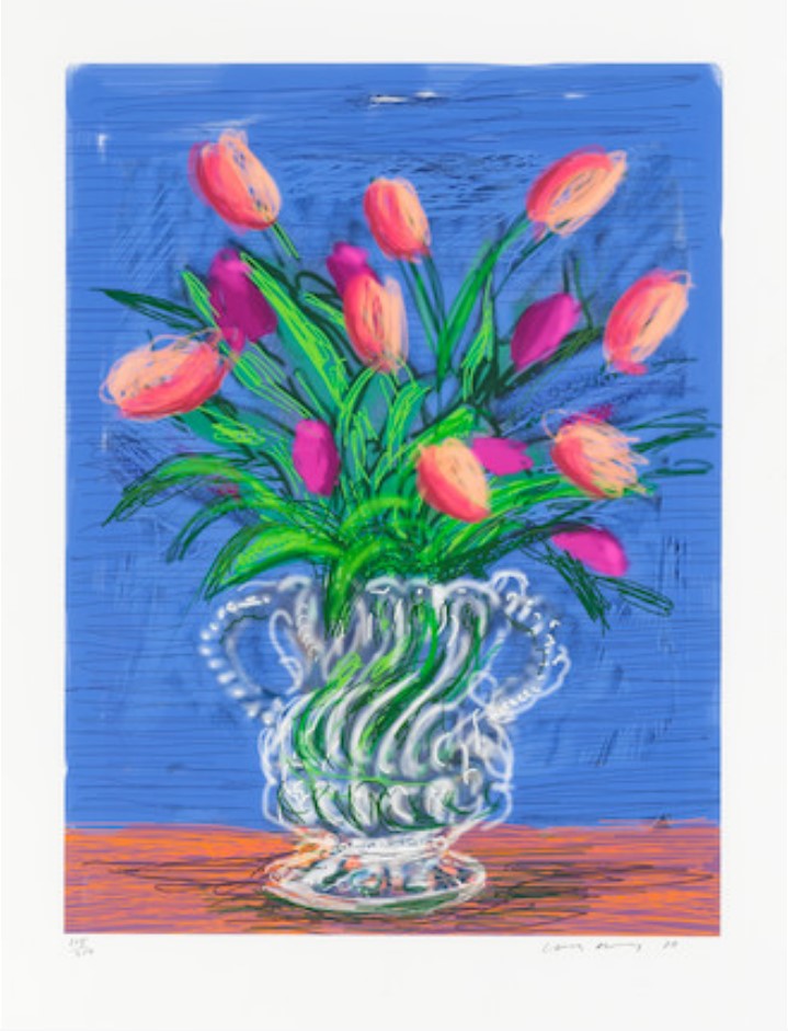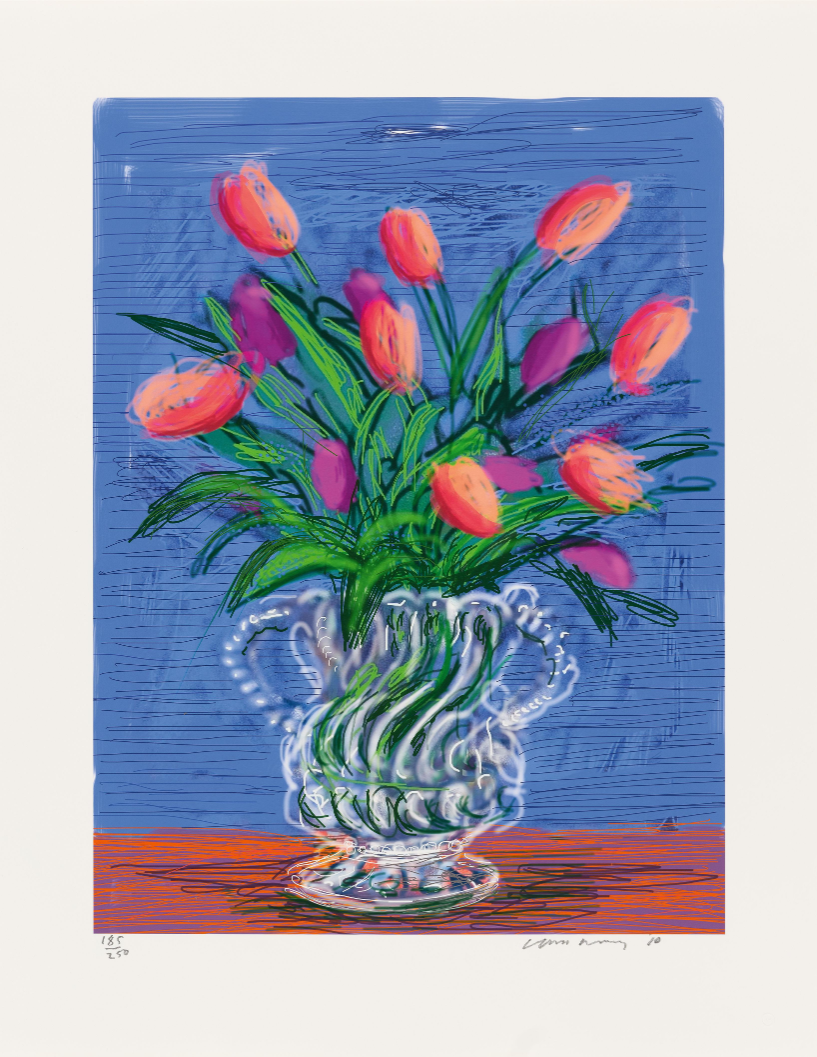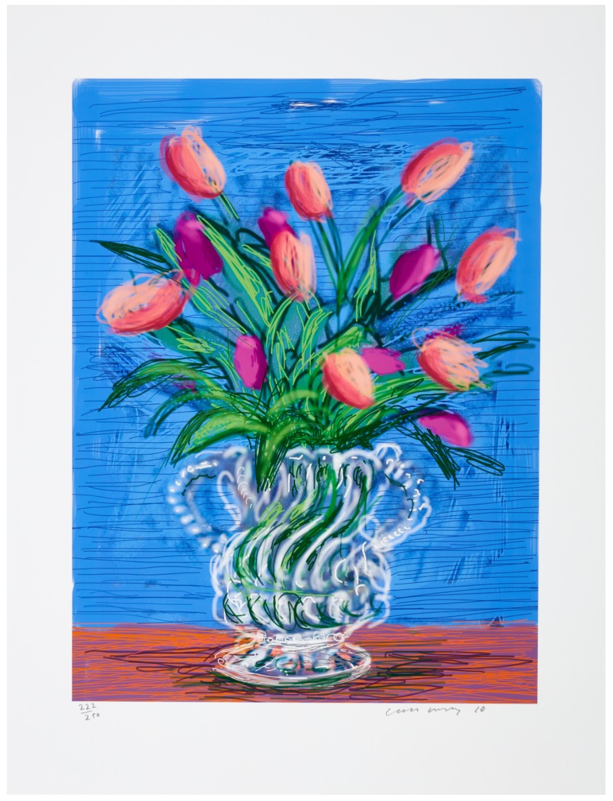 Hockney mimics traditional brushwork without attempting to replace it; his mark making is both painterly and proudly digital. Through placing his work in direct conversation with the art historical still life, Hockney resists the hierarchy of traditional mediums such as oil paint and demonstrates the equally expressive fluidity of modern digital line.