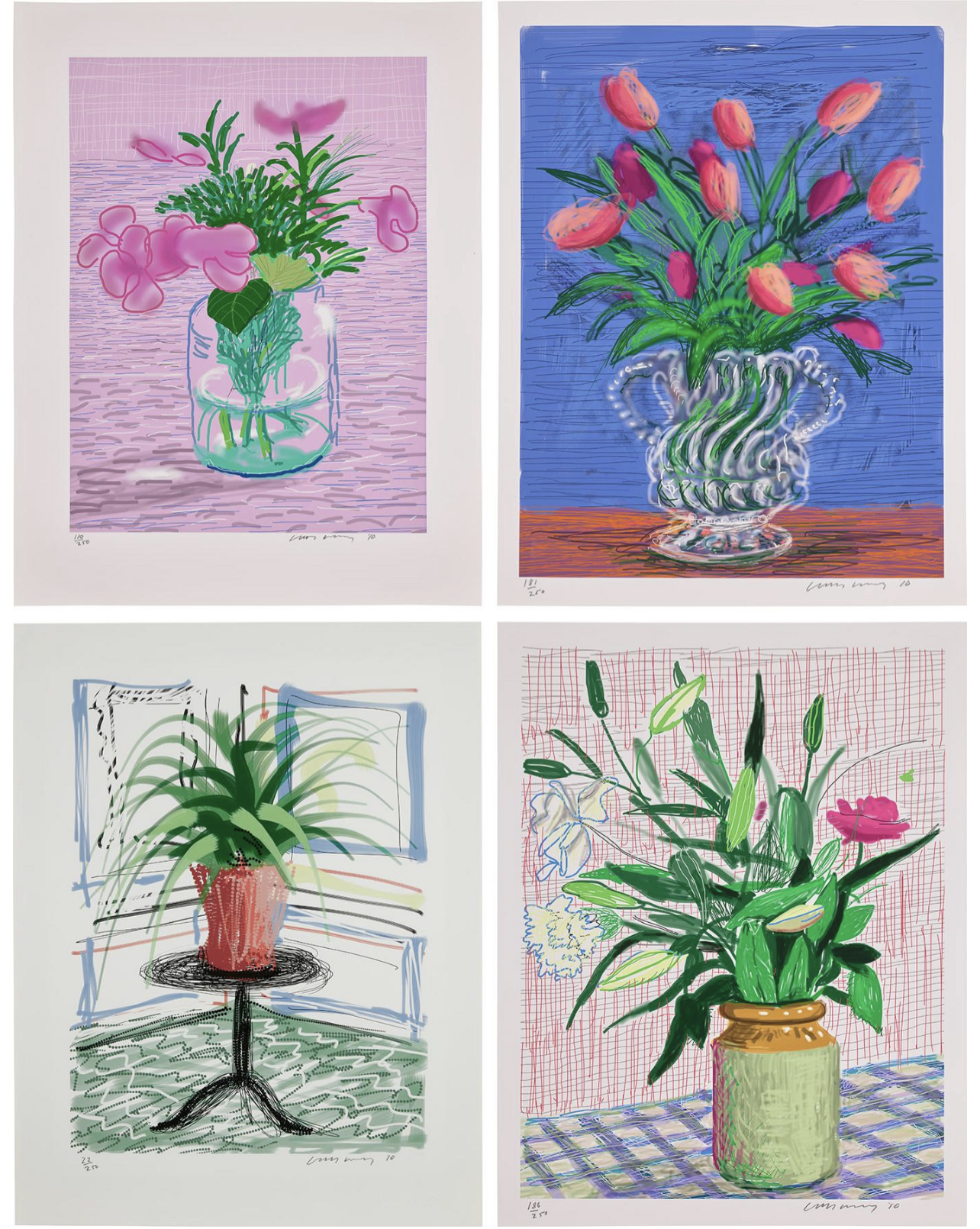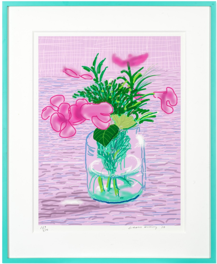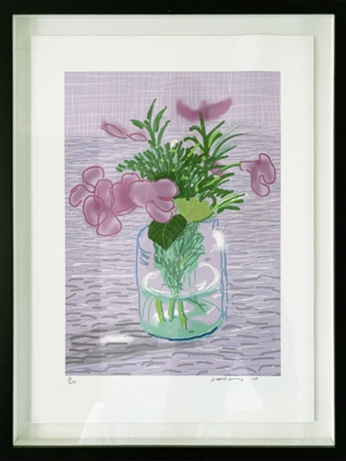 The digital is often synonymous with the artificial, but in Hockney’s hands it becomes vibrant life. The portable nature of the iPad affords Hockney’s drawings a palpable immediacy: a modern twist on impressionistic en plein air painting. Hockney places his work in conversation with art historical traditional still life, and in doing so demonstrates the digital to possess an equally gestural and spontaneous fluidity of line.