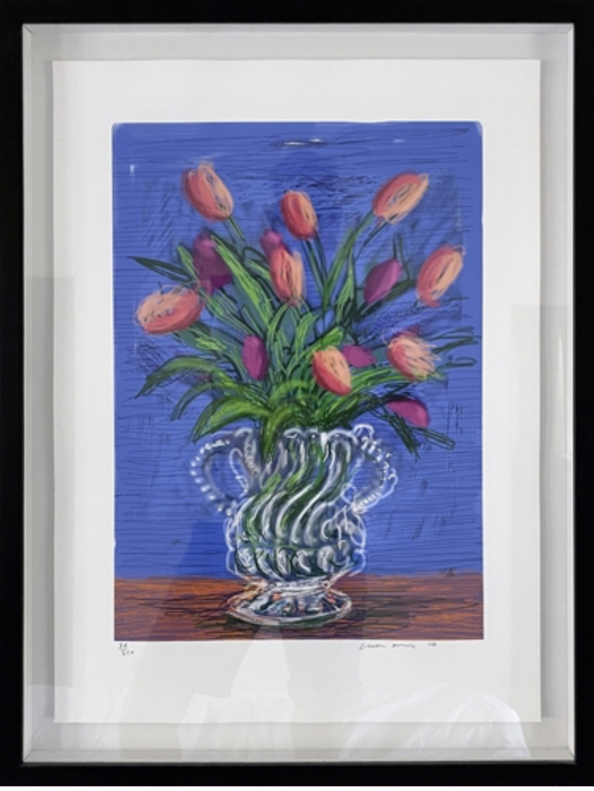 The centrally positioned bouquet is a subject of close observation, with Hockney using a range of greens and pinks to capture its likeness. Paying close attention to perspective, Hockney depicts the stems of the tulips twisting in line with the swirling design of the opaque glass vase, creating a harmonious affinity between the inanimate and living.