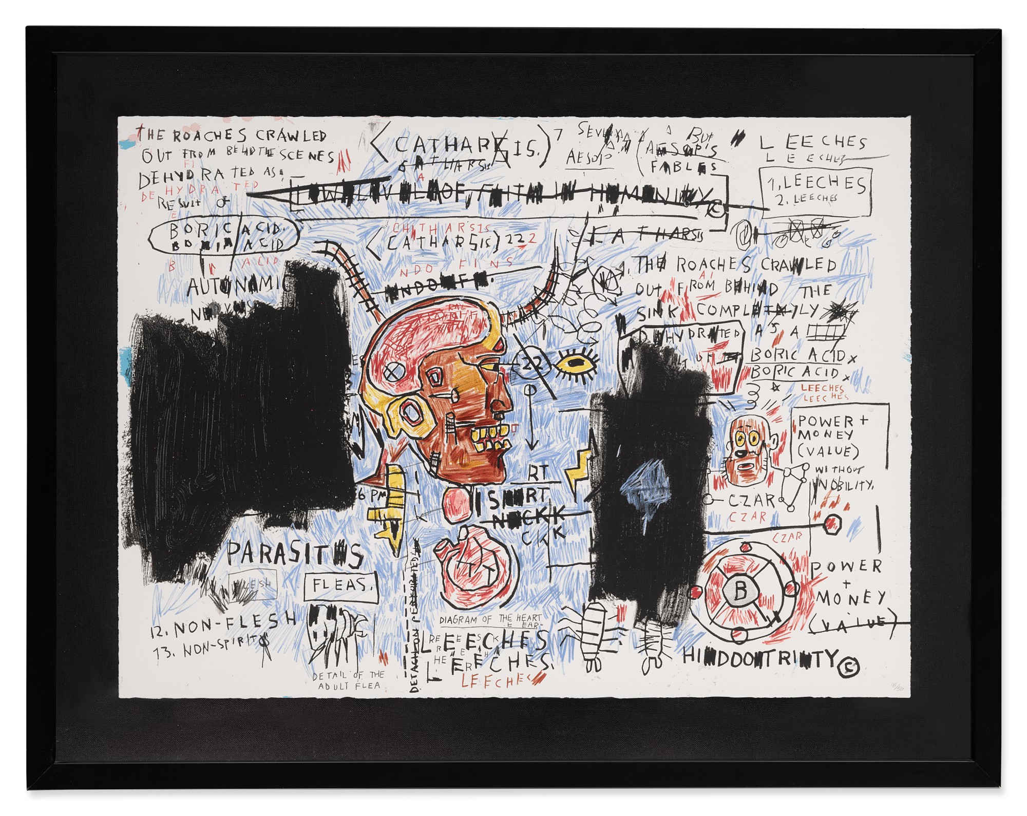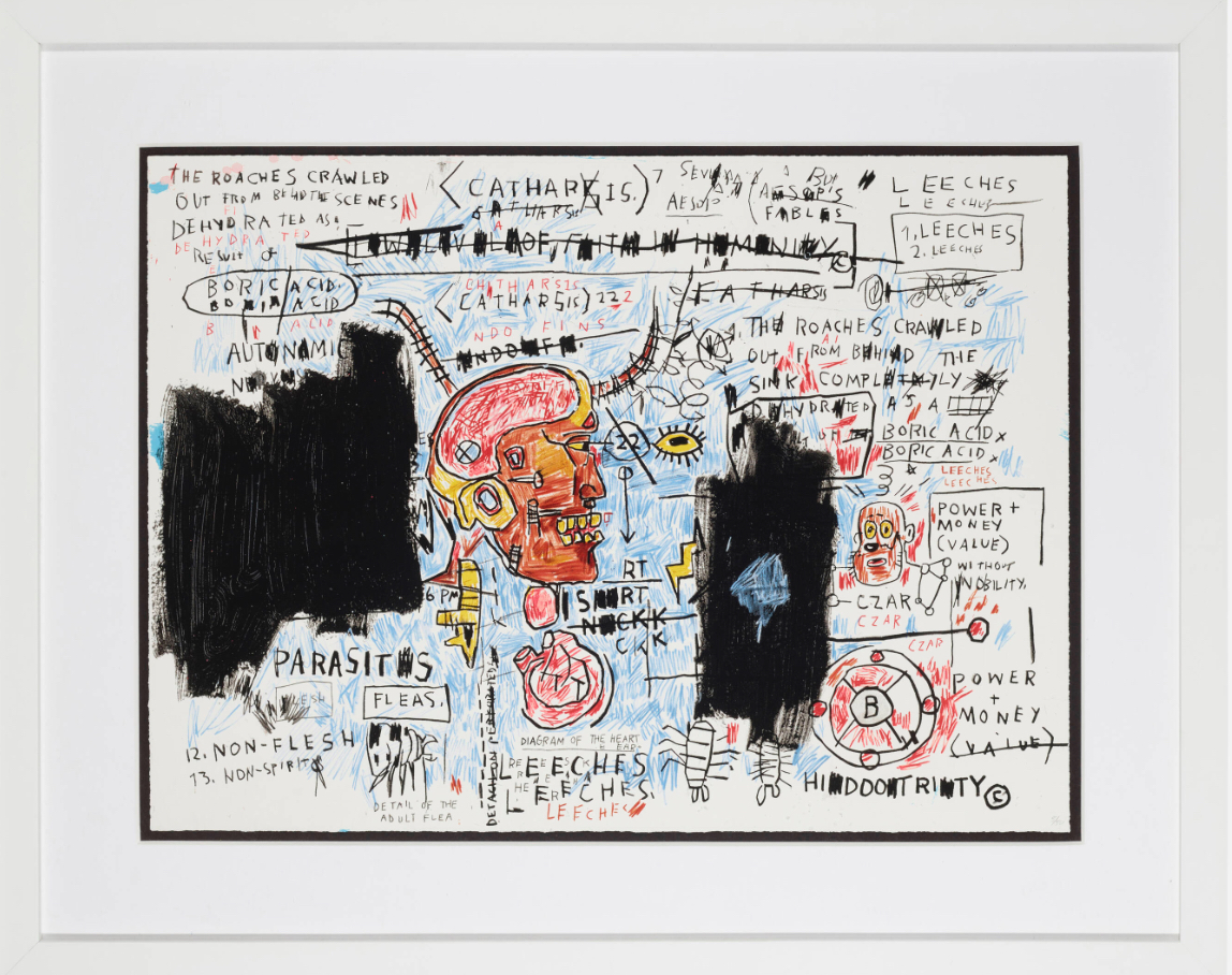 In Leeches, pests of various kinds, including ‘parasites’, ‘fleas’ and ‘roaches’ materialize across the image in the form of both text and image, competing against swathes of black and semi-human skulls appearing to bear nuts and bolts. The repeated references to insects and parasites clash against text reading ‘Boric acid’, a widely used insecticide. There is the suggestion of an irrepressible animalistic force emerging from obscurity which is confronted by forces of sterilization and decontamination. Alongside this is the sense of a destabilizing of accepted hierarchies, as suggested by ‘Power and money (value) without nobility’. In the visual universe constructed by Basquiat, martyrdom and nobility is inherited by the people of the street, not those born into family dynasties; Basquiat himself remarked that his art is about “kings, heroes, and the street”, acknowledging his reimagining of what it means to be noble.