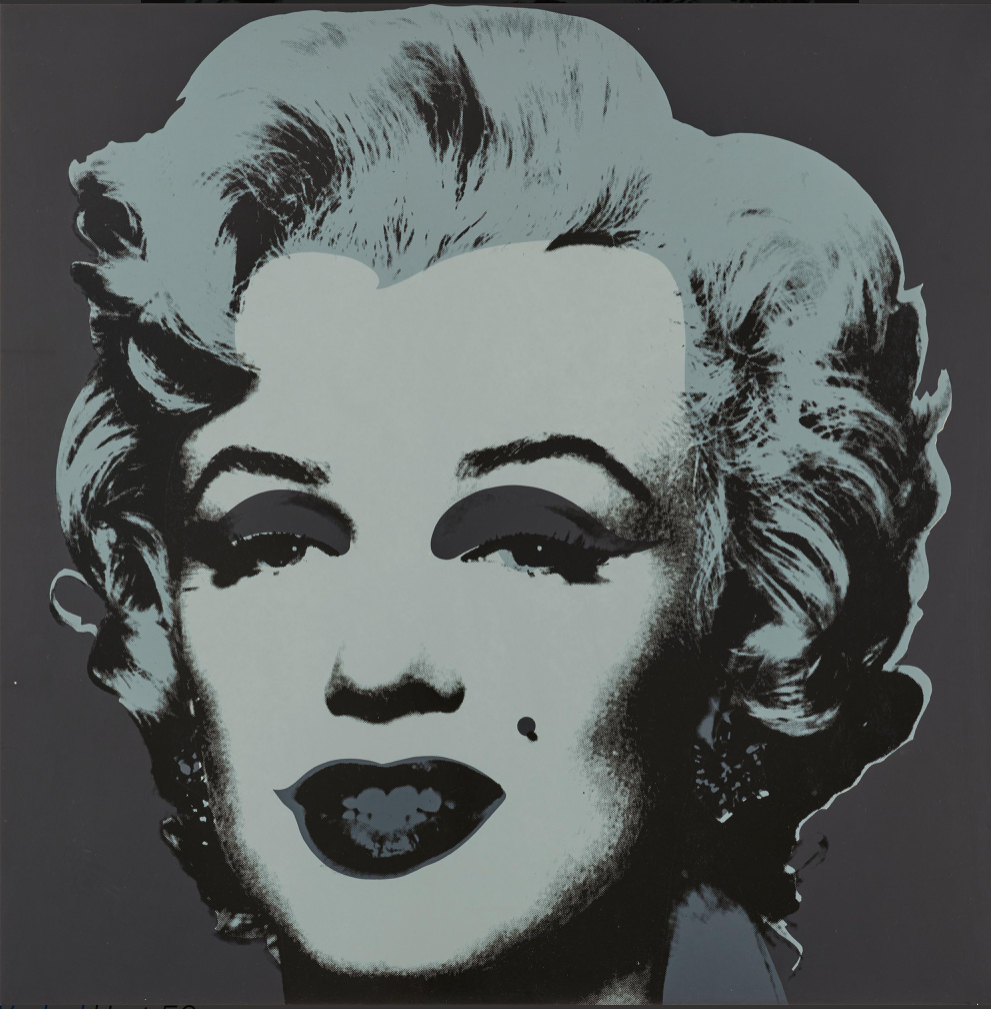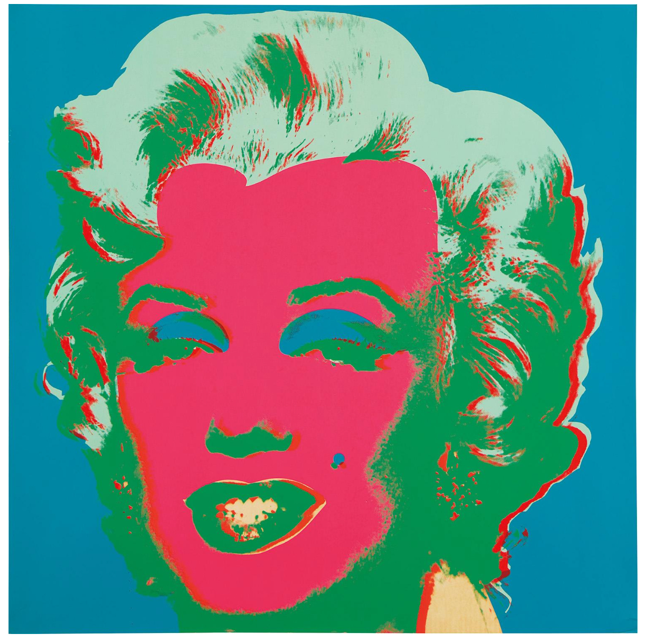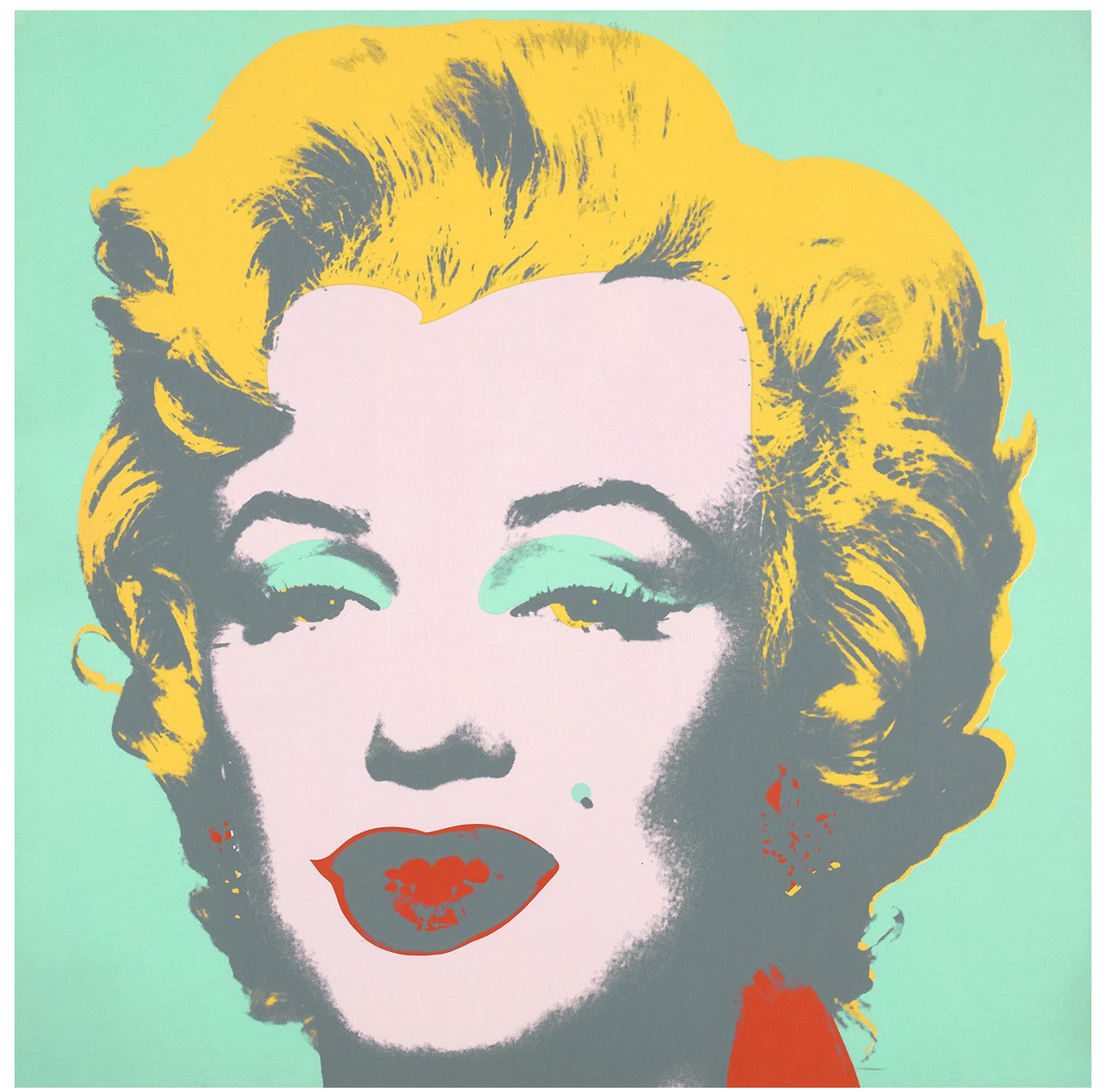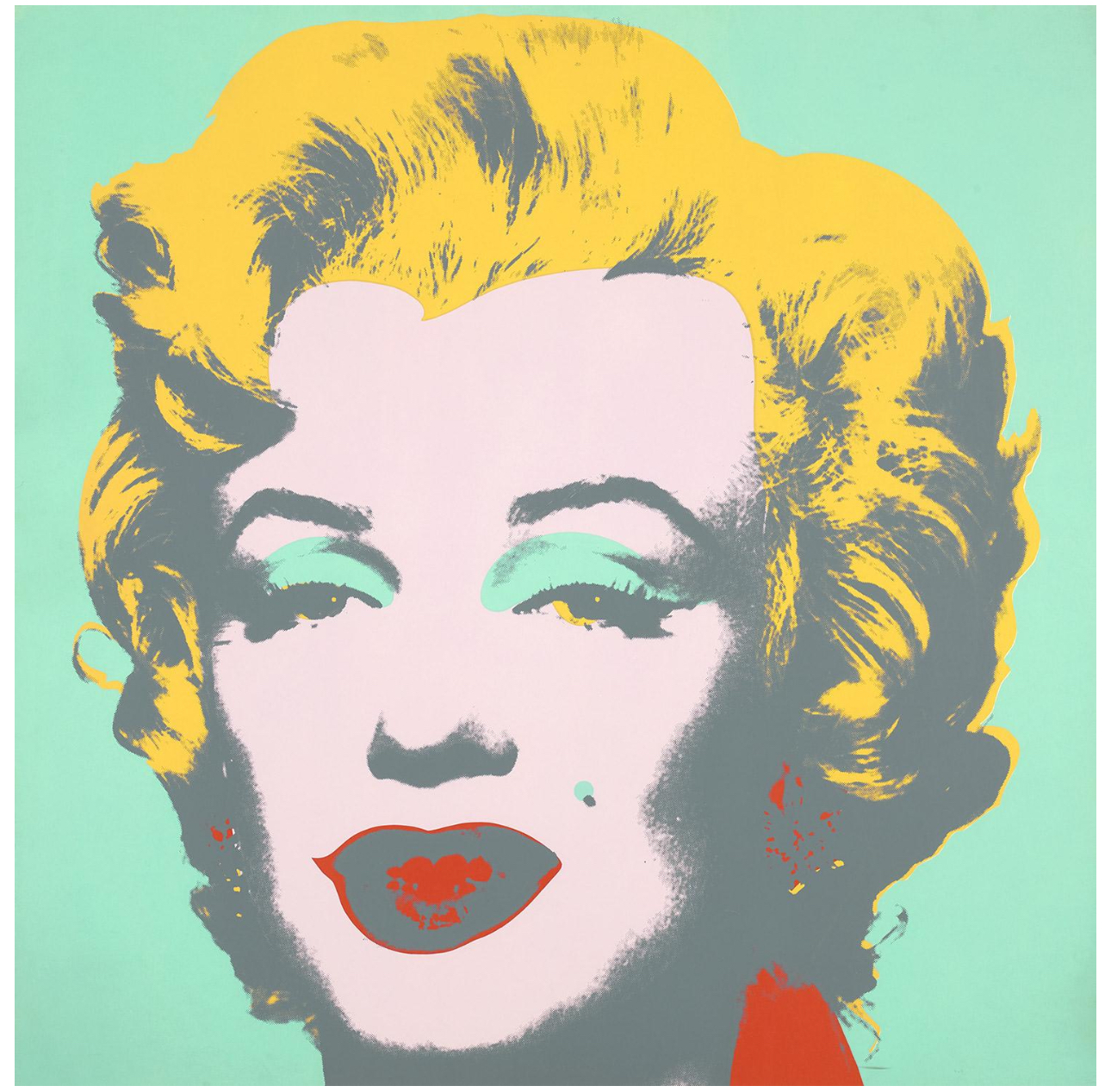 For Andy Warhol, Marilyn Monroe was the perfect interplay of personal tragedy and beauty. The world was captivated by the actress; newspapers provided access to her life through a steady stream of front-page articles and black and white photos. Indeed, Monroe possessed a tragic romance balanced with a striking naivete that gave her a magnetic pull. Warhol’s Marilyn Monroe (Marilyn) captures a juxtaposition of allure and sadness that characterized the life of the actress; the Technicolor wash over the black and white structure of her visage is applied as make-up, masking her true identity, yet memorializing her forever.