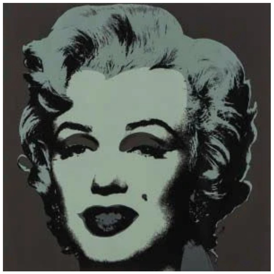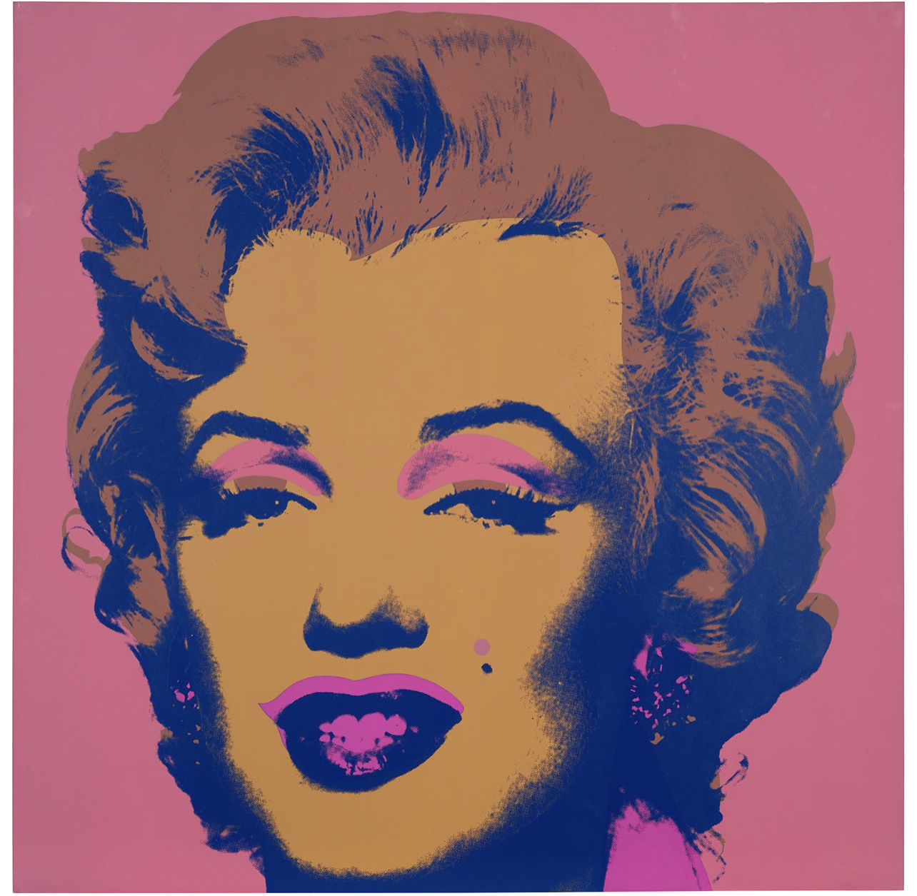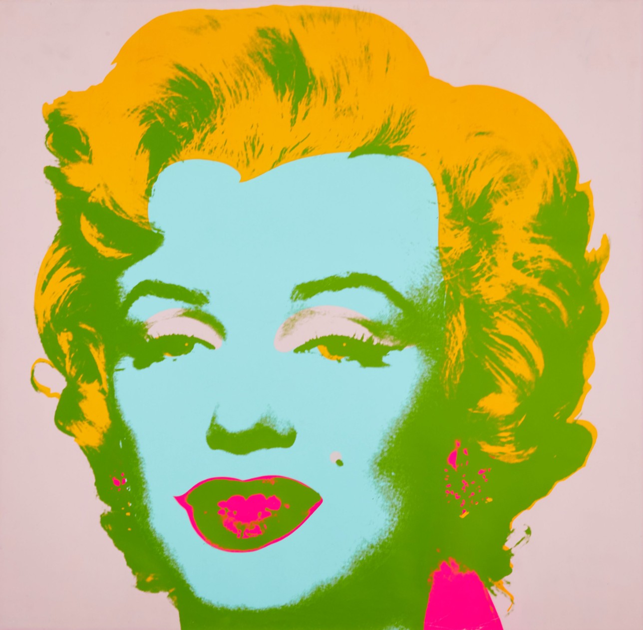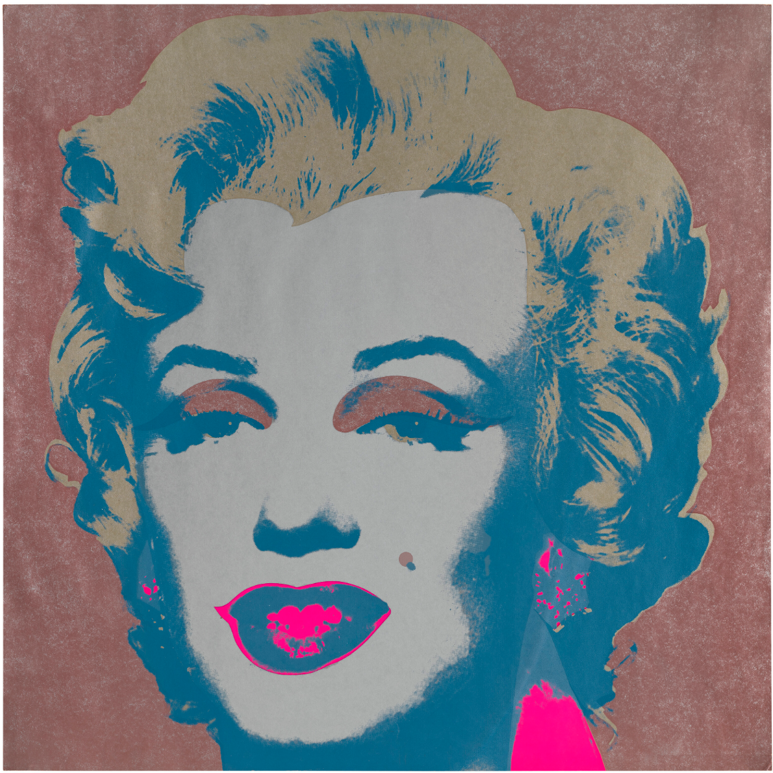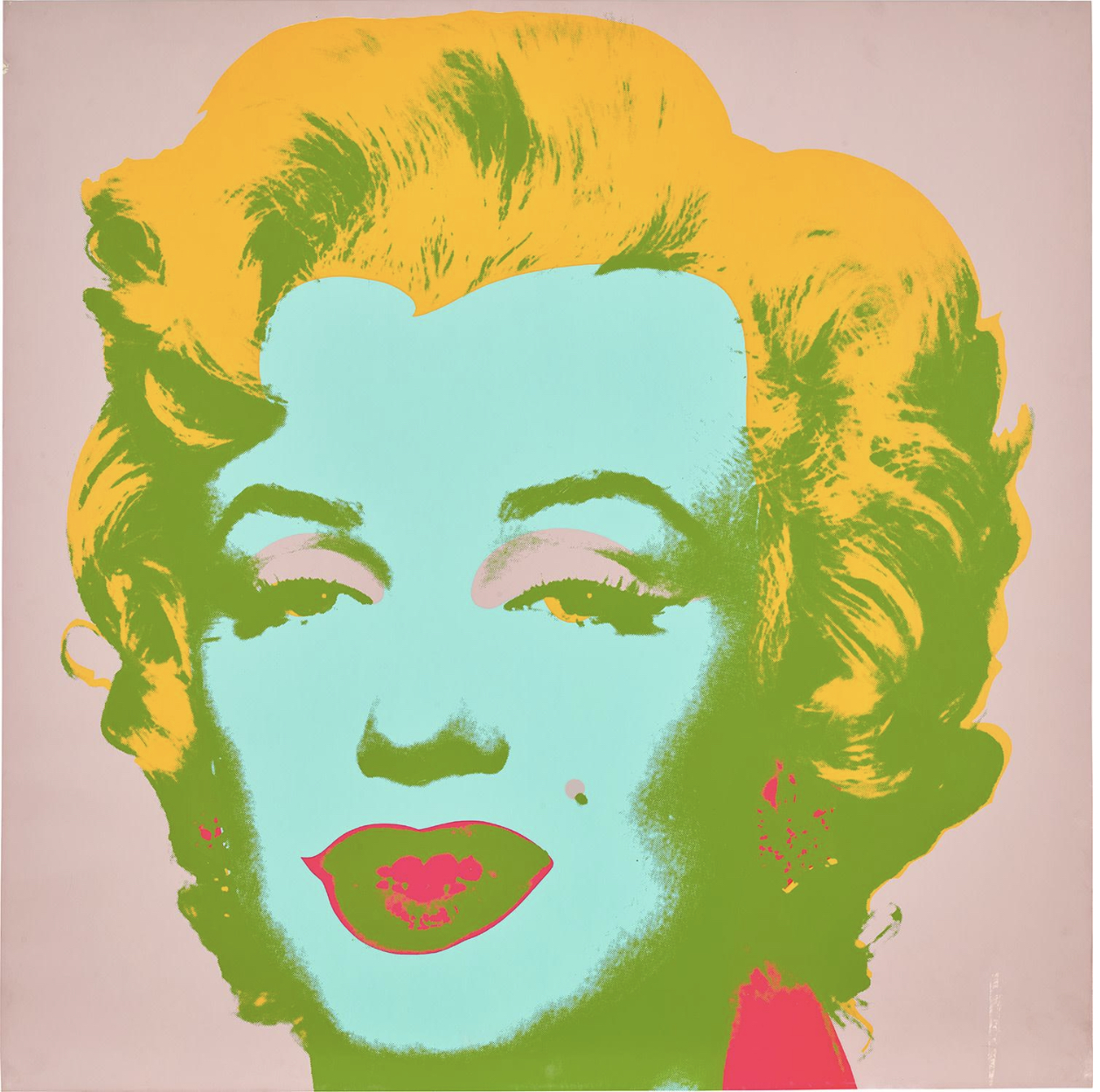 For Andy Warhol, Marilyn Monroe was the perfect interplay of personal tragedy and beauty. The world was captivated by the actress; newspapers provided access to her life through a steady stream of front-page articles and black and white photos. Indeed, Monroe possessed a tragic romance balanced with a striking naivete that gave her a magnetic pull. Warhol’s Marilyn Monroe (Marilyn) captures a juxtaposition of allure and sadness that characterized the life of the actress; the Technicolor wash over the black and white structure of her visage is applied as make-up, masking her true identity, yet memorializing her forever.
